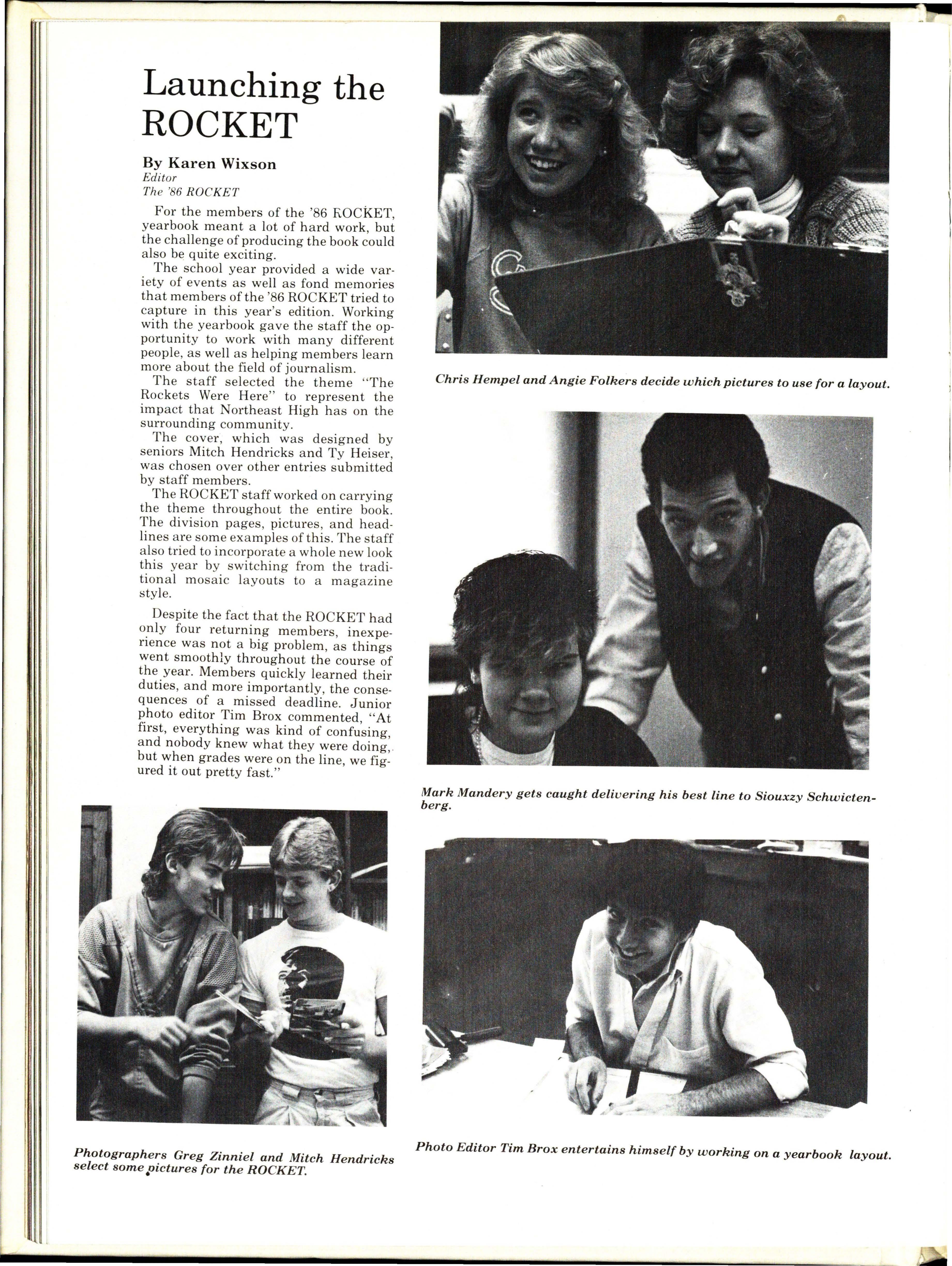 The 1986 ROCKET staff would like to thank the student body and administration of Northeast for their cooperation with our many interviews and photo sessions. Without their help, this book would not have been possible.