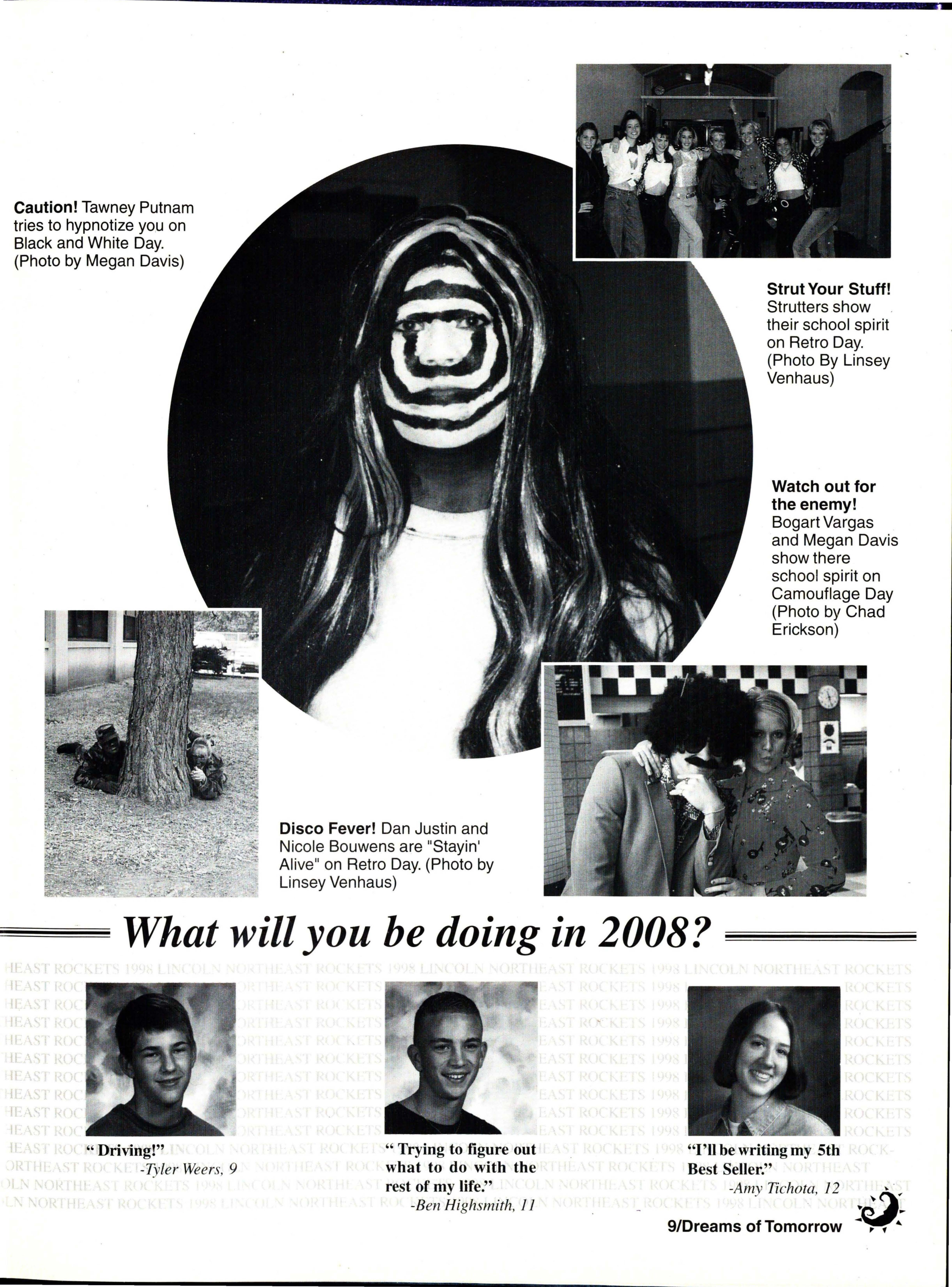 Spirit Week has been a Northeast tradition. It is the week that we all remember the goofy clothes and Rocket colors. It has always been the week before Homecoming. But, due to the end of the quarter, we only had three days to show off this year's "Spirit Week". The days chosen by the Varsity Cheerleaders for this year were Camouflage Day, Retro Day, and the ever- famous Black and White Day. Each day the person with the most spirit was awarded with free Homecoming tickets by the cheerleaders.