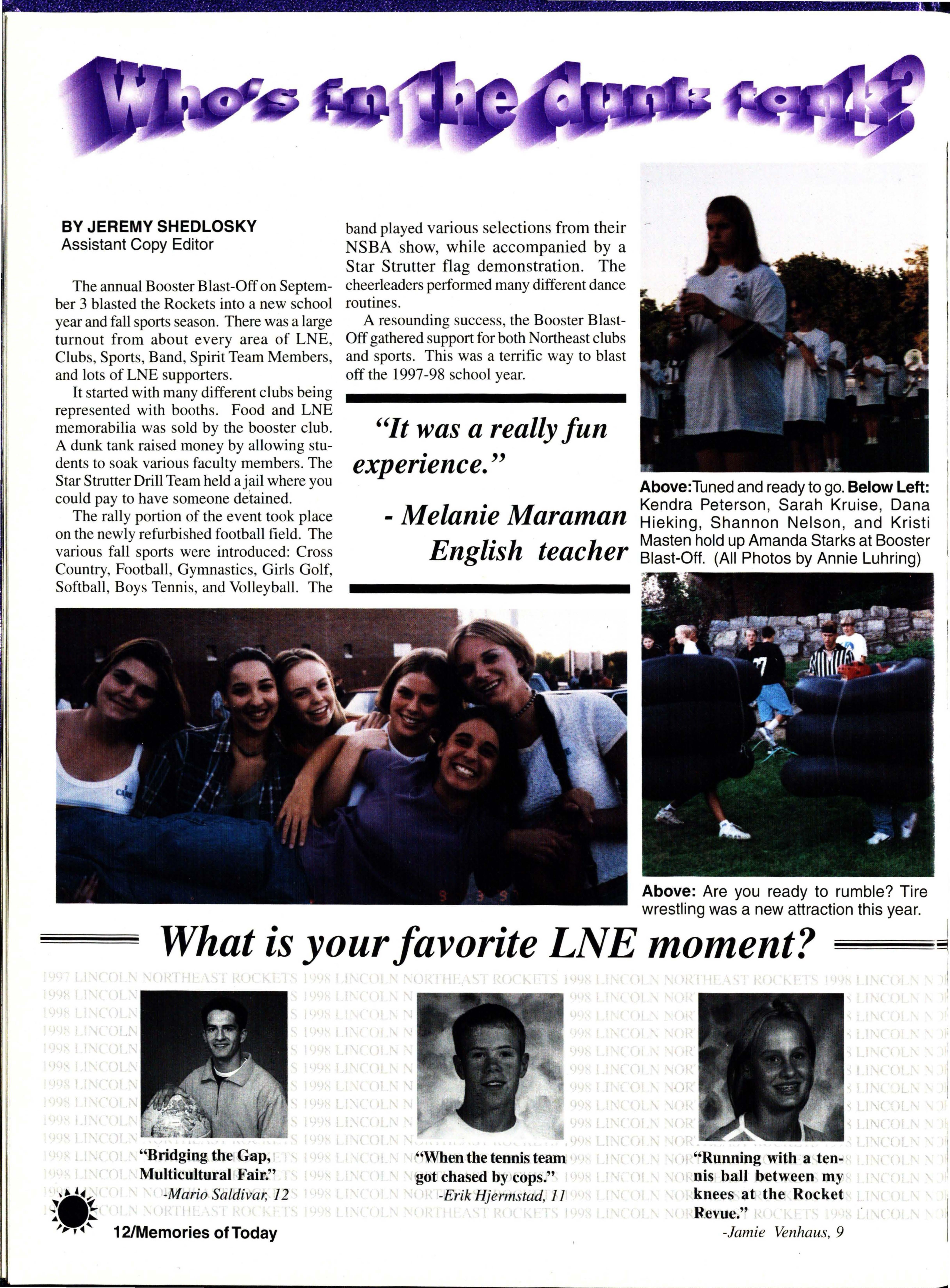 Th e annu al Boos ter Bl as t-O ff o n Se ptember 3 bl a s ted t he Roc ke ts int o a new sc hoo l year and fa ll sports seaso n. Th e re was a large turn o ut fro m a bo ut every a rea of LNE , Club s, Spo rt s, B and , Spirit Tea m M e mb ers , and lo ts of LNE s upp orters