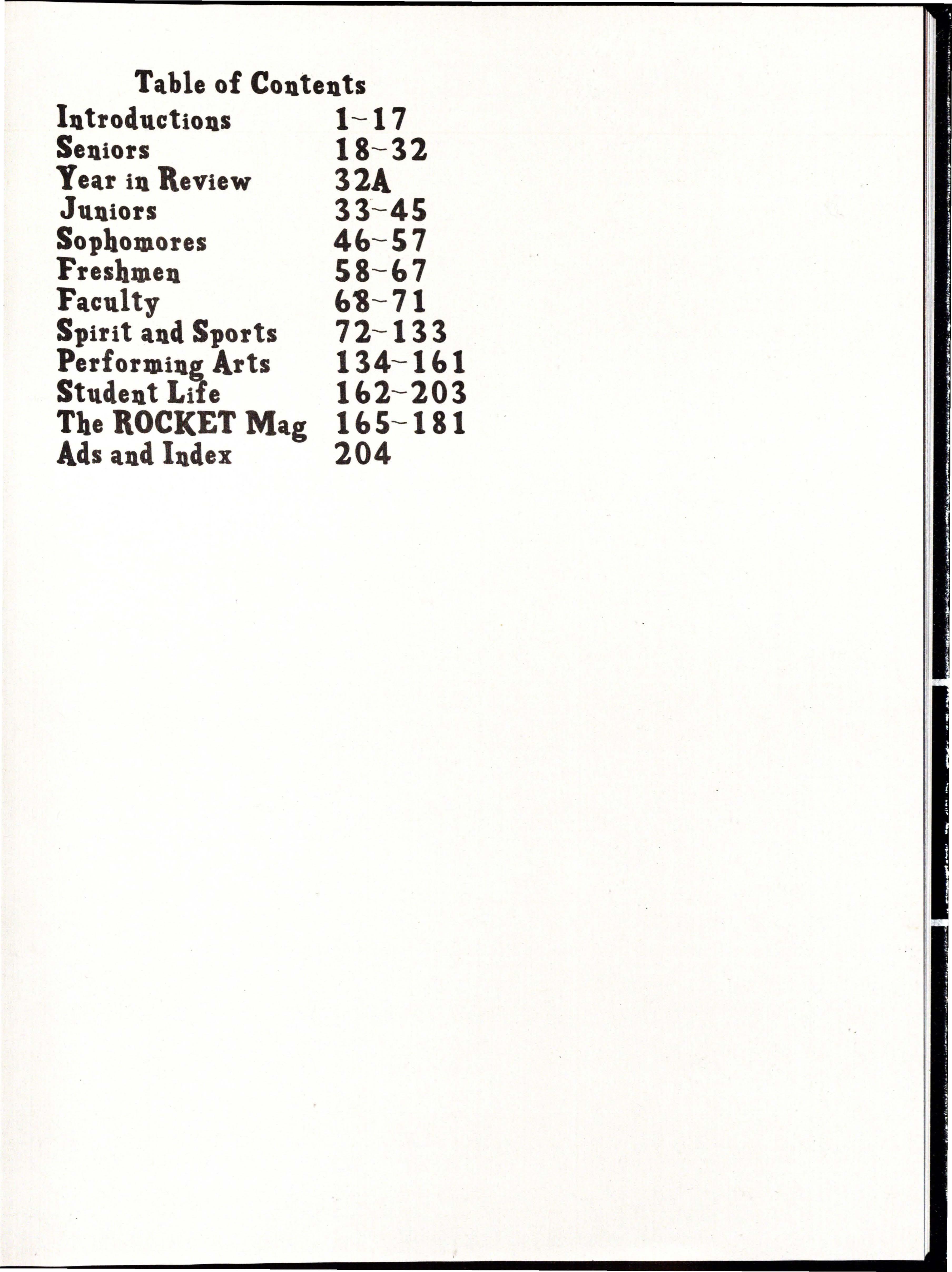 Sopholllores 4f>-5 7 Freshlllea 5 8-f, 7 Faculty f,1-71 Spirit a11a Sports 7 2-13 3 Perforlllillg Arts 134-161 Stuieut Life 1 f>l-203 The ROCKET Mag 16 5-181 Ads a11a l11iex 204