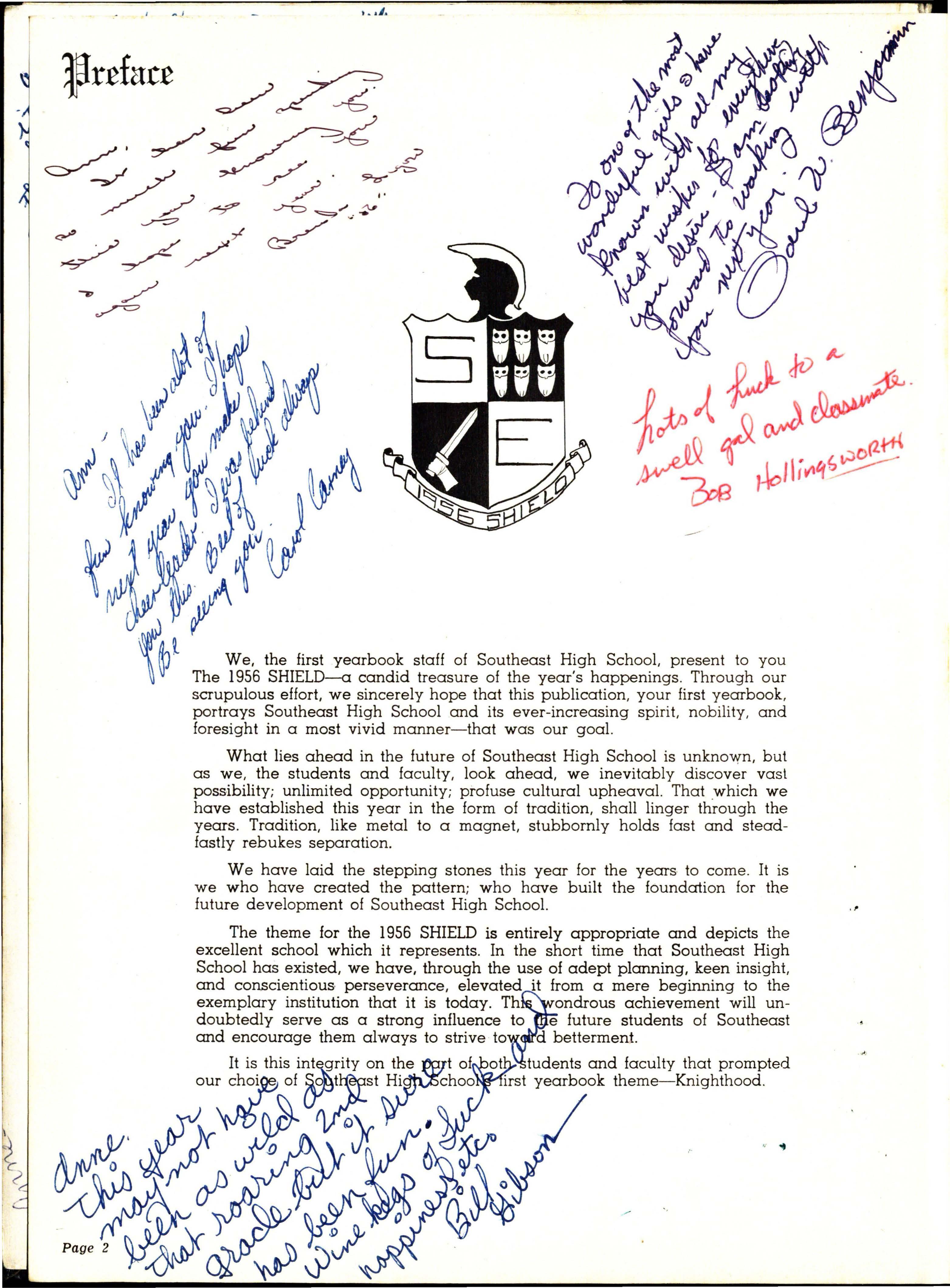 \~~l We, the first yearbook staff of Southeast High School, present to you ' ~ The 1956 SHIELD-a candid treasure of the year's happenings. Through our scrupulous effort, we sincerely hope that this publication, your first yearbook, portrays Southeast High School and its ever-increasing spirit, nobility, and foresight in a most vivid manner-that was our goal.