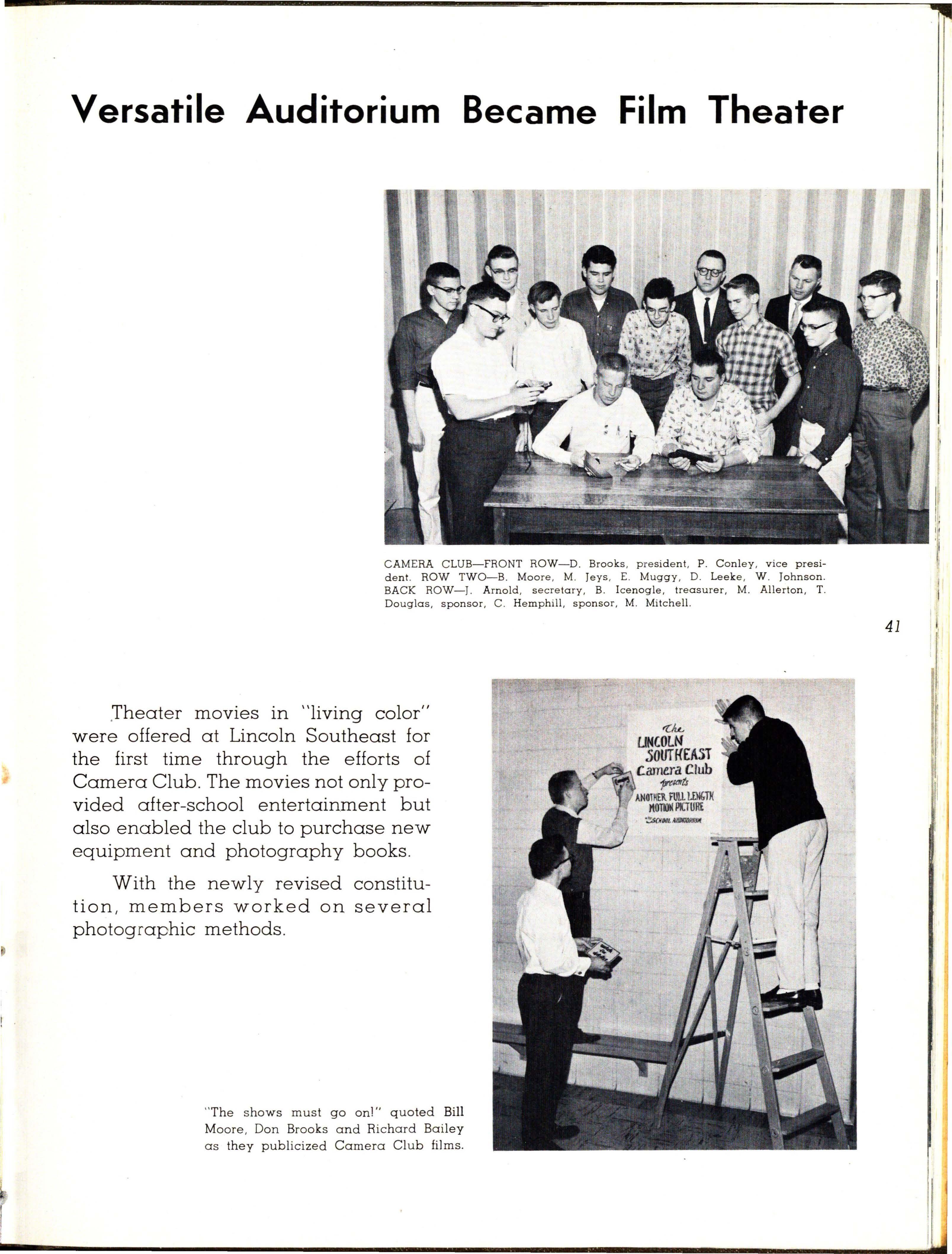 .Theater movies in "living color" were offered at Lincoln Southeast for the first time through the efforts of Camera Club The movies not only provided after-school entertainment but also enabled the club to purchase new equipment and photography books.