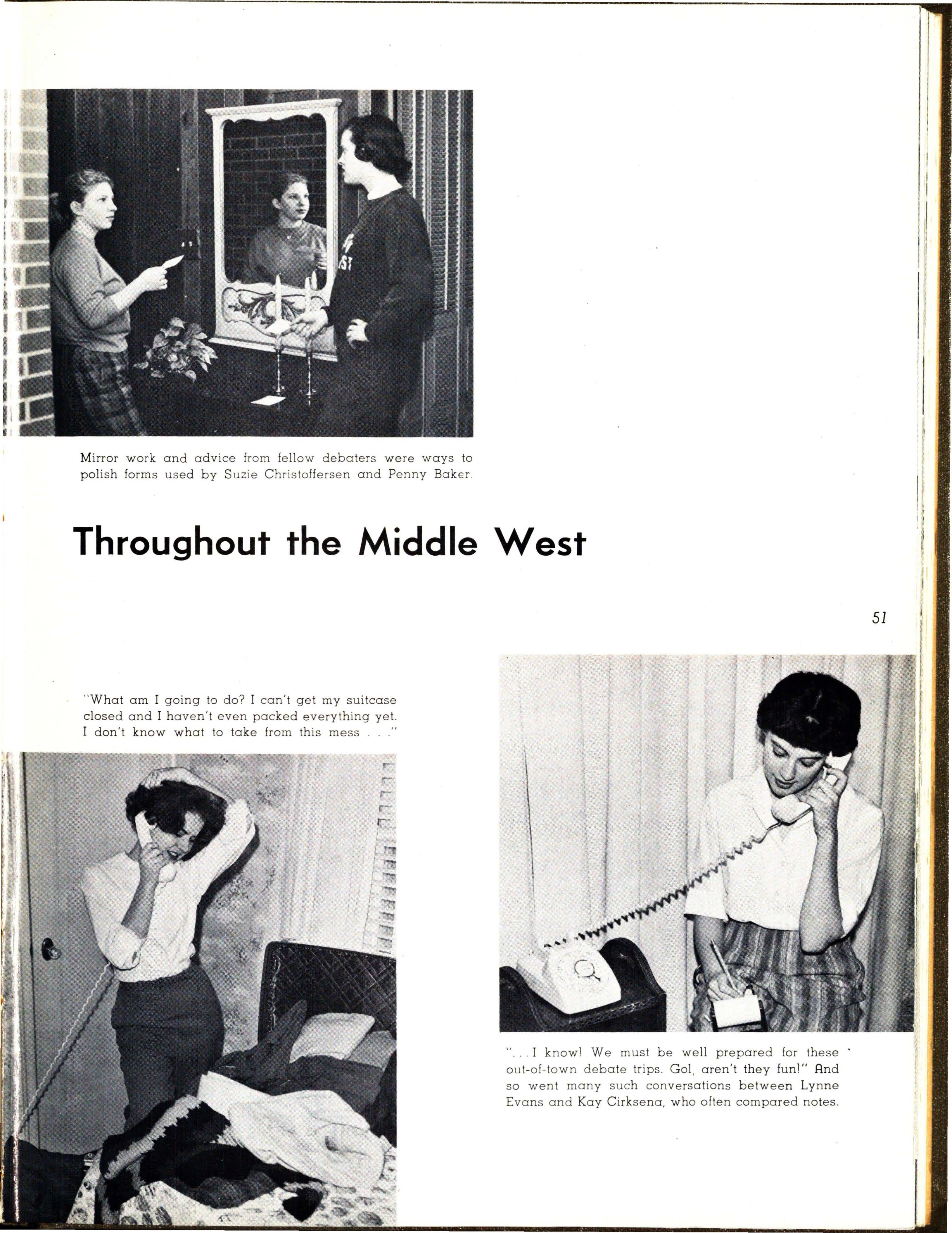 Joining together to form a working unit were the members of the major staff Janie Garlinghouse aptly headed the o r ganizations department with a motherly influence . Also known as ' ' Crash" or " Joe ", Janie was always willing to give her pictures up for use · in the opening section. ~hirley Sampson, with Thesaurus, dictionary and style sheet handy , set an unprecedented record by being able to pick out a misplaced modifier at thirty feet. Hal Hoerner divided his time between the personnel staff and the editing of his tactful but verbose bulletins . Although plagued by the mumps , the sports staff , under the direction of Dick Owen, produced enviable results . The photographers, headed by Dick Schmidt , spent many hours taking and developing pictures. Wherever business manager Kay lv1atison went e x citement was sure to follow. Her subtle little jokes and blushing grin brightened many dull moments.