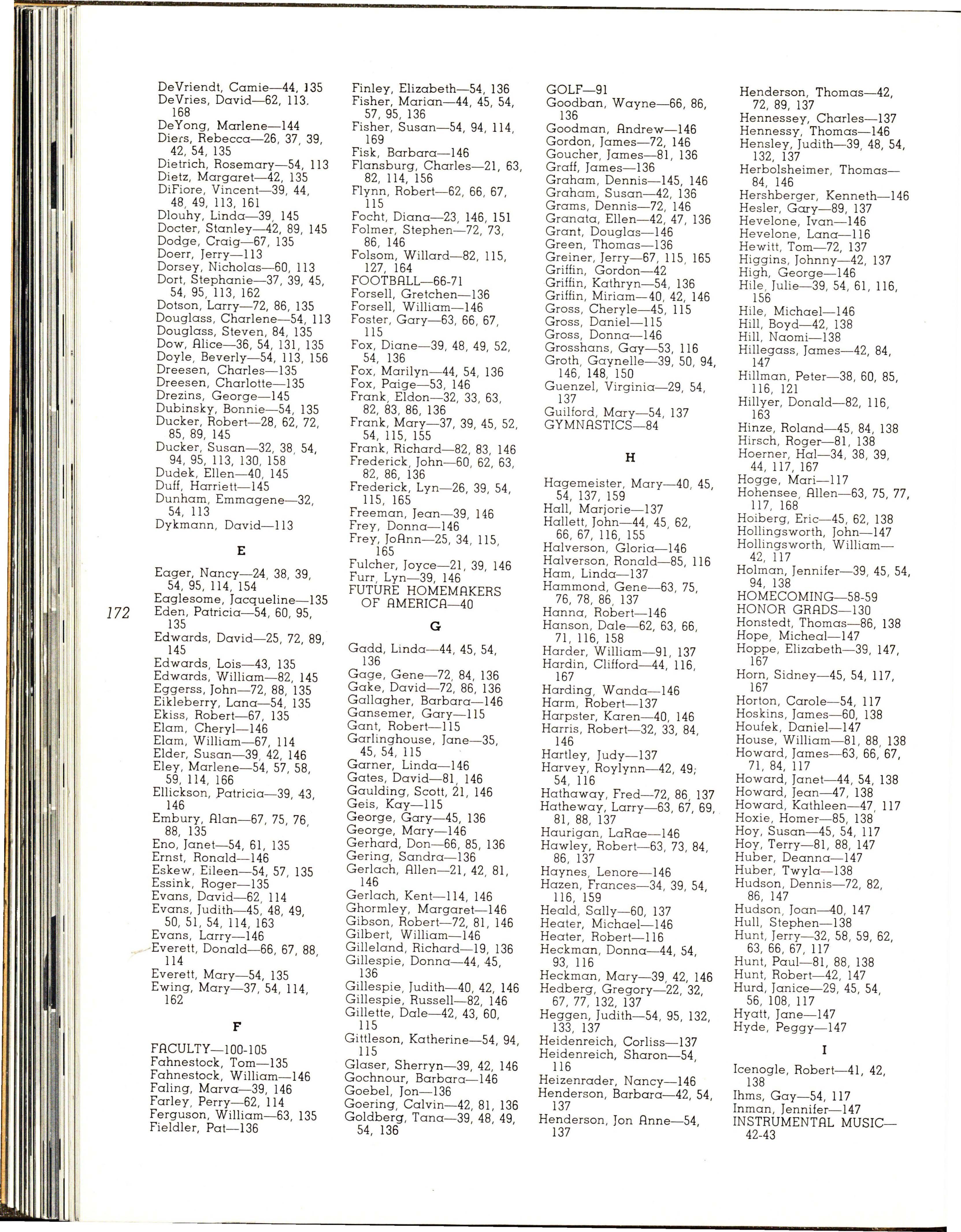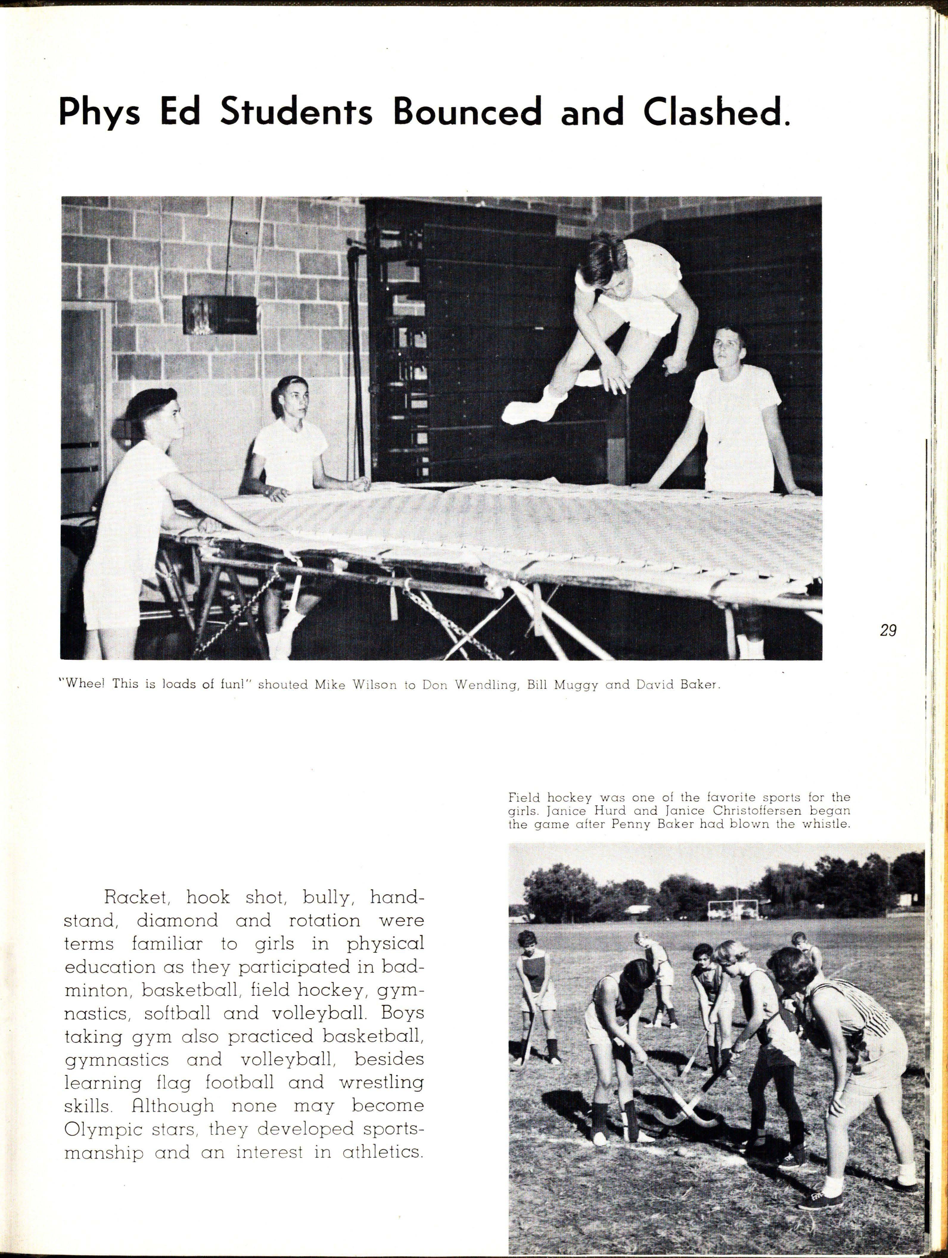 Racket , hook shot , bully , handstand , diamond and rotation were term s familiar to girls in physical education as they participated in badminton , basketball, field hockey , gymnastics , softball and volleyball . Boys taking gym also practiced basketball, gymnastics and volleyball, besides learning flag football and wrestling skills. Alth oug h none may become Ol ympic stars , they deve lo ped spo rtsman s hip and an inter est i n athletics.