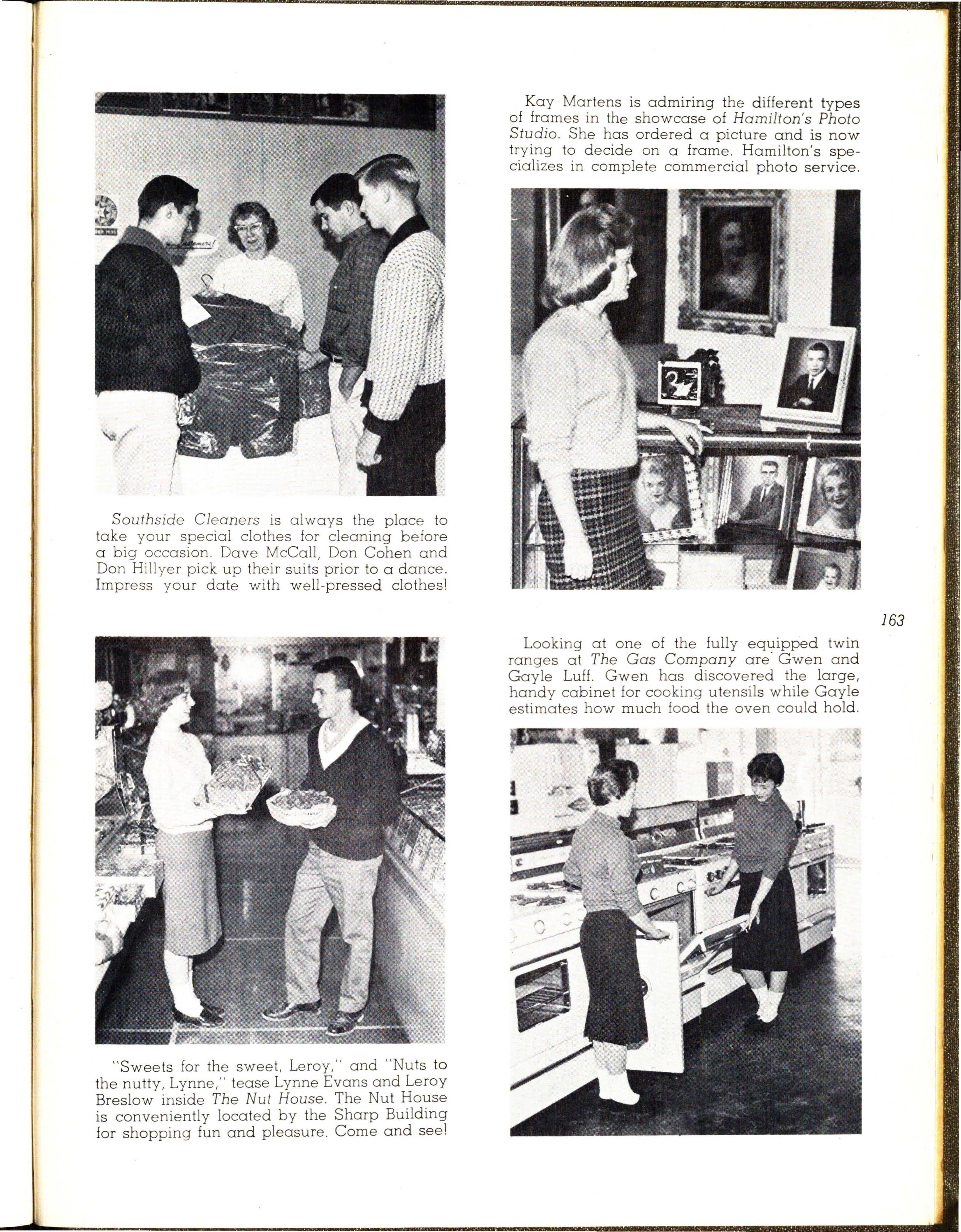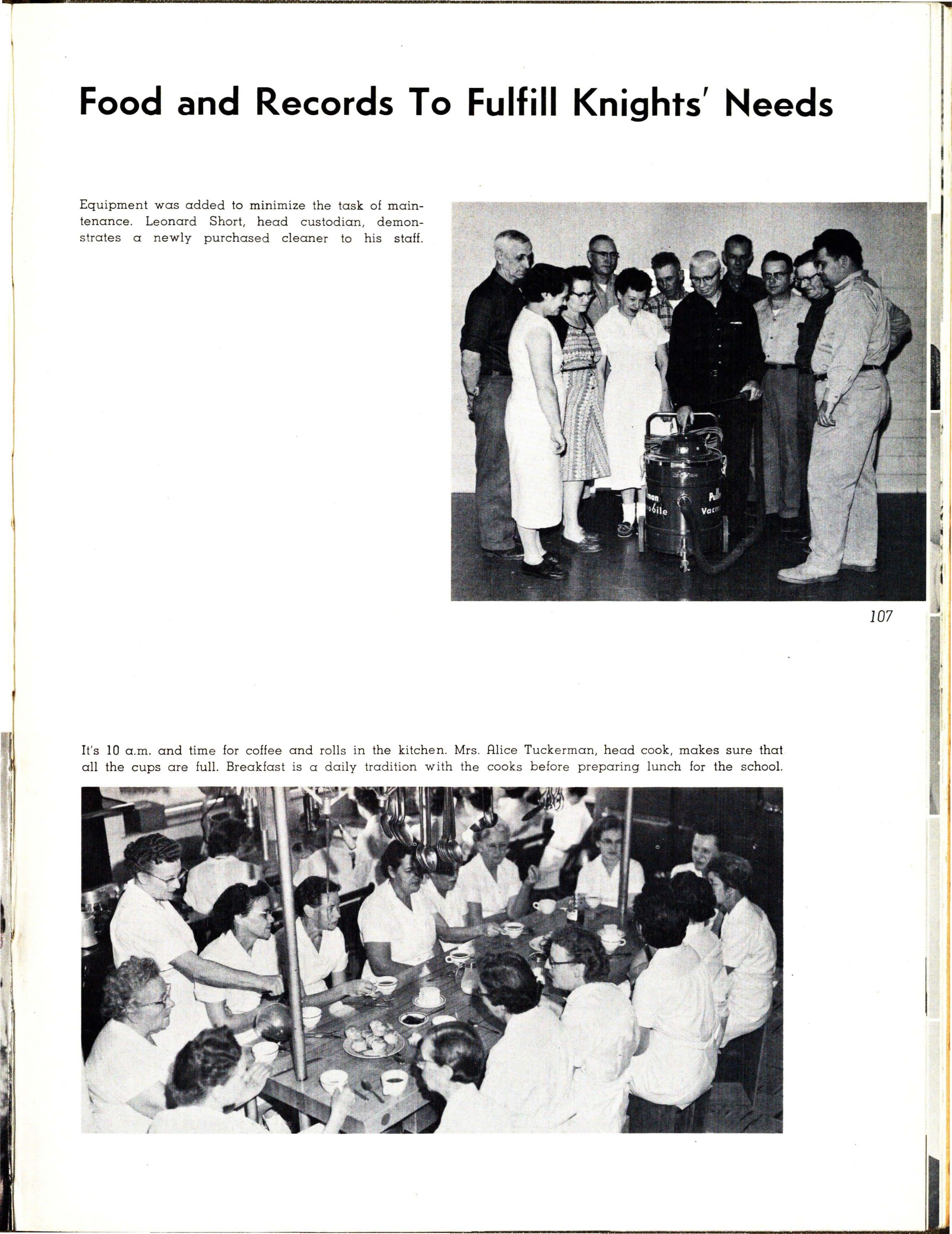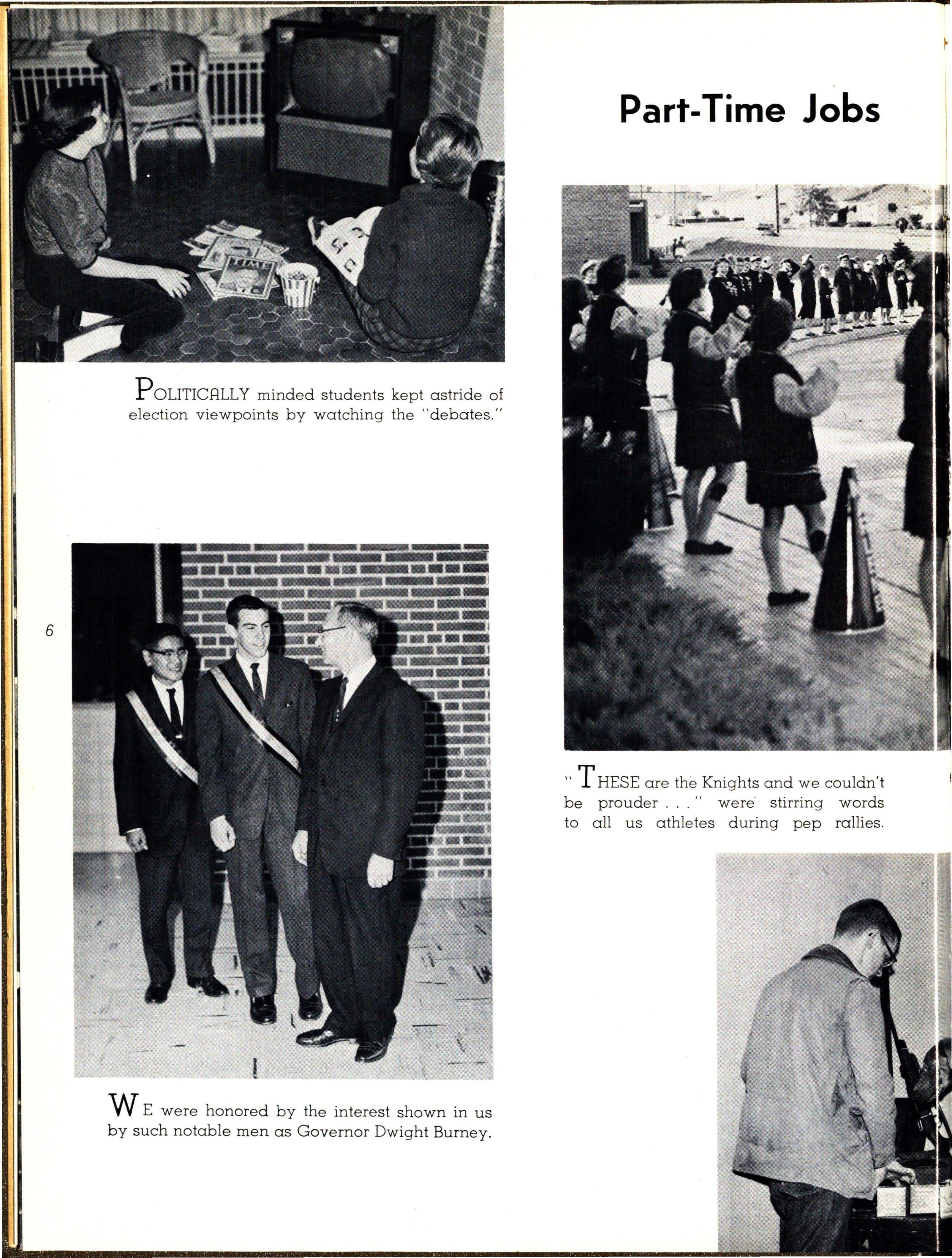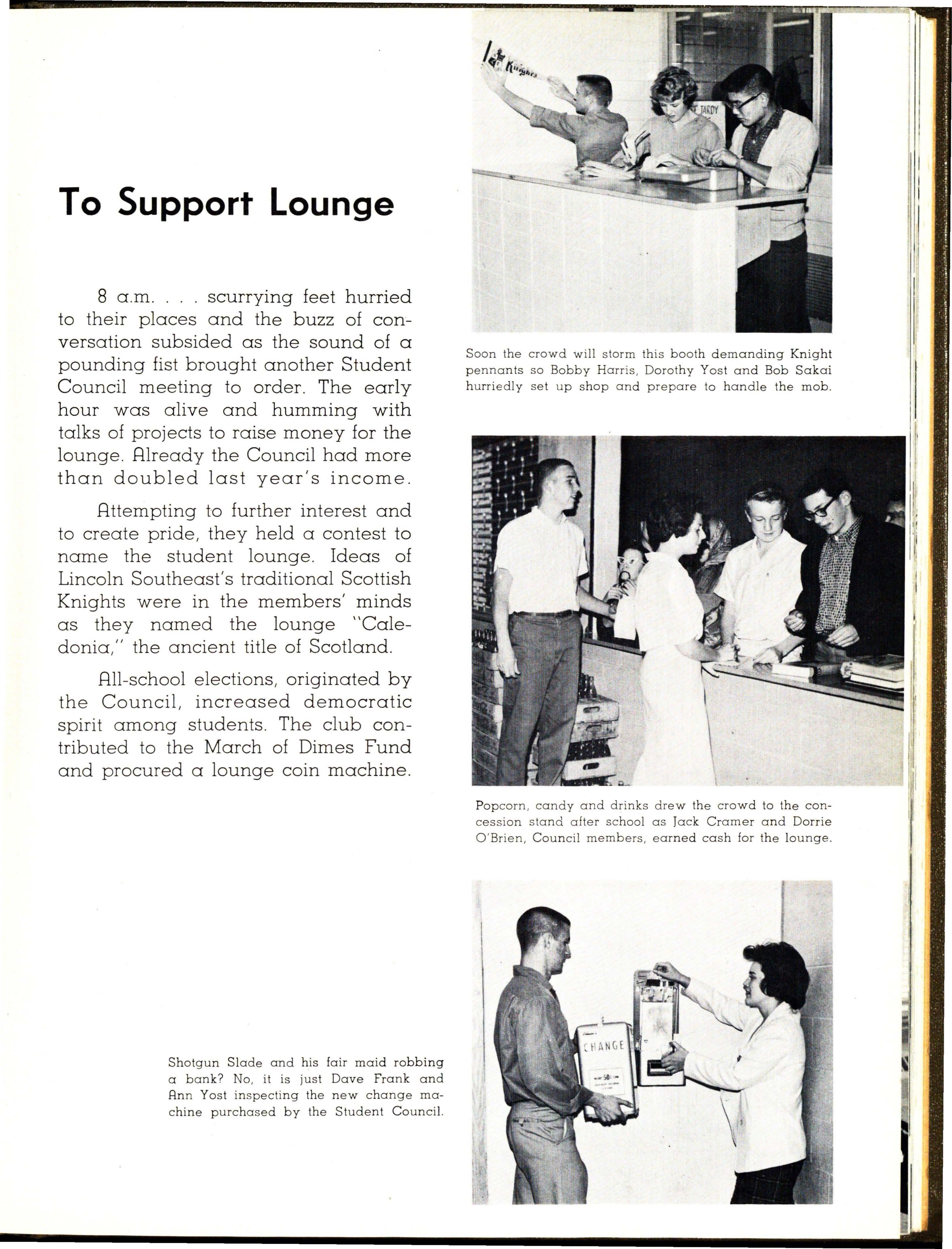 S h otgu n Sl ade and his fair mai d ro bb i ng a bank? No , it is just Dav e F rank and Ann Yos t inspecting the n ew change machi n e purchased by the Student C ouncil. Soon the crowd will storm this booth demanding Kn ig ht pennants so Bobby Harris , Dorothy Yost an d Bob Sakai h urriedly set up s h op and prepare to handle t h e mob.Design built on lines tied the 1961 SHIELD together to make a themeless but uniform book . The newly adopted academic section along with carefully selected type and artistic designs characterized this year's book.