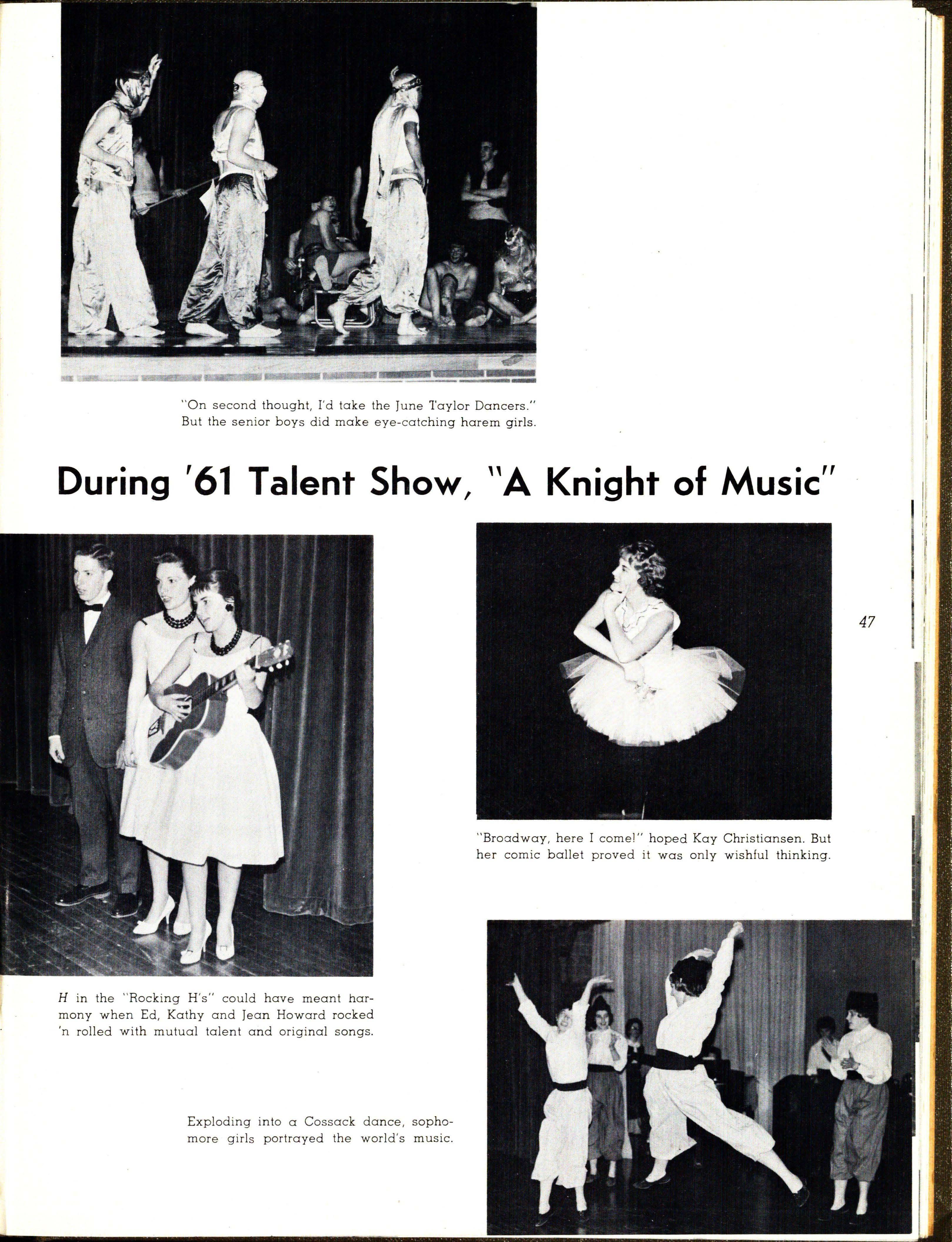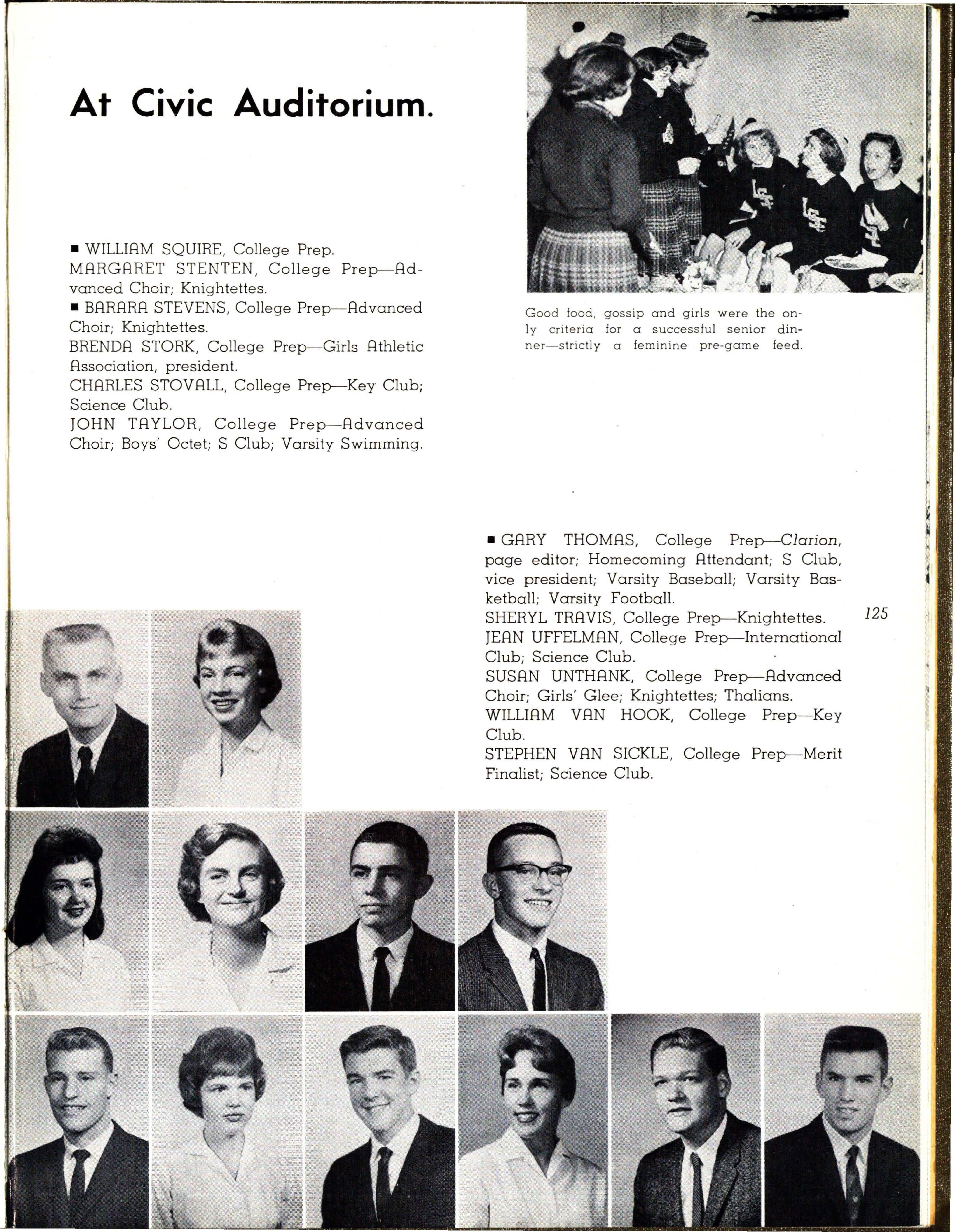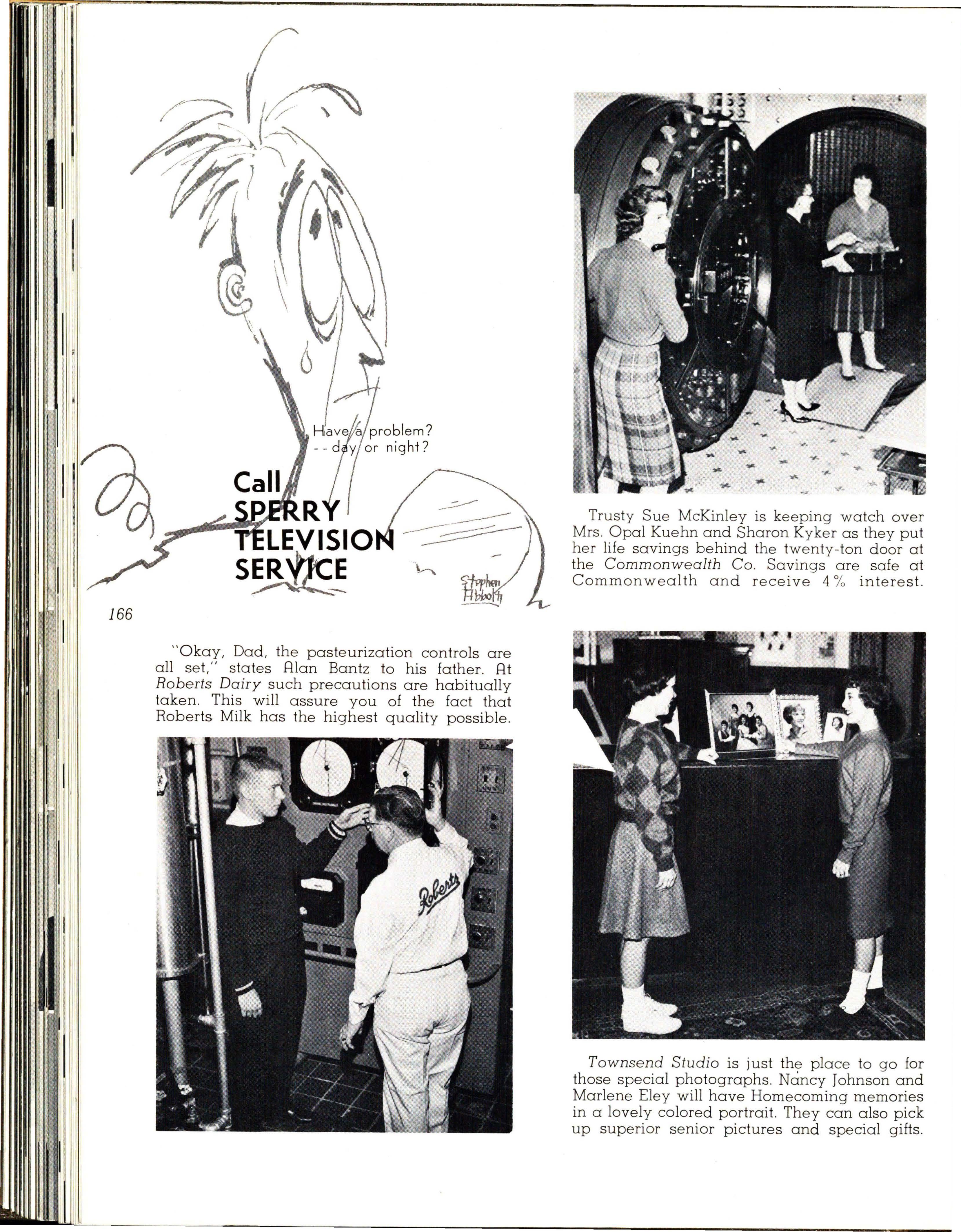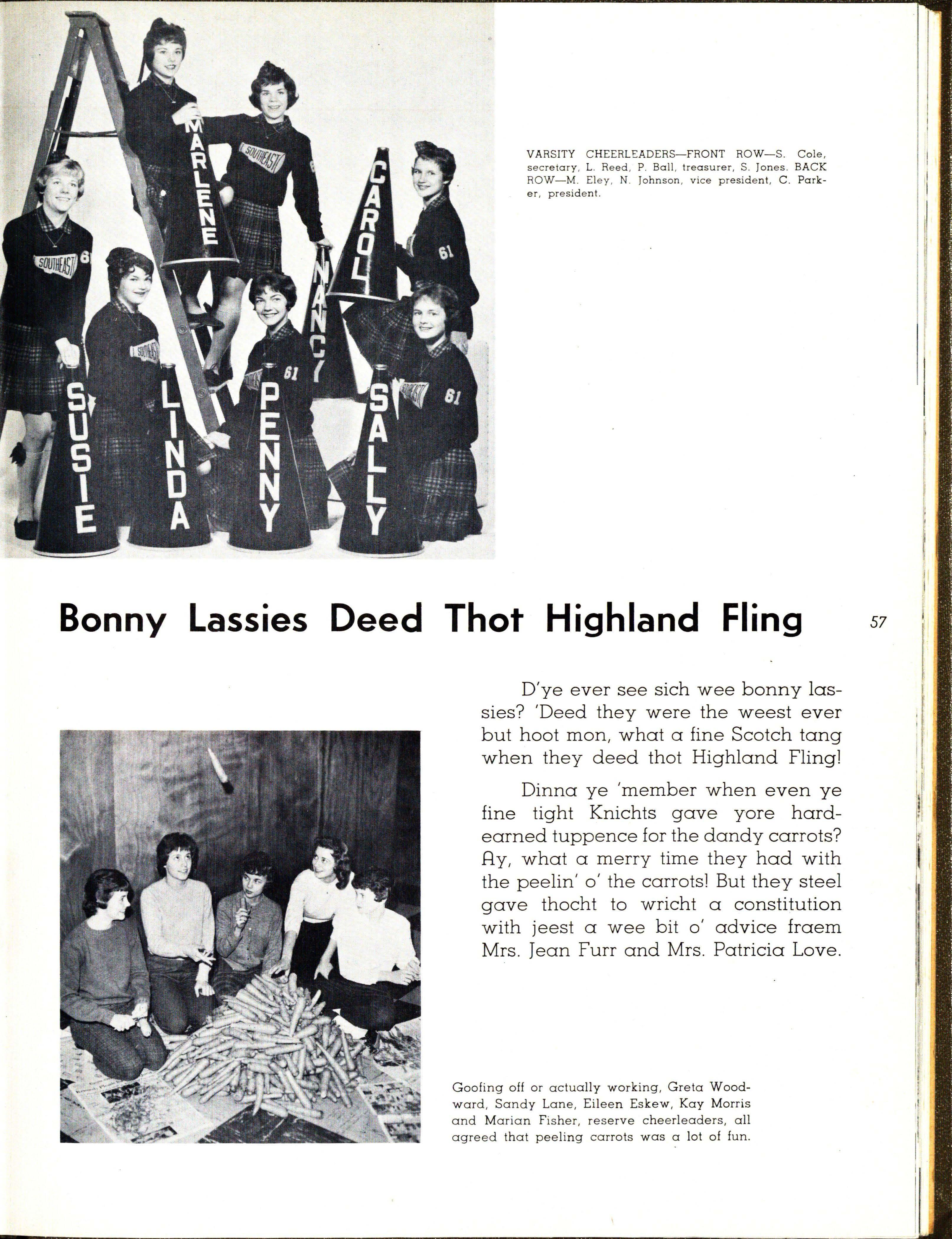 S h otgu n Sl ade and his fair mai d ro bb i ng a bank? No , it is just Dav e F rank and Ann Yos t inspecting the n ew change machi n e purchased by the Student C ouncil. Soon the crowd will storm this booth demanding Kn ig ht pennants so Bobby Harris , Dorothy Yost an d Bob Sakai h urriedly set up s h op and prepare to handle t h e mob.Design built on lines tied the 1961 SHIELD together to make a themeless but uniform book . The newly adopted academic section along with carefully selected type and artistic designs characterized this year's book.