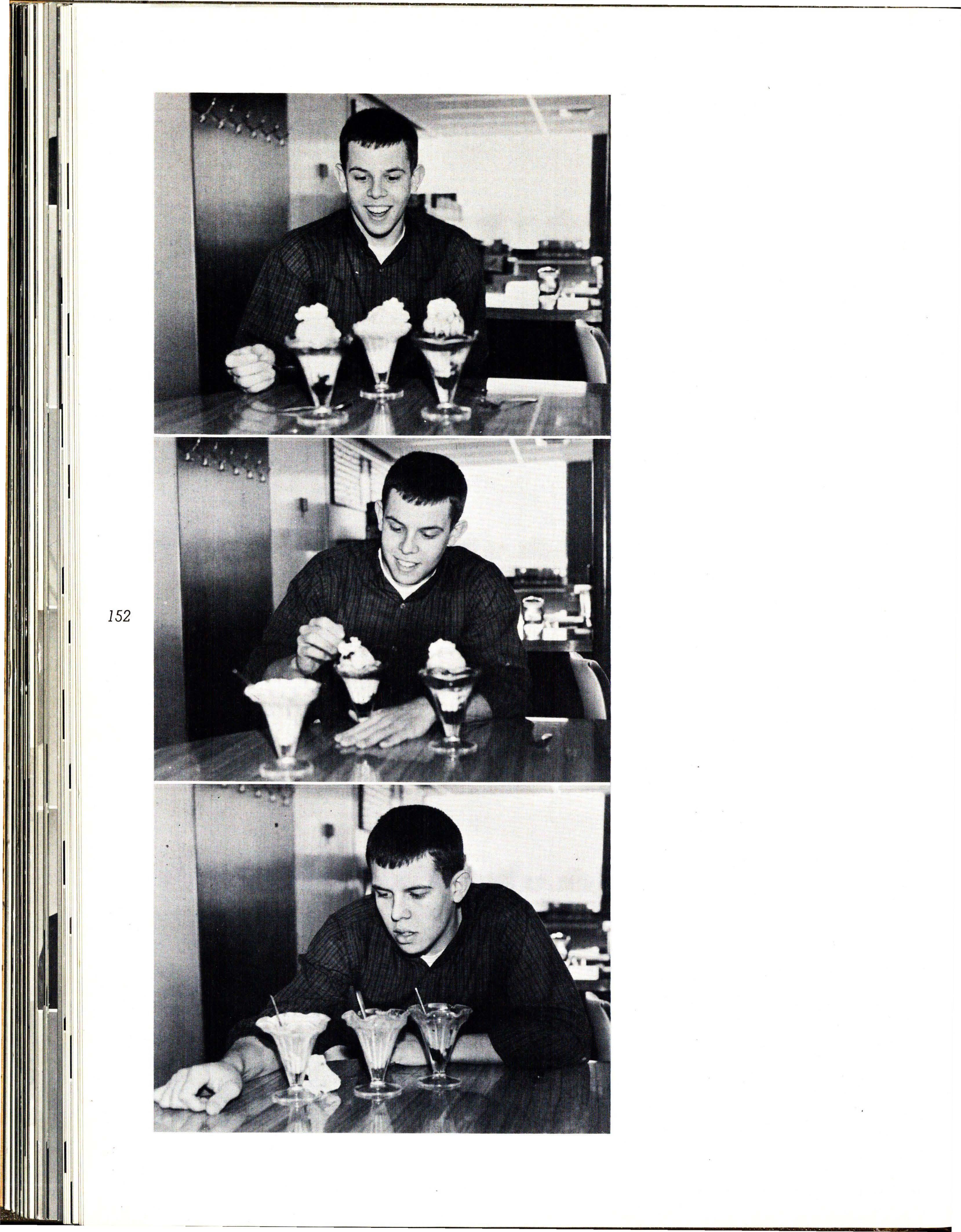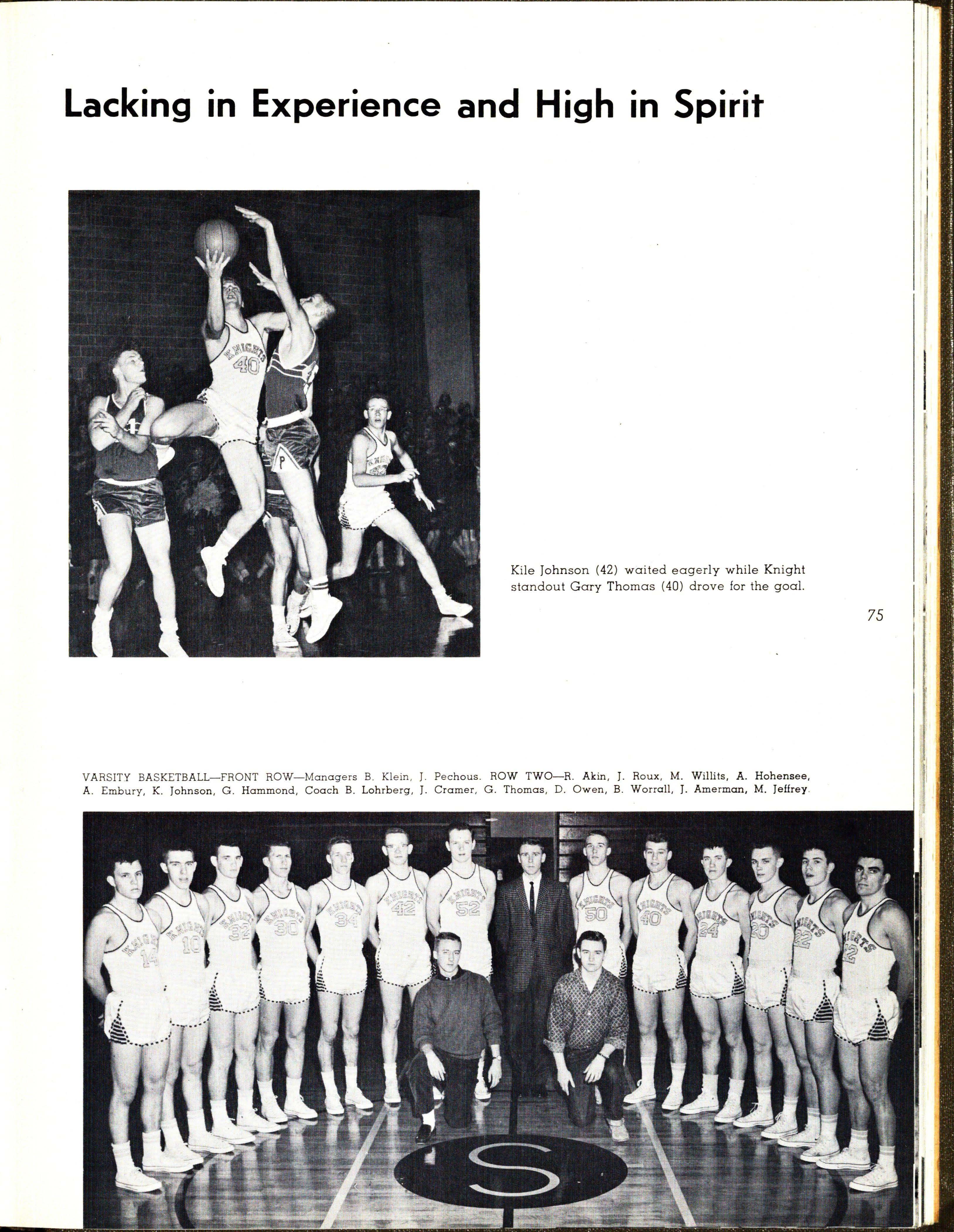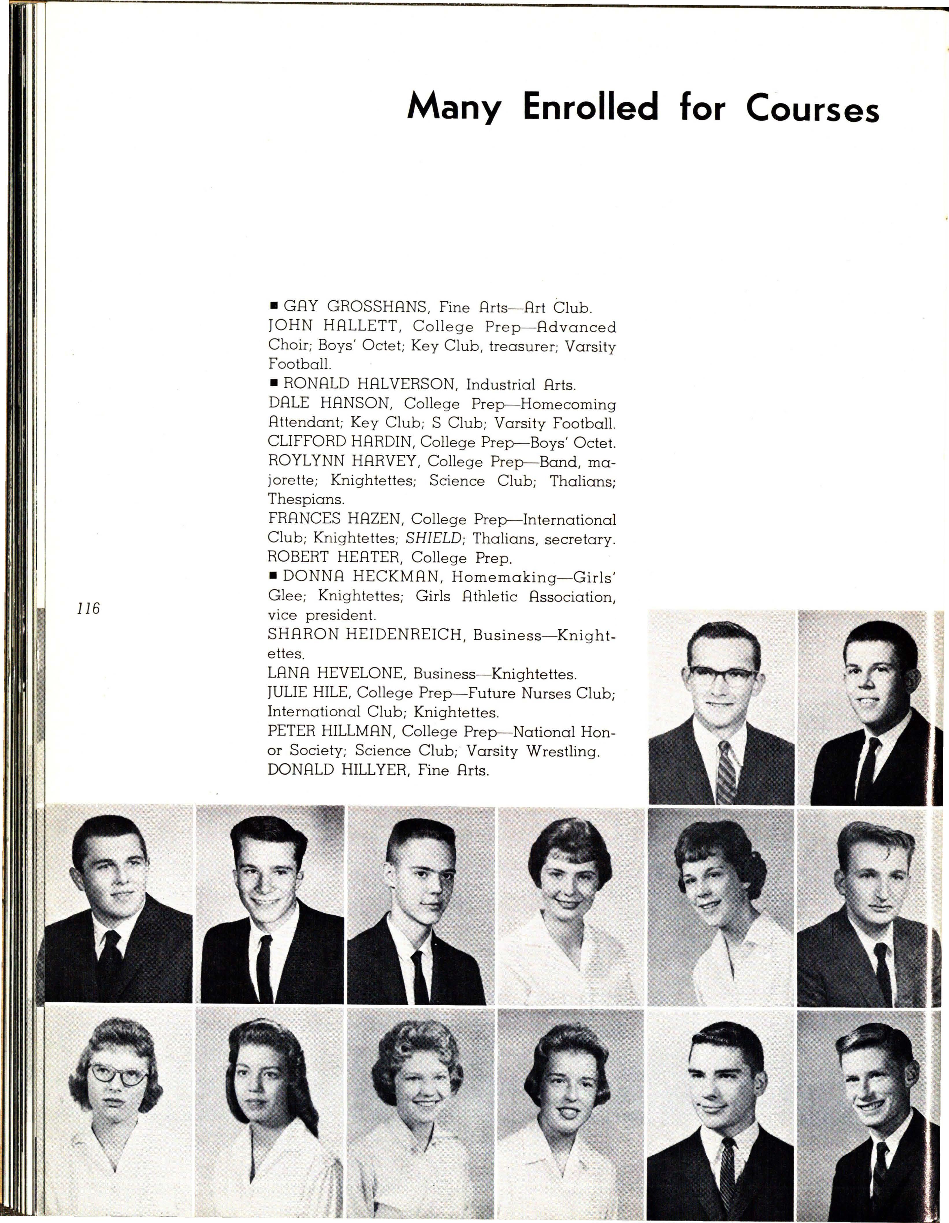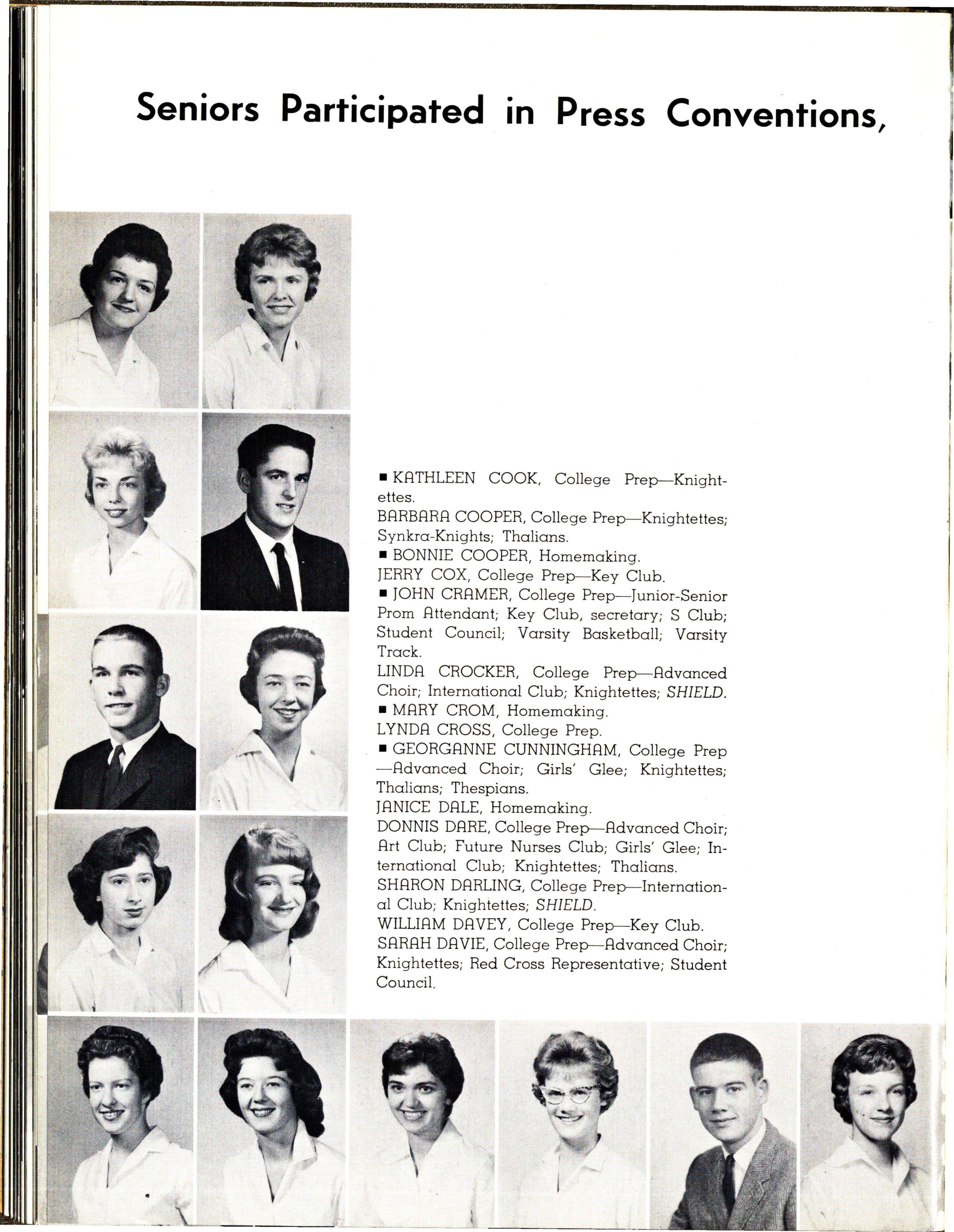 S h otgu n Sl ade and his fair mai d ro bb i ng a bank? No , it is just Dav e F rank and Ann Yos t inspecting the n ew change machi n e purchased by the Student C ouncil. Soon the crowd will storm this booth demanding Kn ig ht pennants so Bobby Harris , Dorothy Yost an d Bob Sakai h urriedly set up s h op and prepare to handle t h e mob.Design built on lines tied the 1961 SHIELD together to make a themeless but uniform book . The newly adopted academic section along with carefully selected type and artistic designs characterized this year's book.
