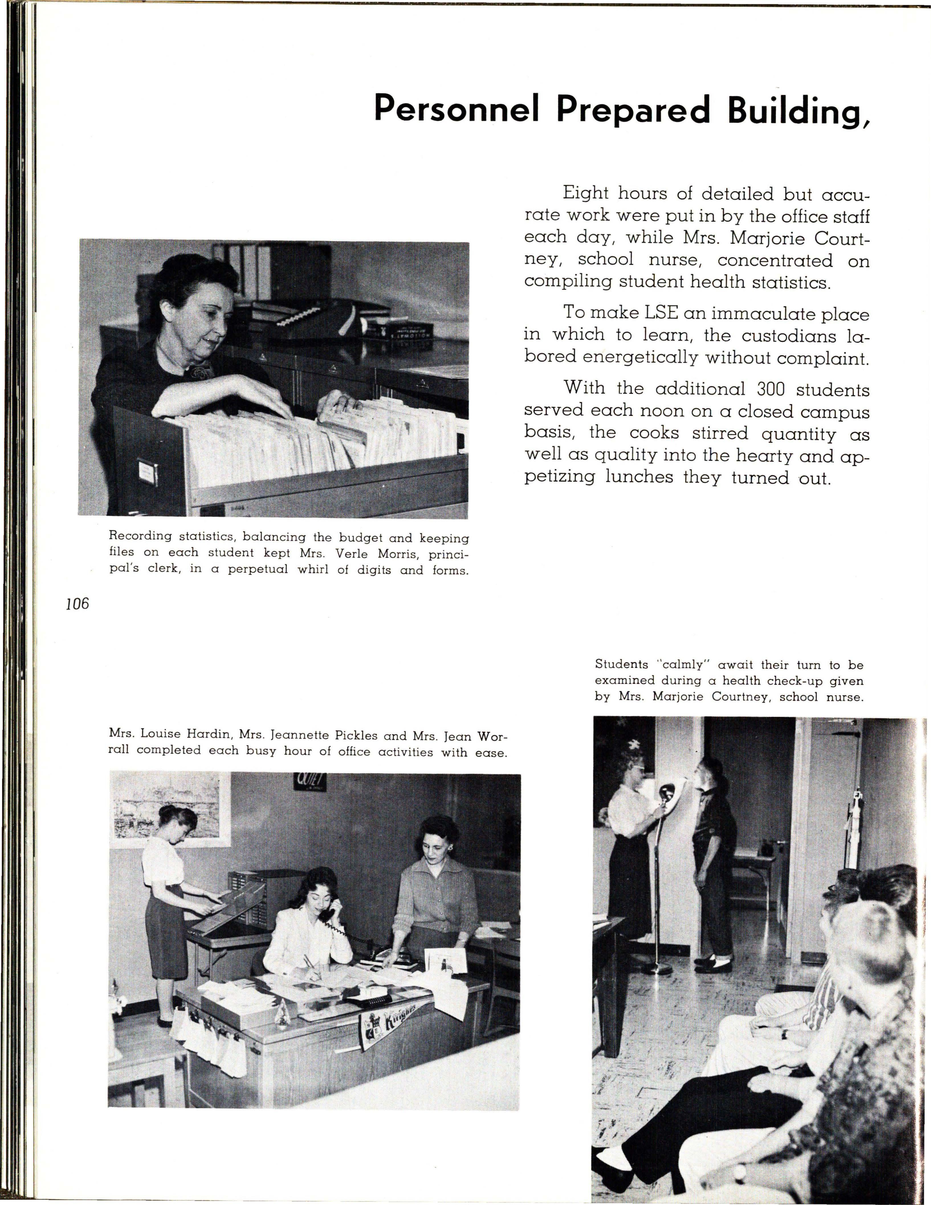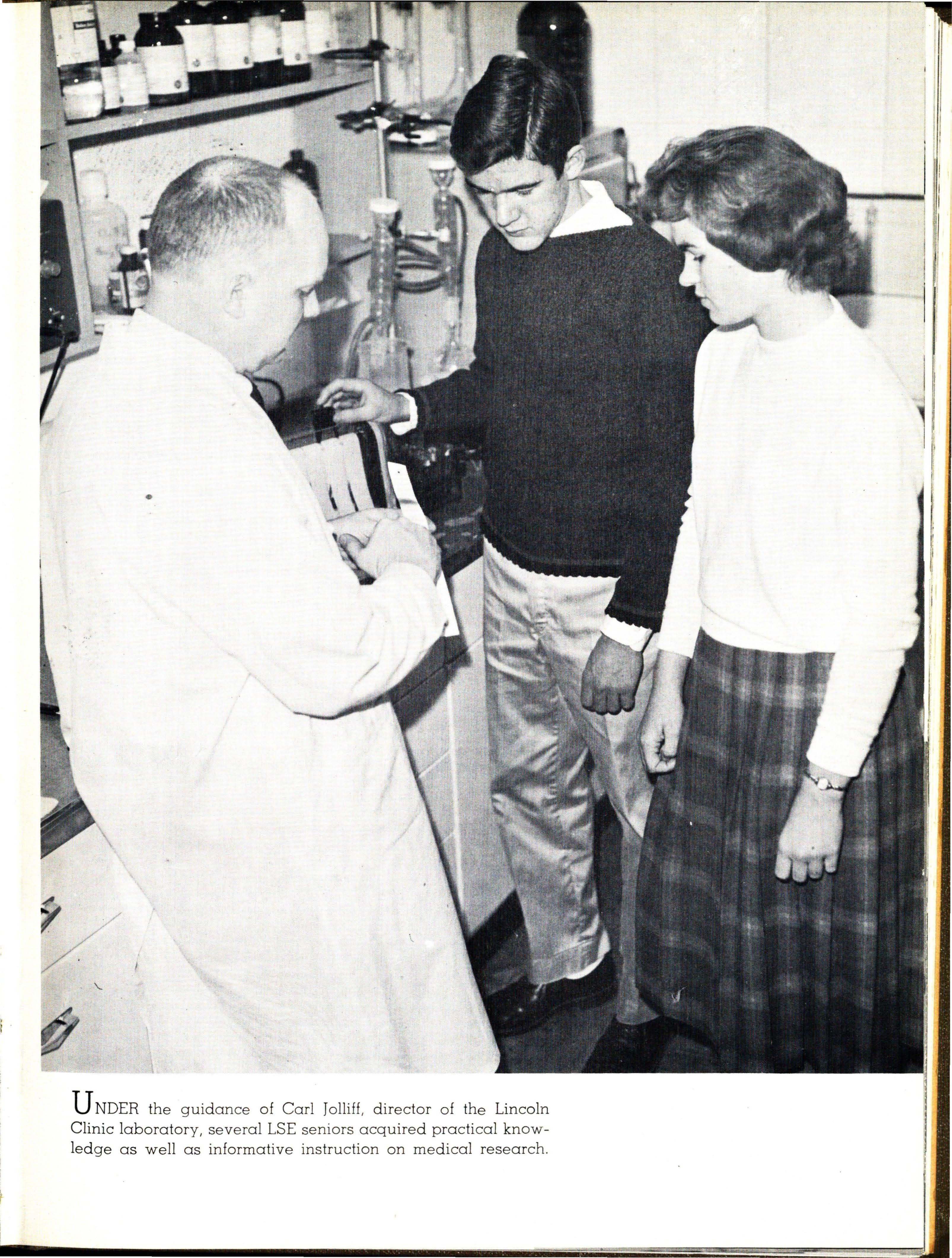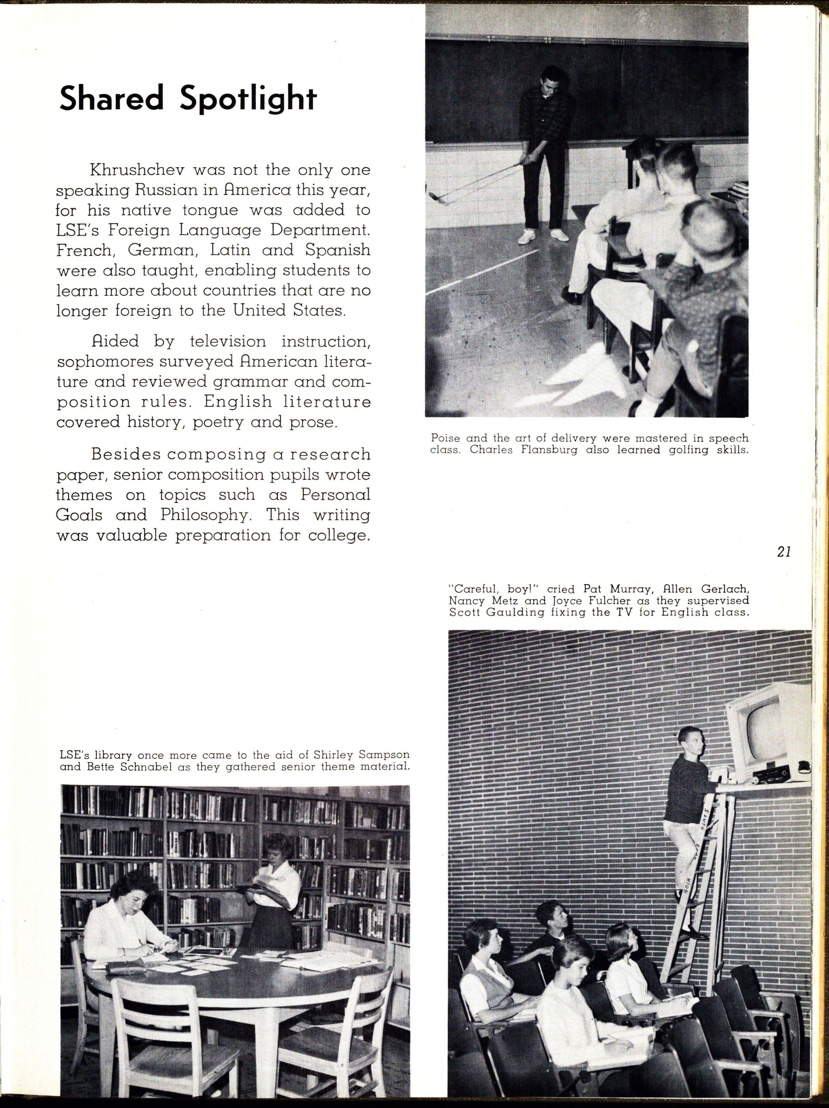 LSE ' s library o nce more came to the aid of Shirley Sampson and Bette Sch na b e l a s t h ey gathe r ed senior theme material. P o is e a nd the a r t of del i very w e re maste r ed i n spee c h class. Charl es Flansburg a l s o l ea rned go lf i ng sk ills.Physiology, the science dealing with the functions of the human body, was added to the curriculum this year. .R. physiology student typed blood, used a stethoscope and tried to spell and manipulate a sphygmomanometer.