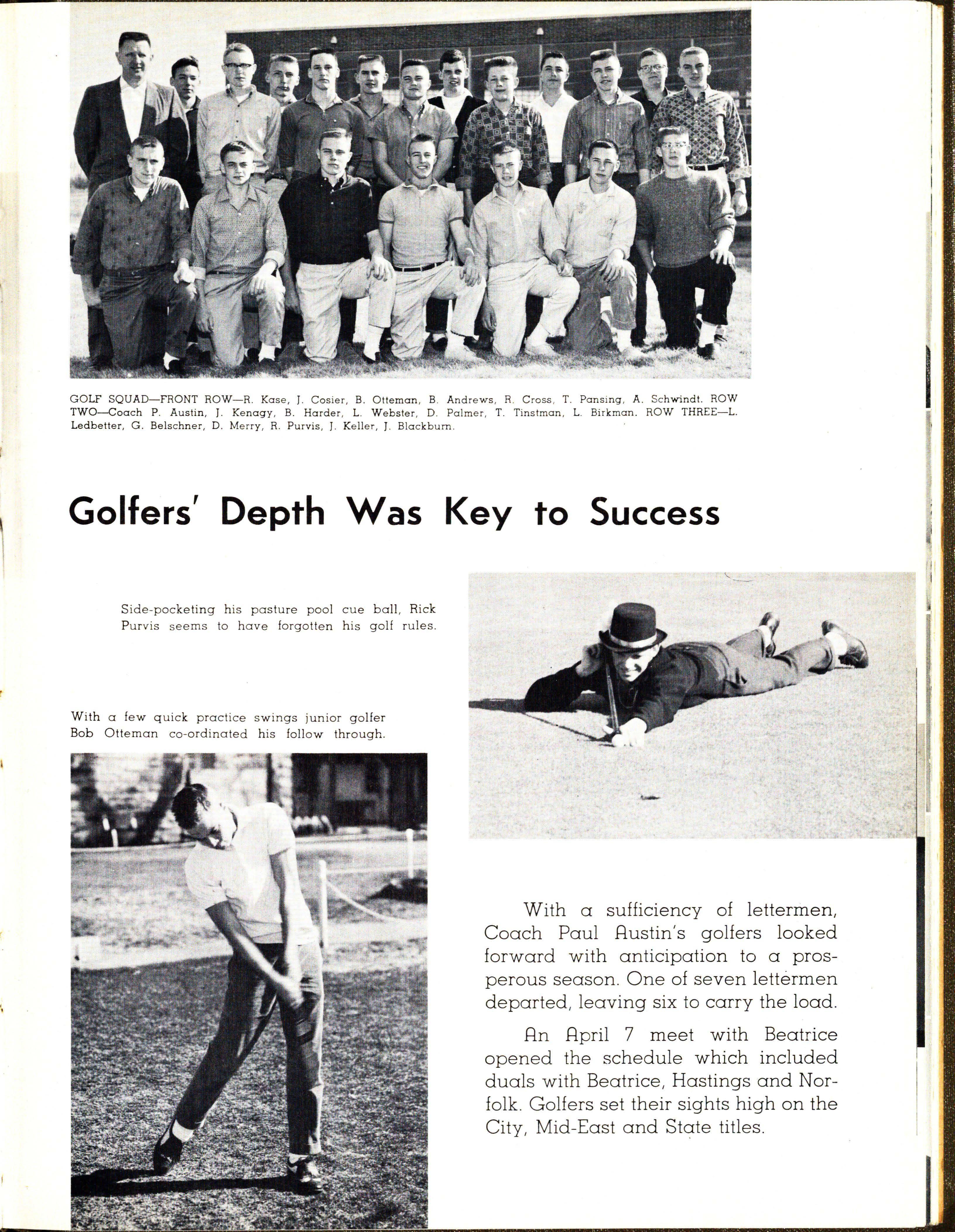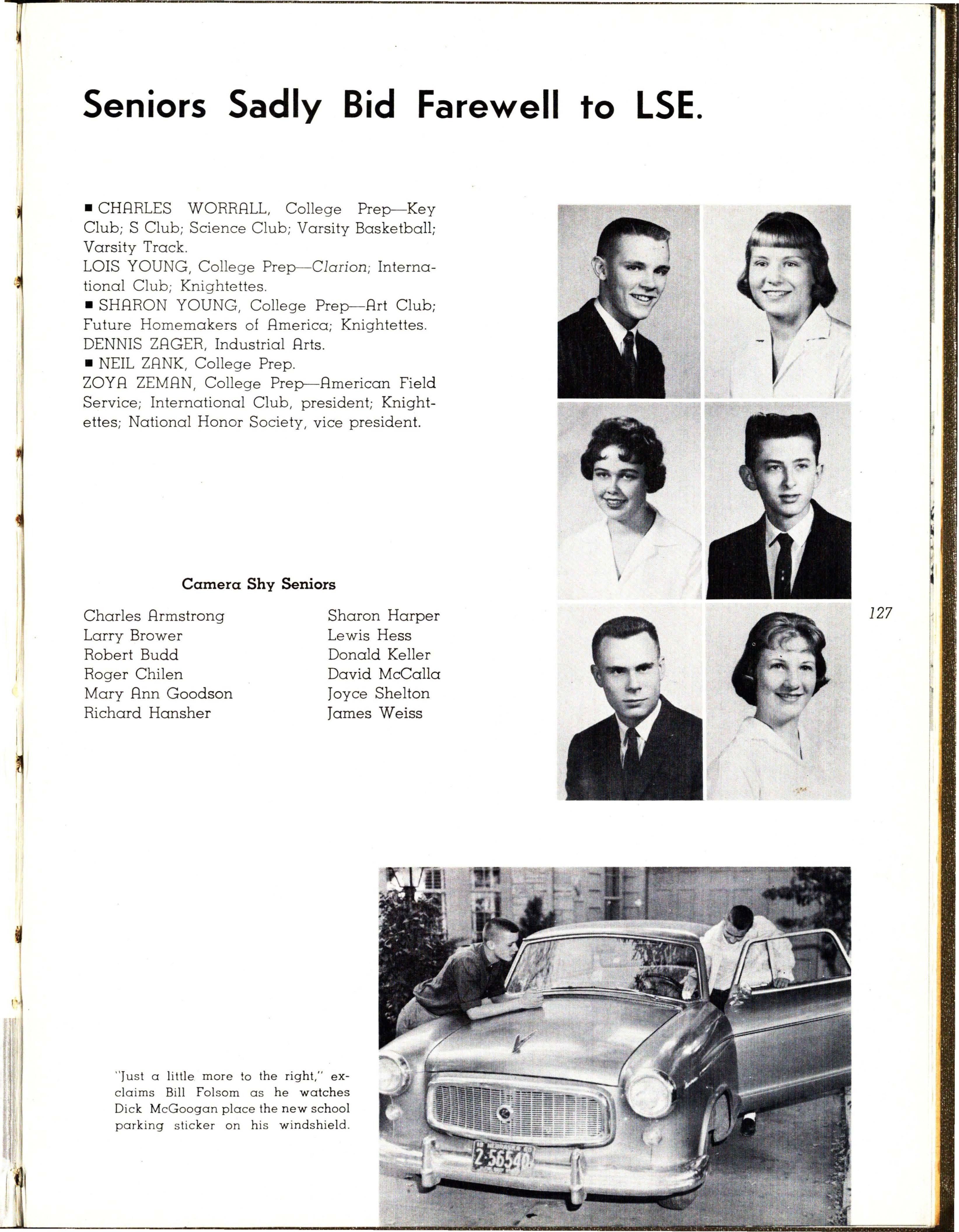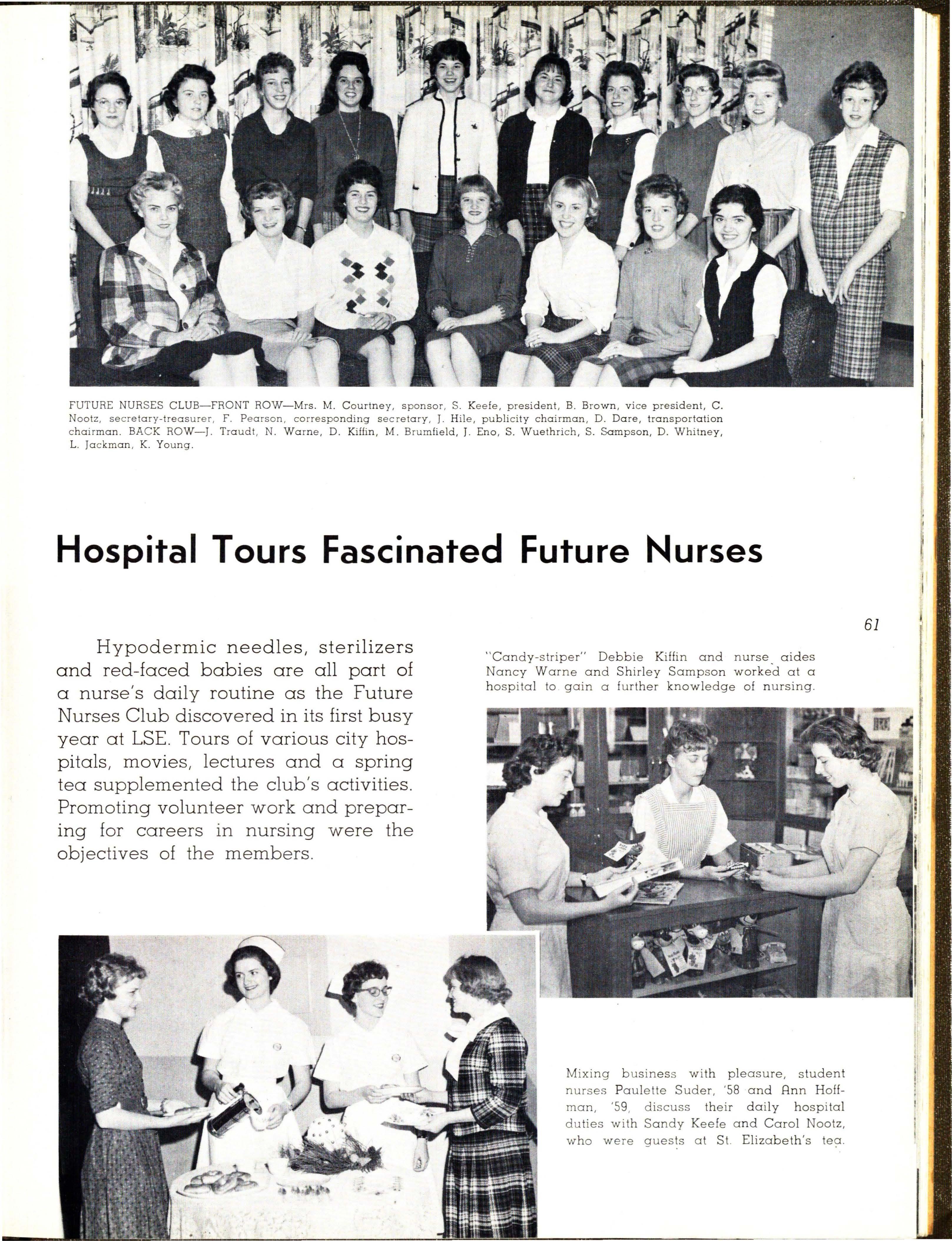LSE ' s library o nce more came to the aid of Shirley Sampson and Bette Sch na b e l a s t h ey gathe r ed senior theme material. P o is e a nd the a r t of del i very w e re maste r ed i n spee c h class. Charl es Flansburg a l s o l ea rned go lf i ng sk ills.Physiology, the science dealing with the functions of the human body, was added to the curriculum this year. .R. physiology student typed blood, used a stethoscope and tried to spell and manipulate a sphygmomanometer.