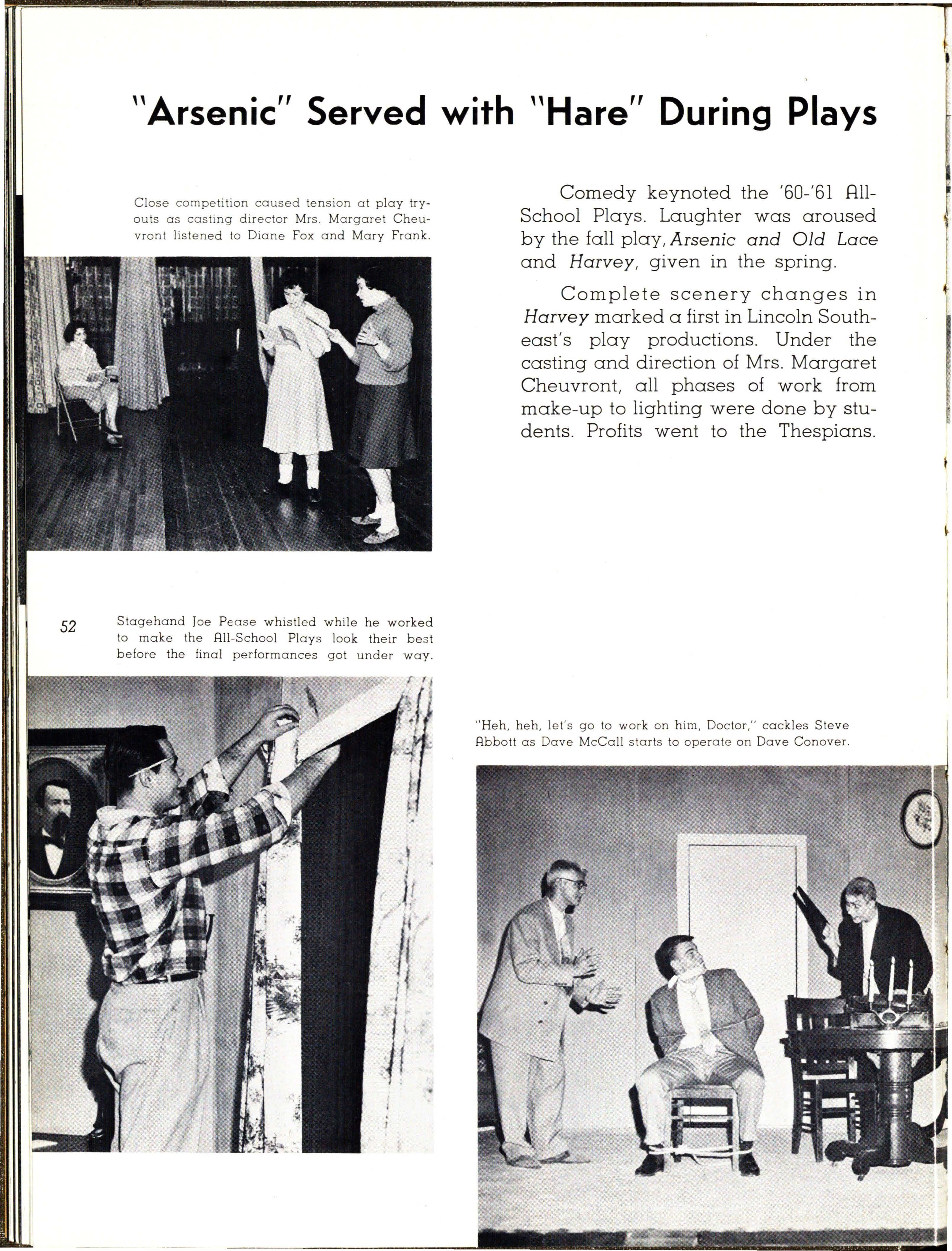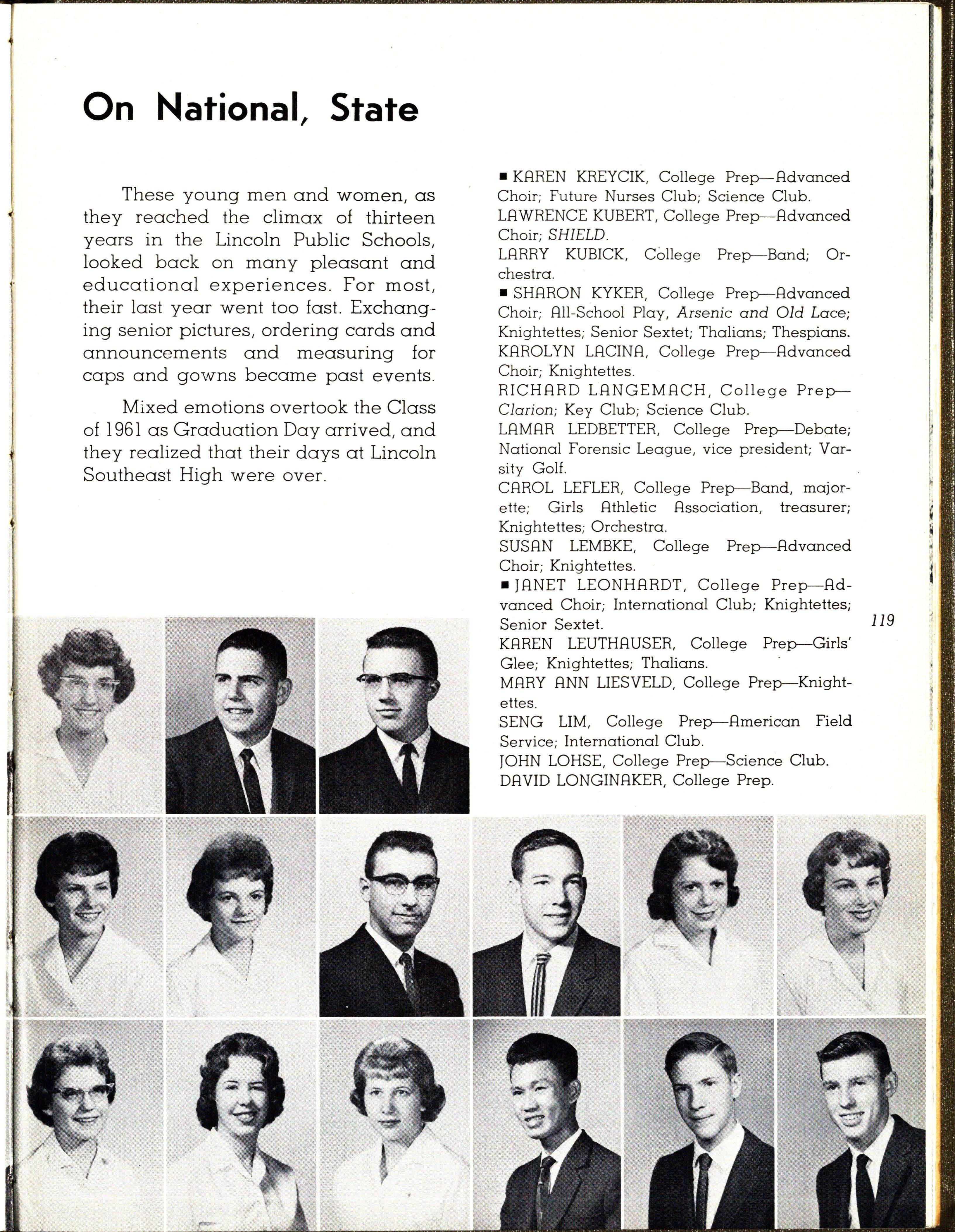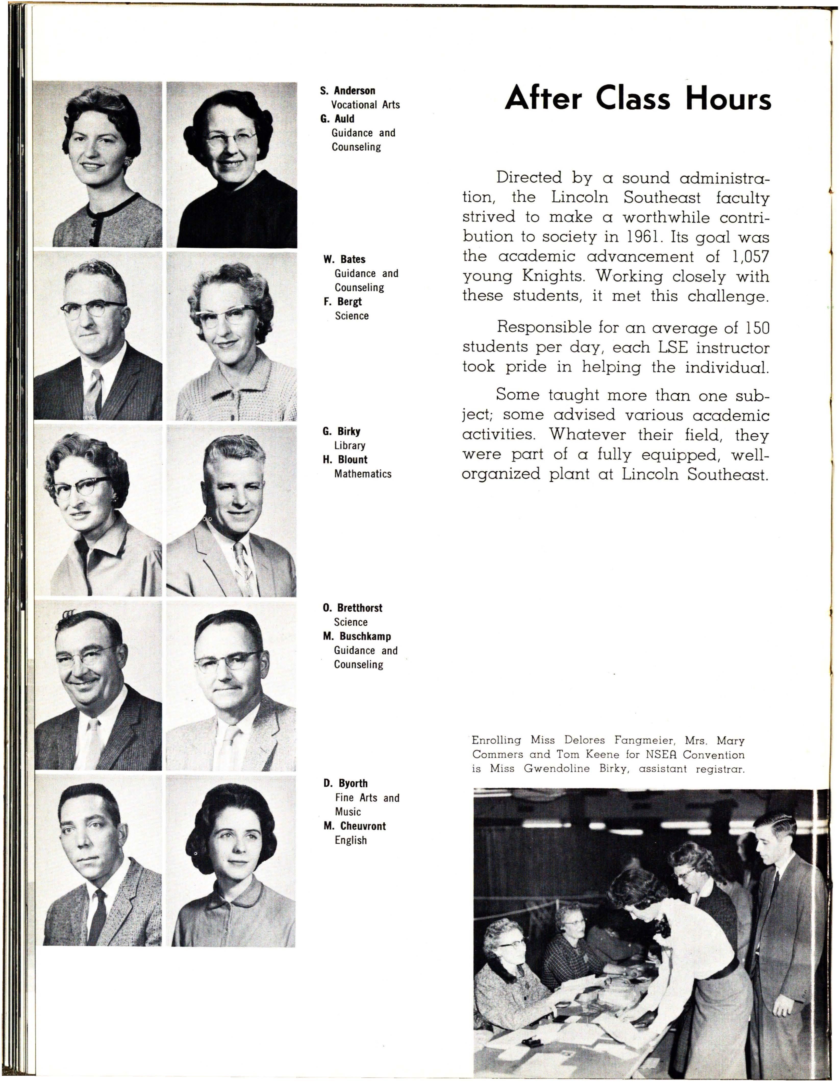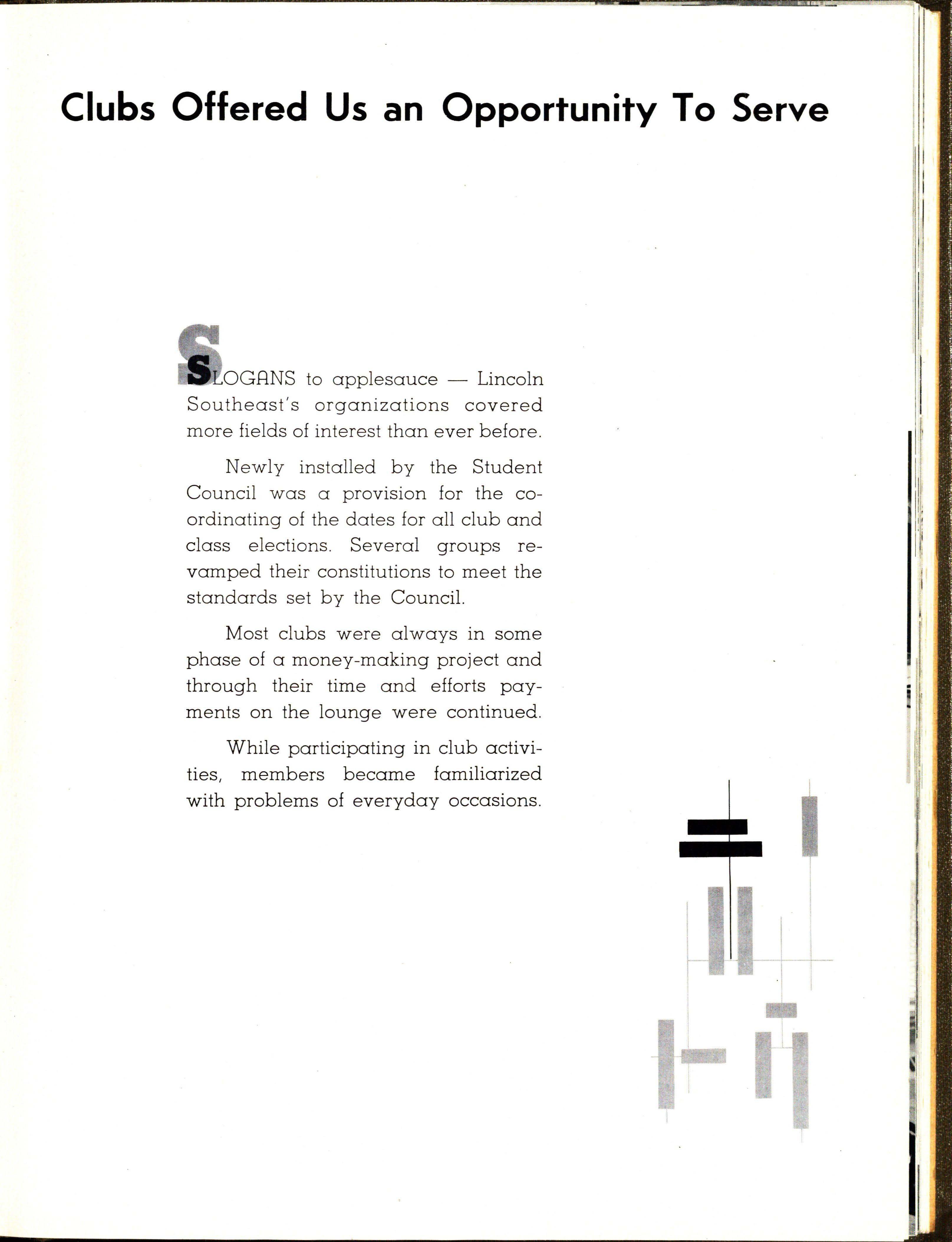 Just as the 1961 SHIELD fell into a pattern so did our lives . .At Lincoln Southeast the pattern consisted of five closely harmonized characteristics: academic accomplishment, organizational activity, athletic achievement, community service and personnel cooperation. Blended together, they gave LSE state and national recognition.
