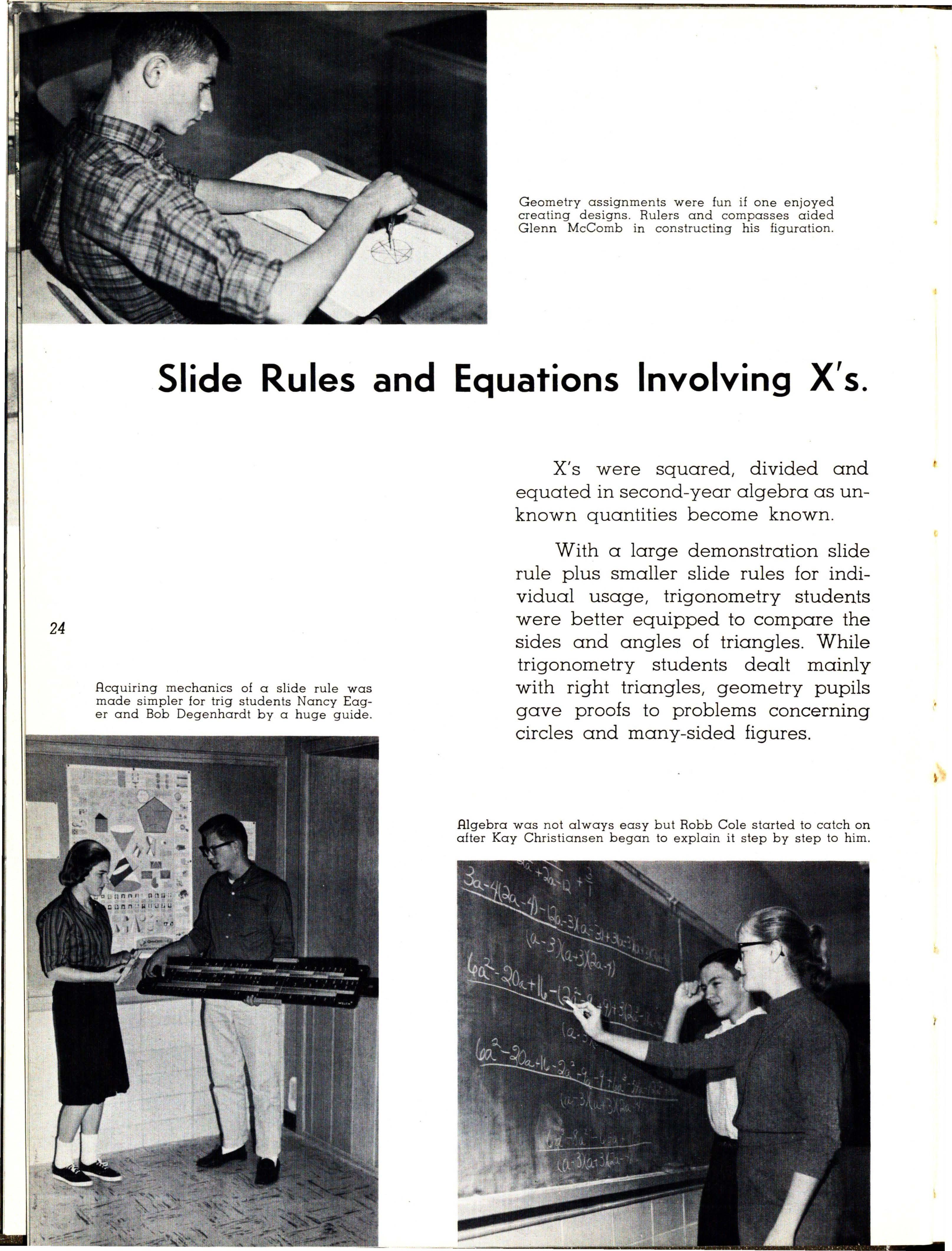 With a large demonstration slide rule plus smaller slide rules for individual usage, trigonometry students were better equipped to compare the sides and angles of triangles. While trigonometry students dealt mainly with right triangles, geometry pupils gave proofs to problems concerning circles and many-sided figures.
