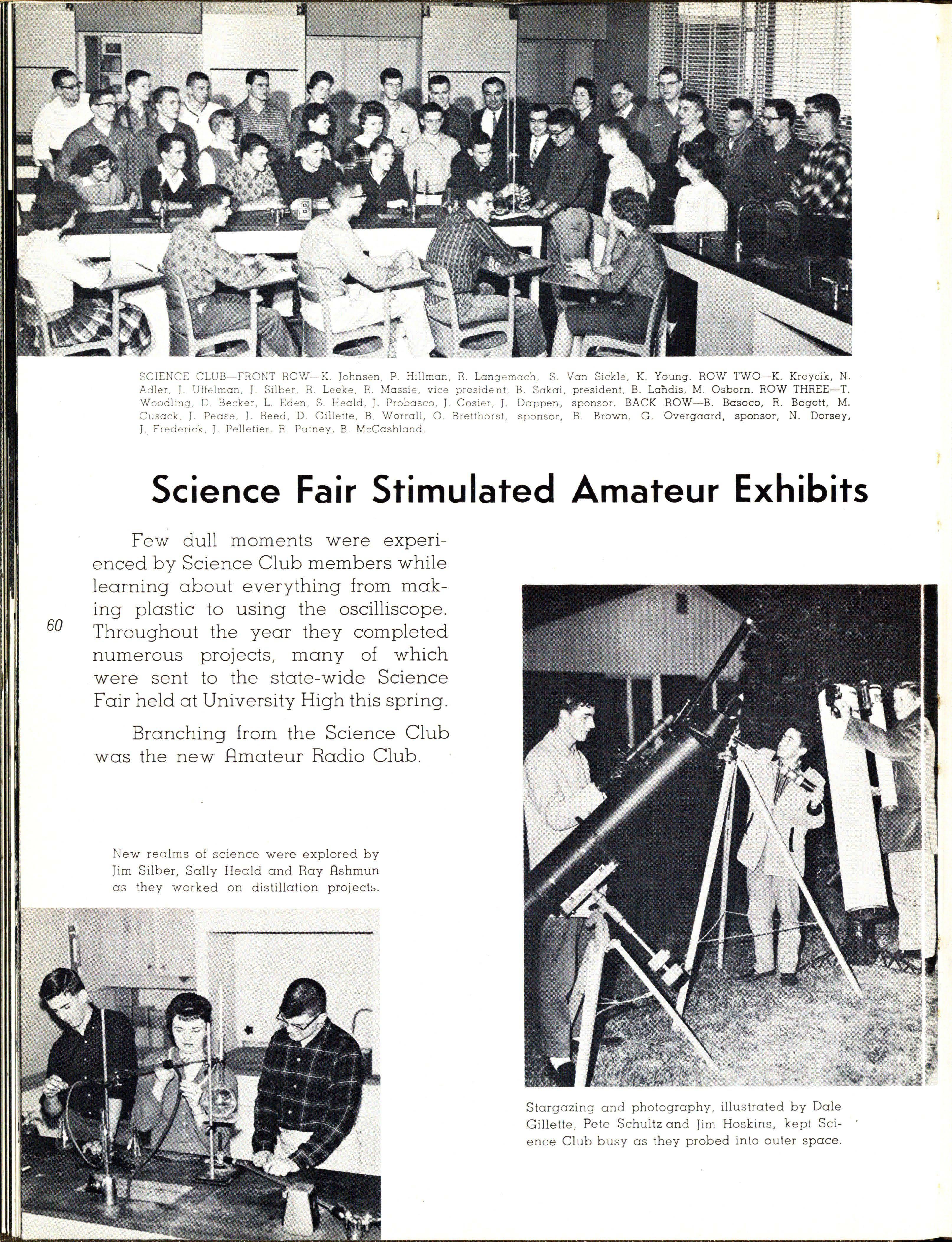 In elementary chemistry valence, elements and theories were discussed along with laboratory experiments which added sparks, fumes and knowledge. Upon passing a college examination, double chemistry students gained six hours of college credit.