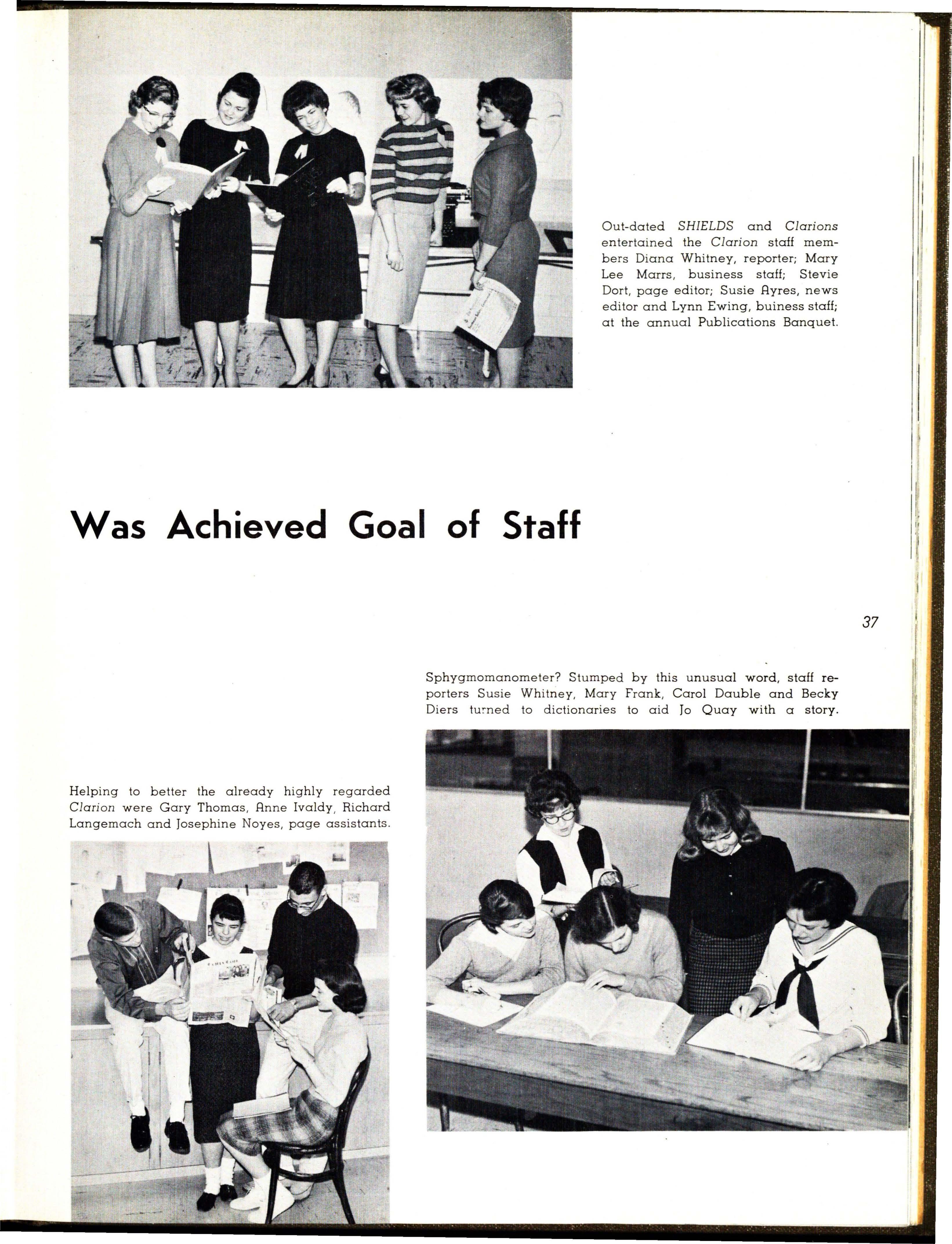 Out-dated SHIELDS and Clarions entertained the Clarion staff members Diana Whitney, reporter; Mary Lee Marrs, business staff; Stevie Dort, page editor; Susie Ayres, news editor and Lynn Ewing, buiness staff; at the annual Publications Banquet.