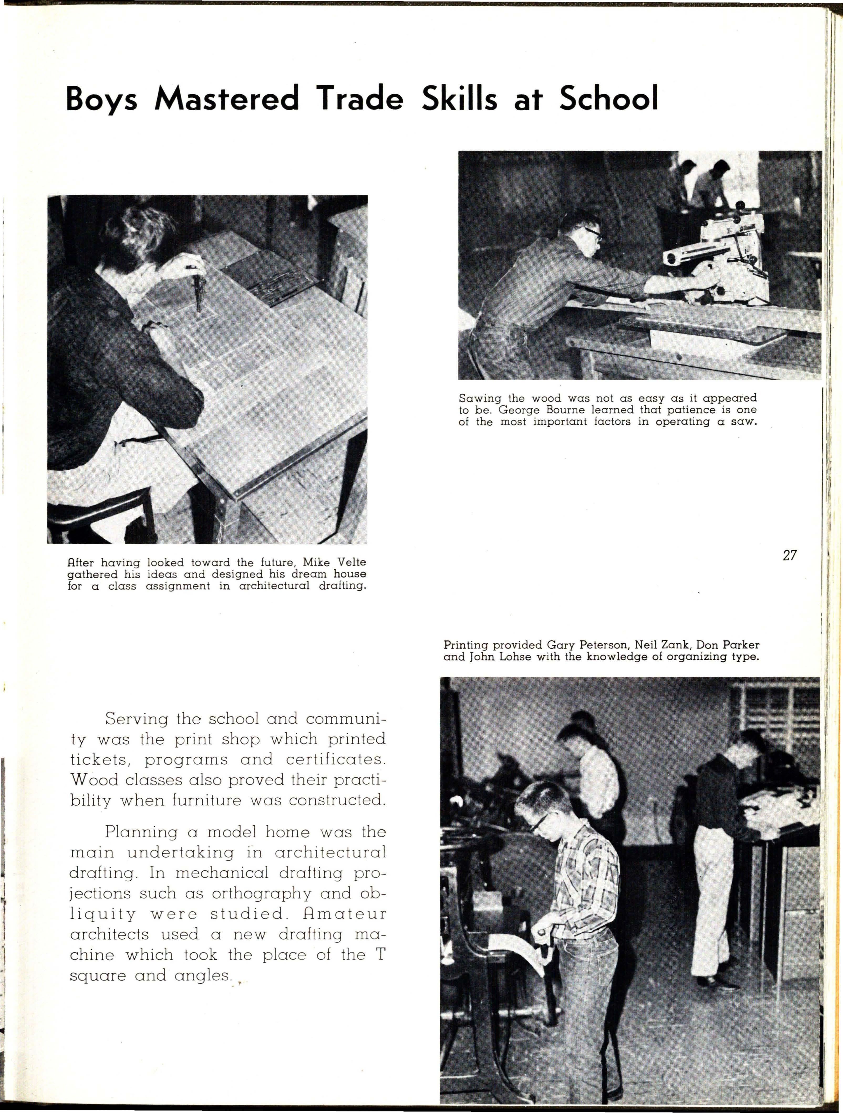 Serving the school and comm unity was the print shop which printed tickets, programs and certificates . W ood classes also proved th e ir practibili ty when furniture was constructed.