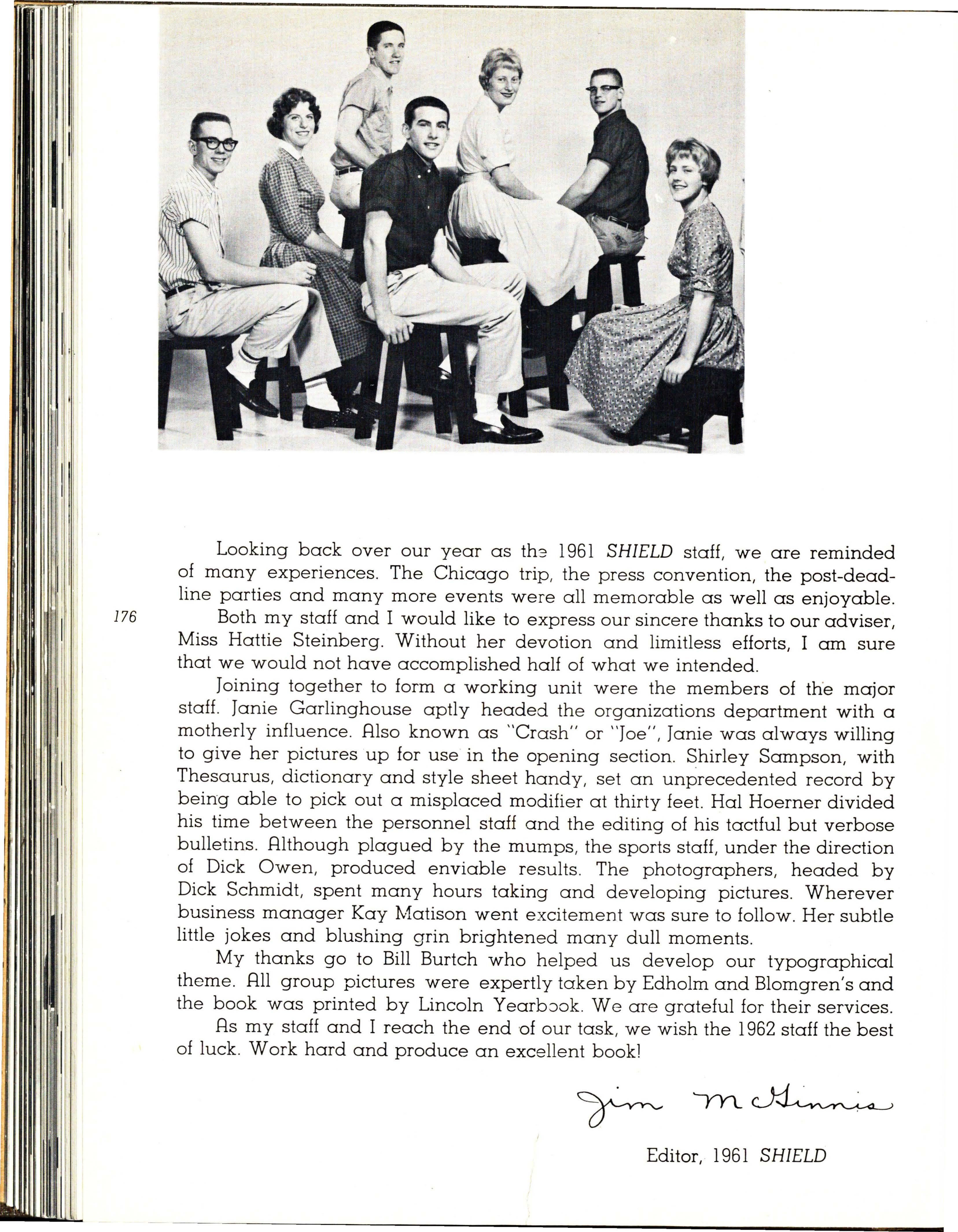 Looking back over our year as th~ 1961 SHIELD staff, we are reminded of many experiences . The Chicago trip , the press convention, the post-deadline parties and many more events were all memorable as well as enjoyable.