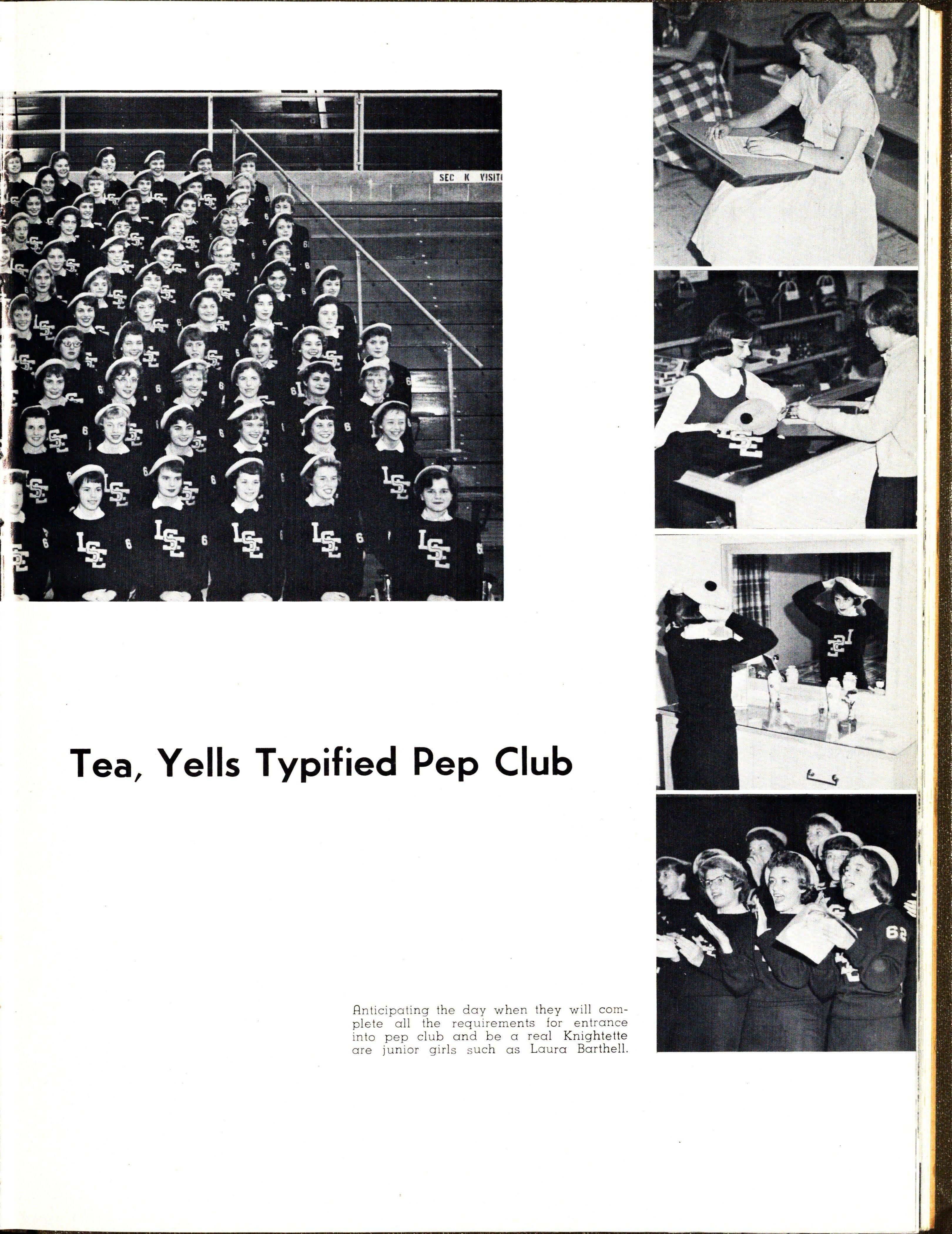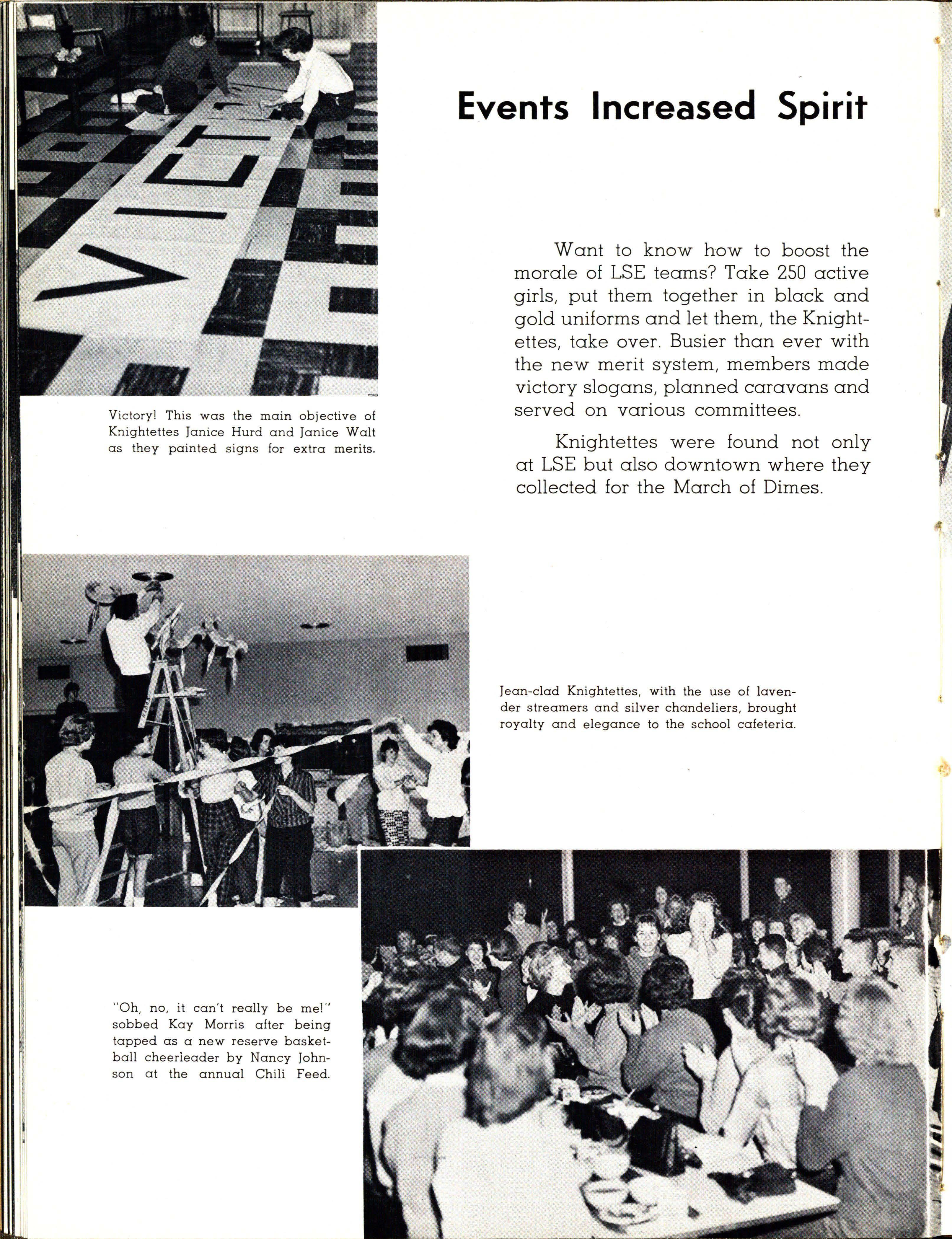 Lending zealous support to every sports event , the Knightettes never lost faith in their Knights Cheerleaders, in black and gold kilts, gave spirit-rousing pep rallies during which speechmaking captains imparted their views on the games to come.