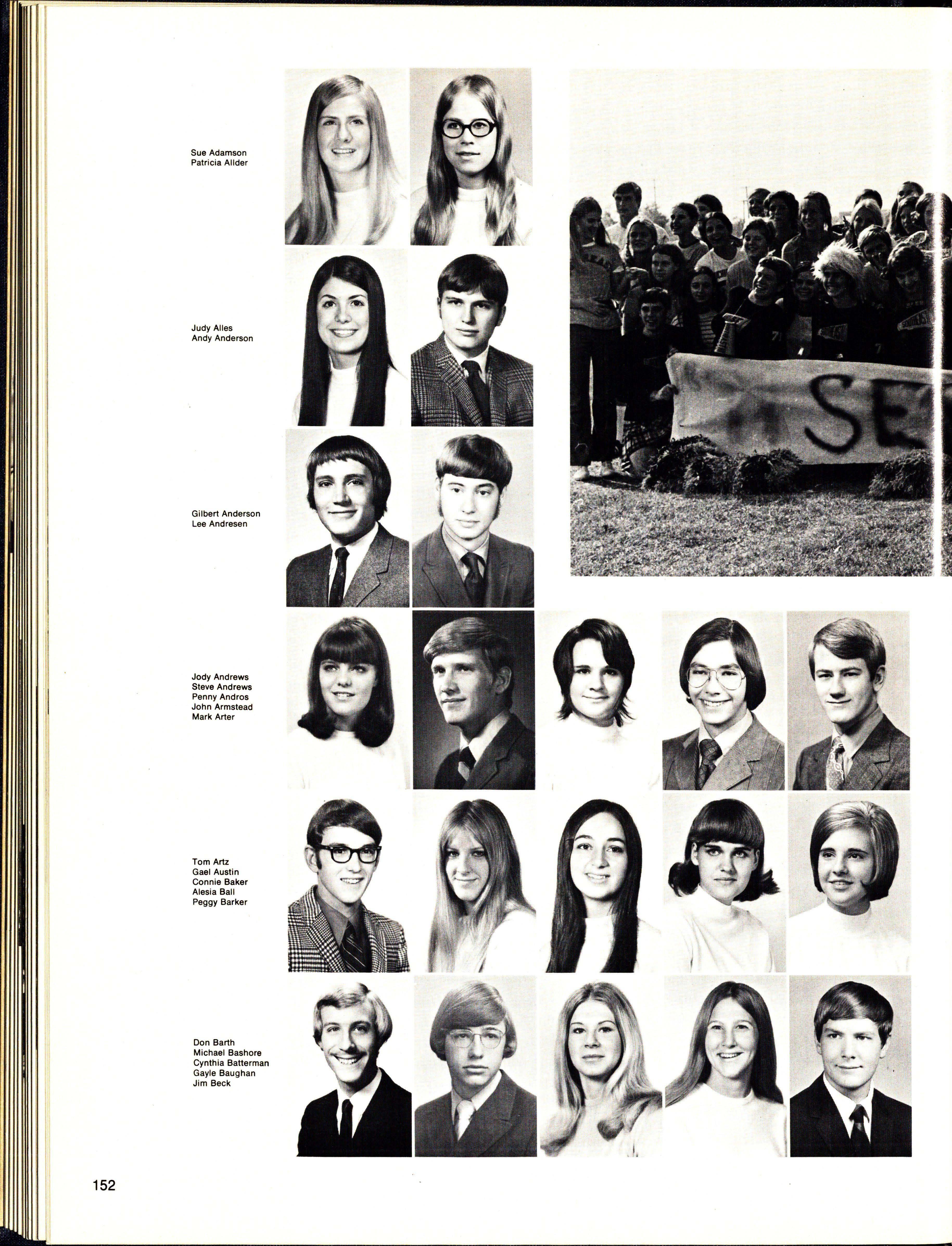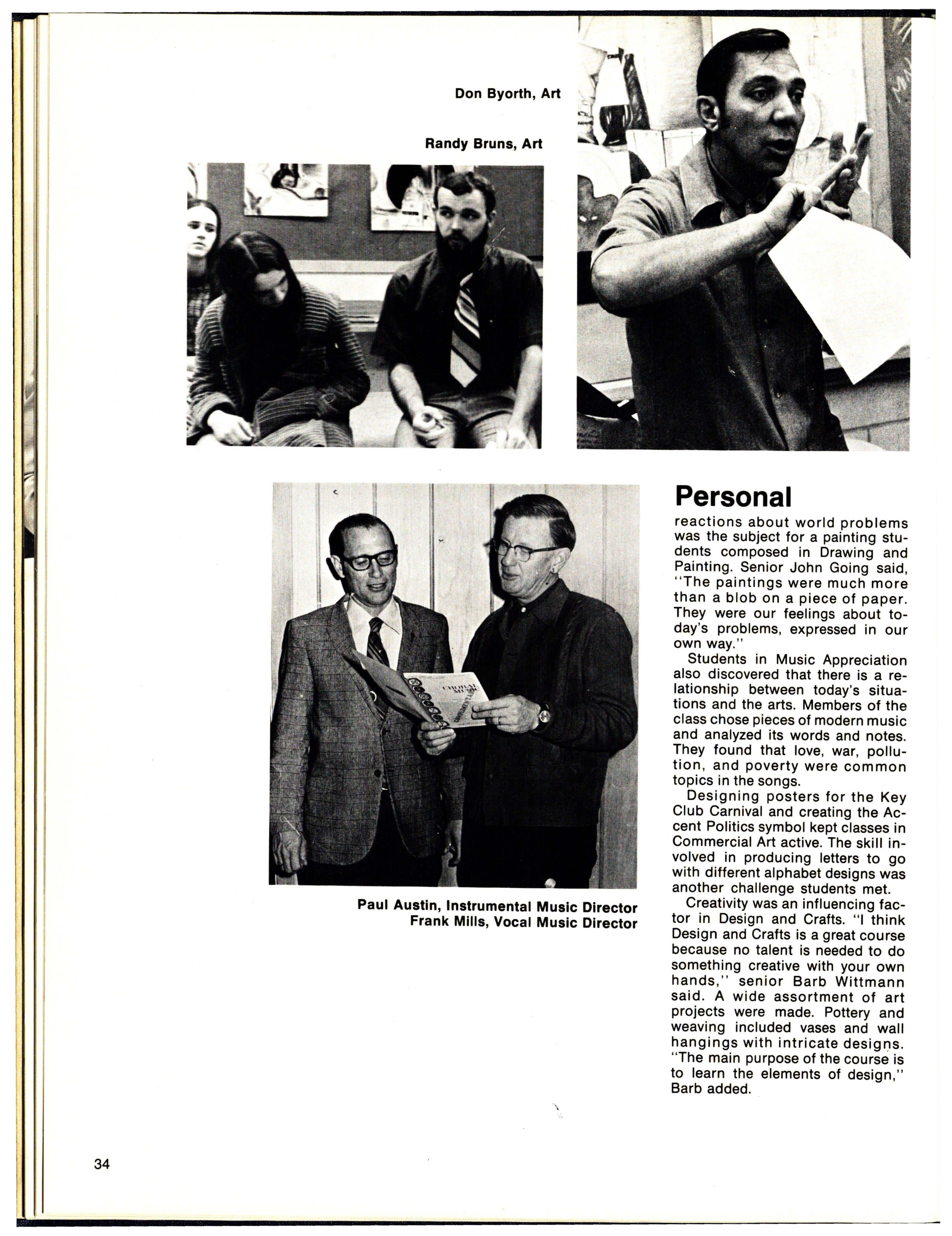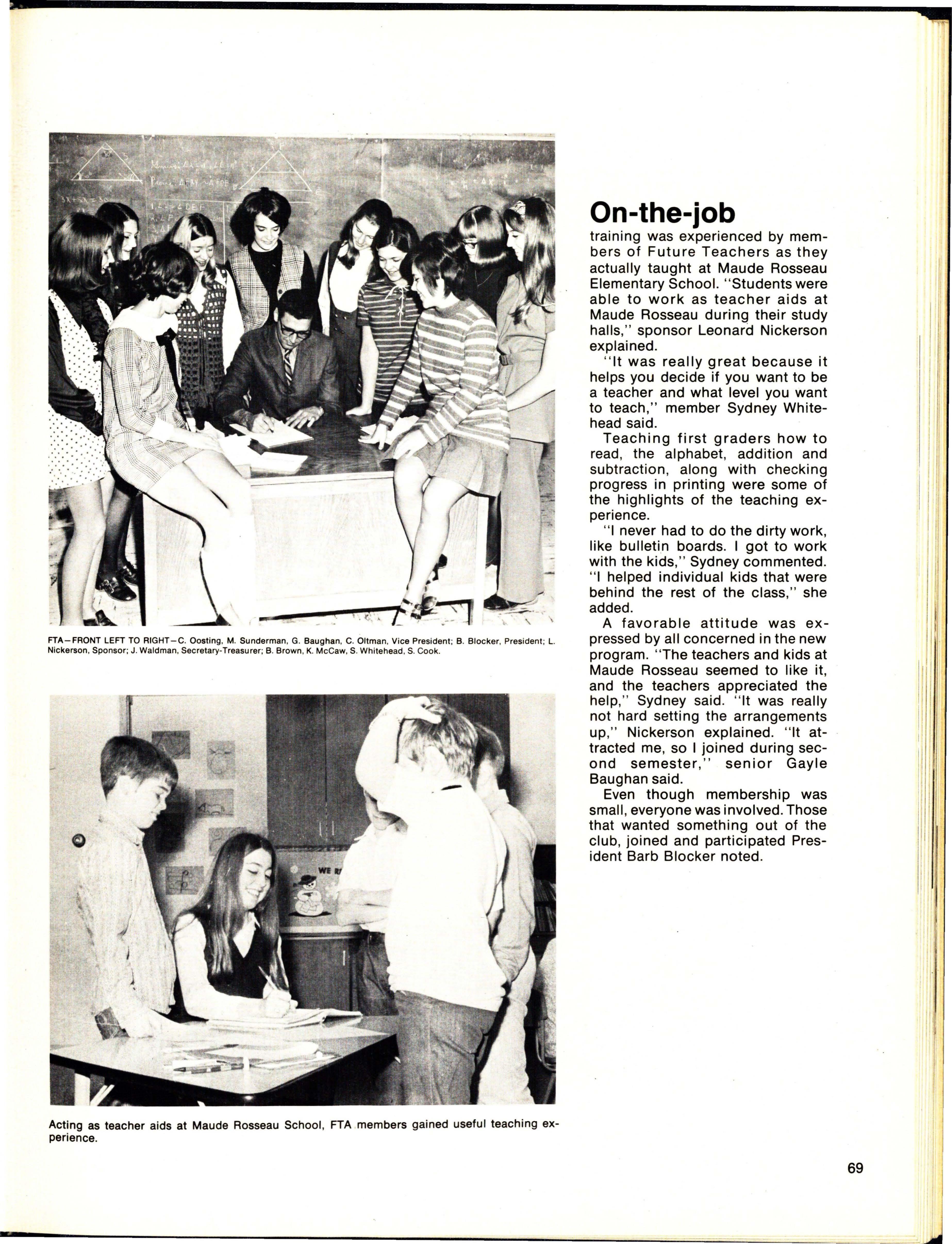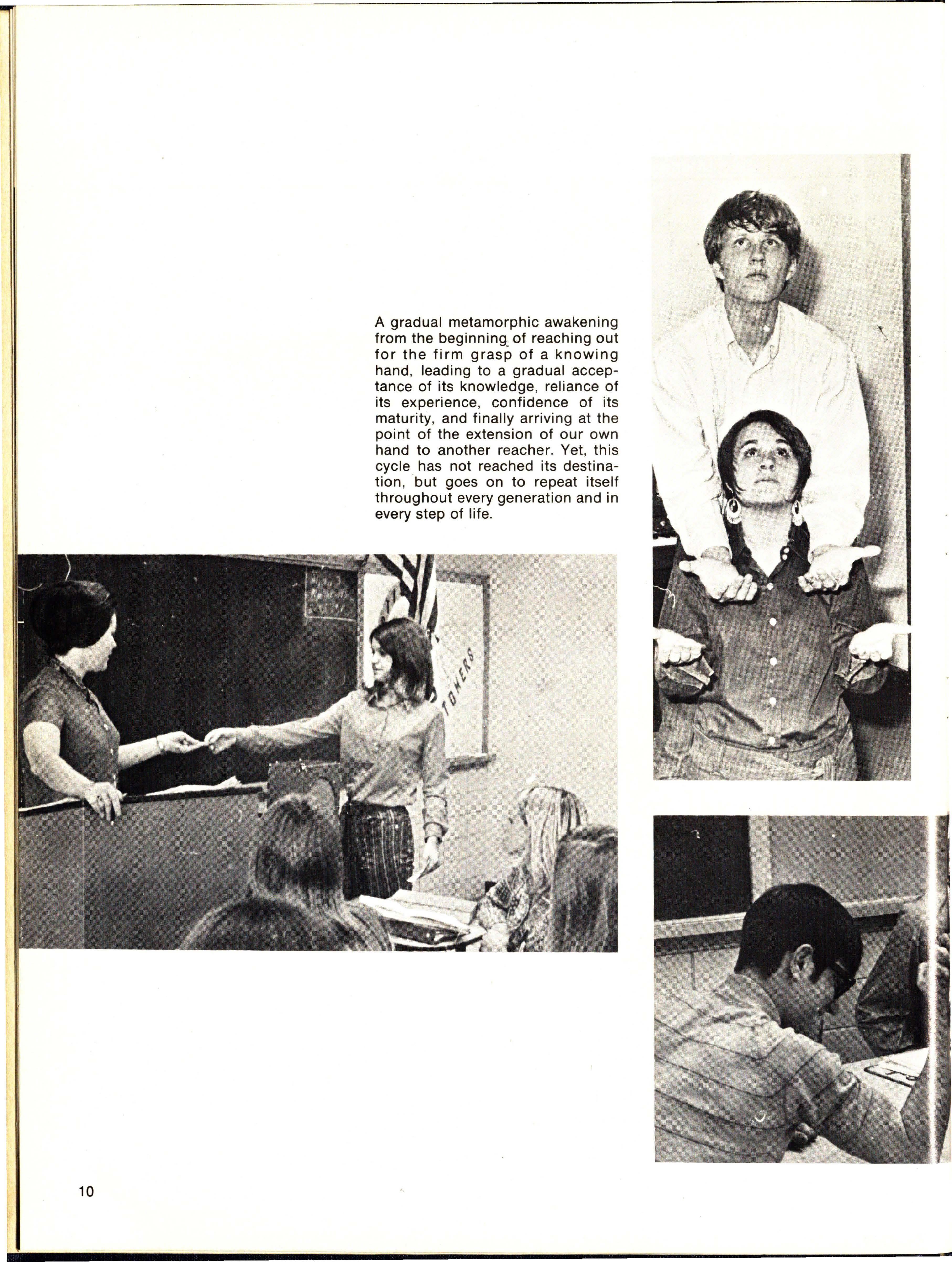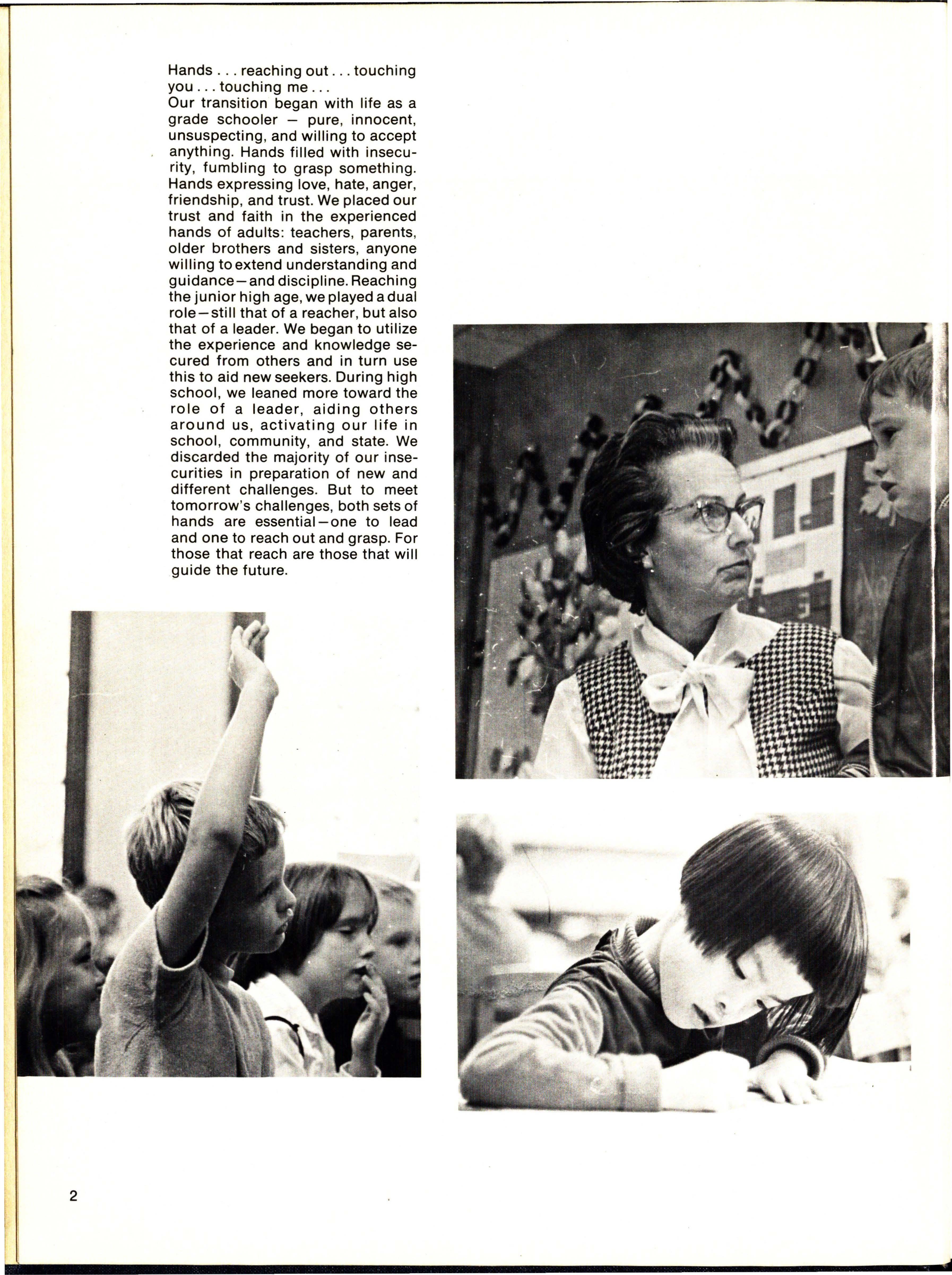 Our transition began with life as a grade schooler - pure , innocent, unsuspecting, and willing to accept anything Hands filled with insecurity , fumbling to grasp something Hands expressing love , hate , anger, friendship , and trust. We placed our trust and faith in the experienced hands of adults: teachers , parents , older brothers and sisters, anyone willing to extend understanding and guidance-and discipline. Reaching the junior high age, we played a dual role-still that of a reacher , but also that of a leader. We began to utilize the experience and knowledge secured from others and in turn use this to aid new seekers. During high school, we leaned more toward the role of a leader, aiding others around us, activating our life in school , community, and state. We discarded the majority of our insecurities in preparation of new and different challenges. But to meet tomorrow ' s challenges , both sets of hands are essential-one to lead and one to reach out and grasp. For those that reach are those that wi II guide the future.