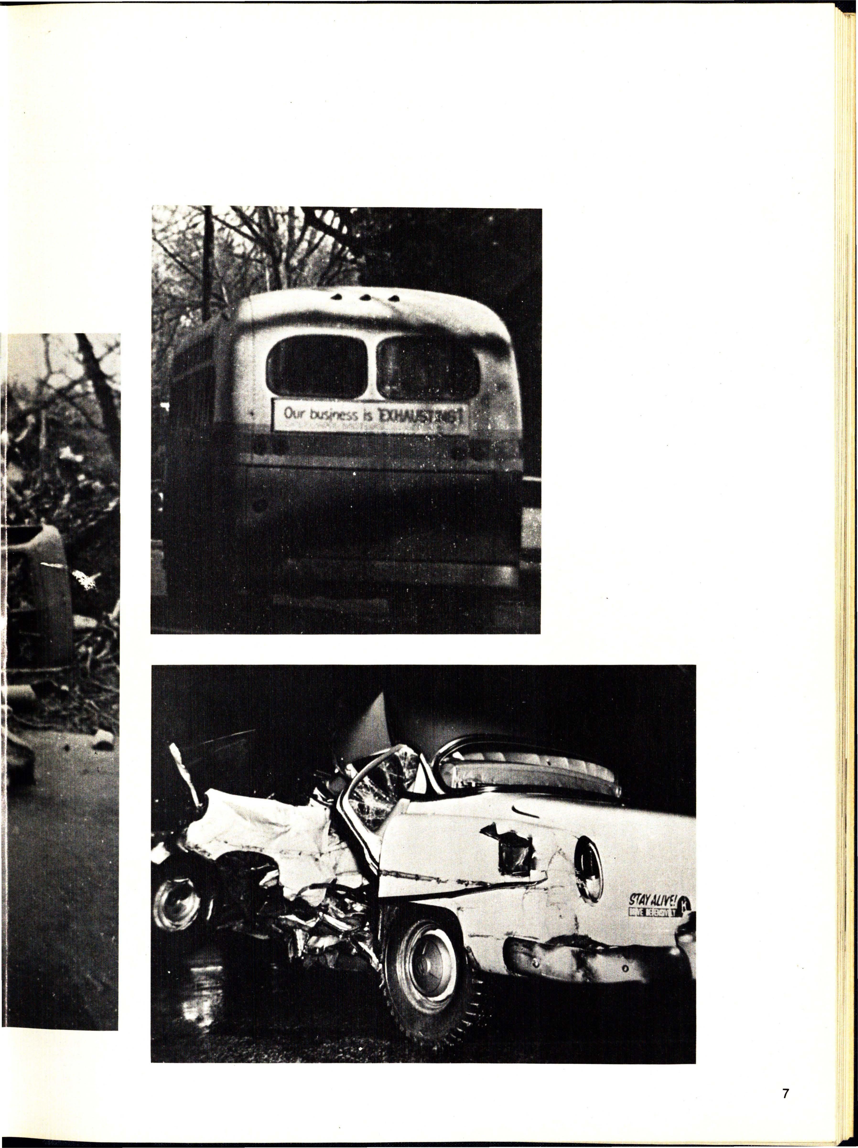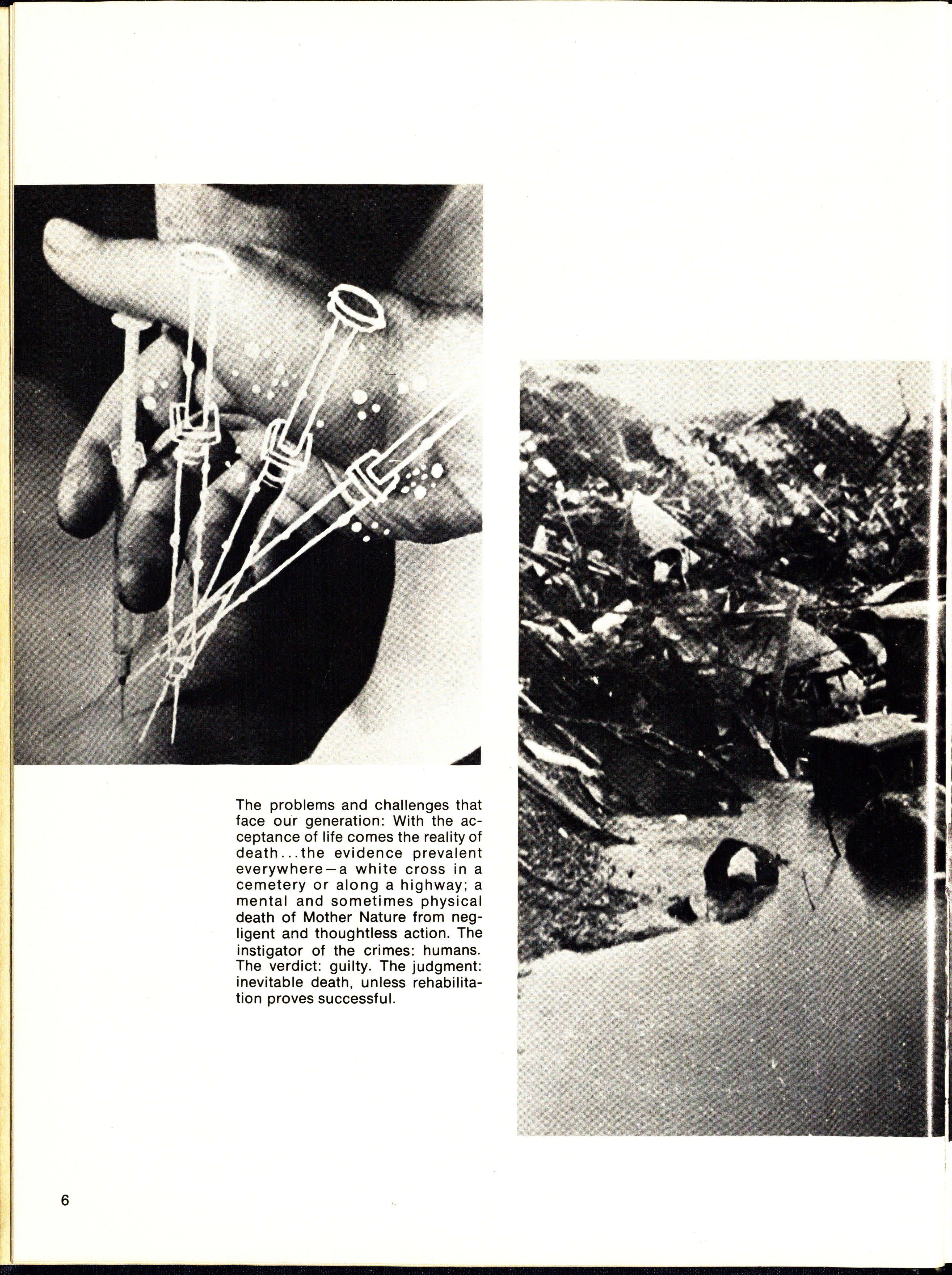 The problems and challenges that face ou r generation: With the acceptance of life comes the reality of death the evidence prevalent everywhere-a white cross in a cemetery or along a highway; a mental and sometimes physical death of Mother Nature from negligent and thoughtless action. The instigator of the crimes: humans. The verdict: guilty. The judgment: inevitable death, unless rehabilitation proves successful.