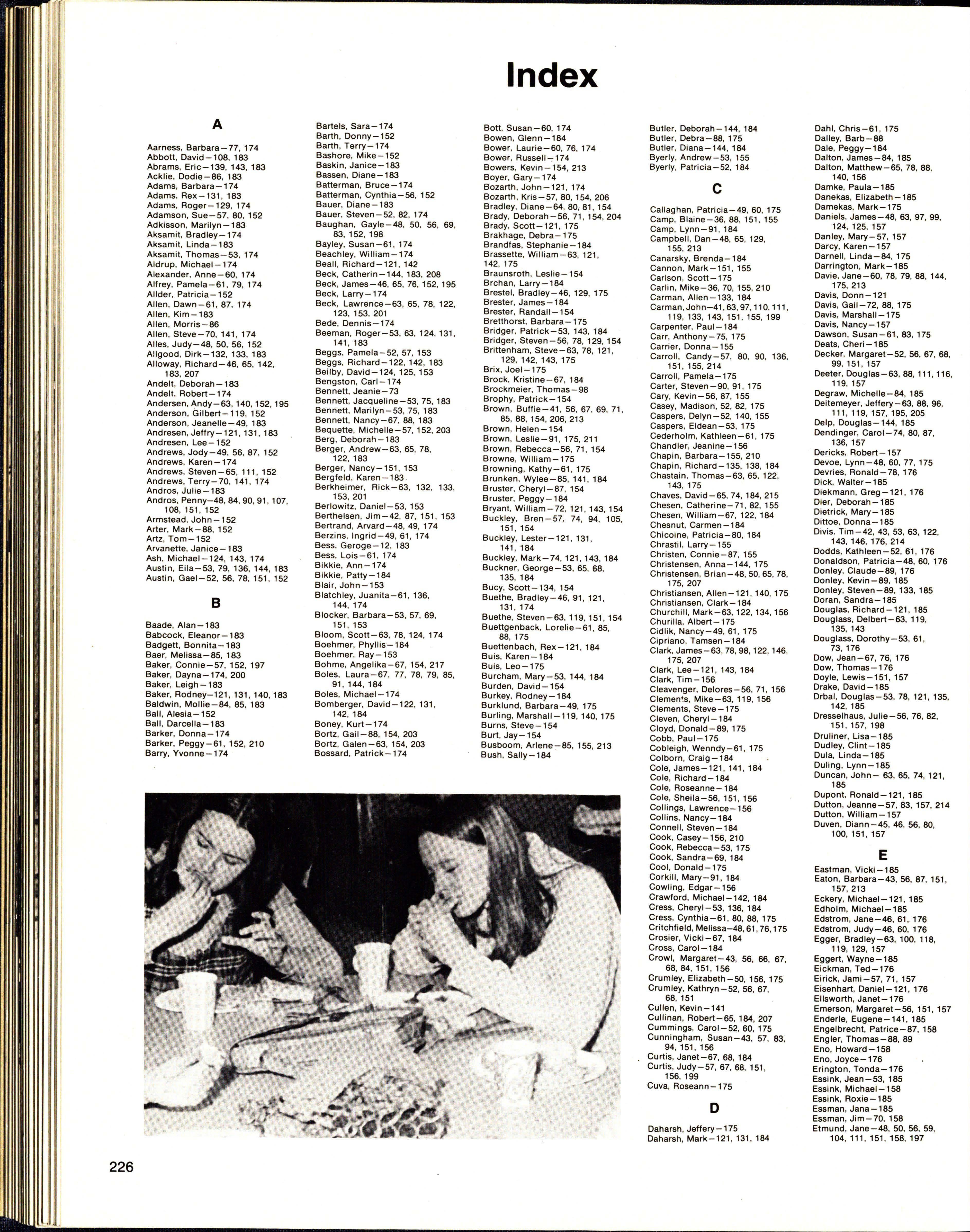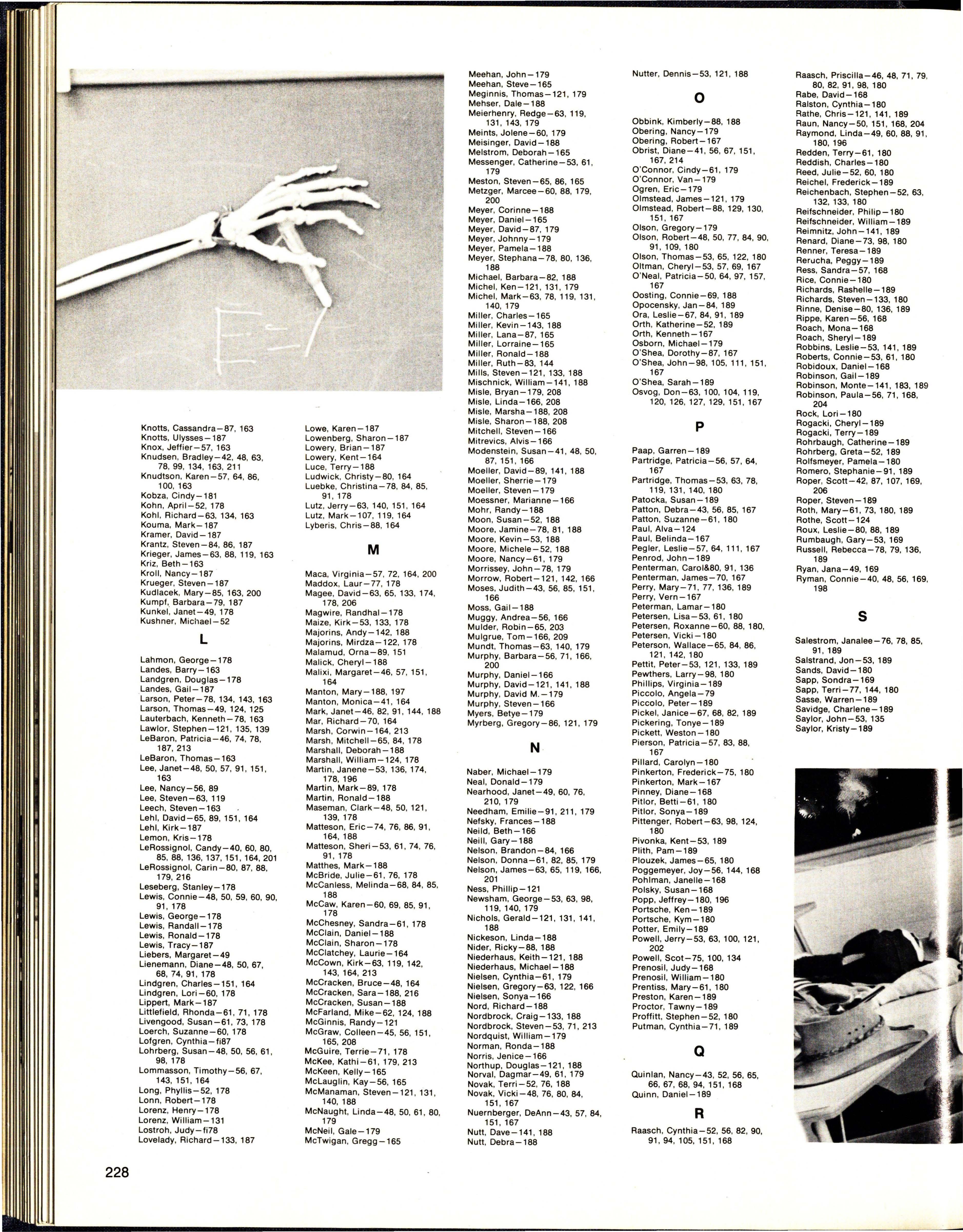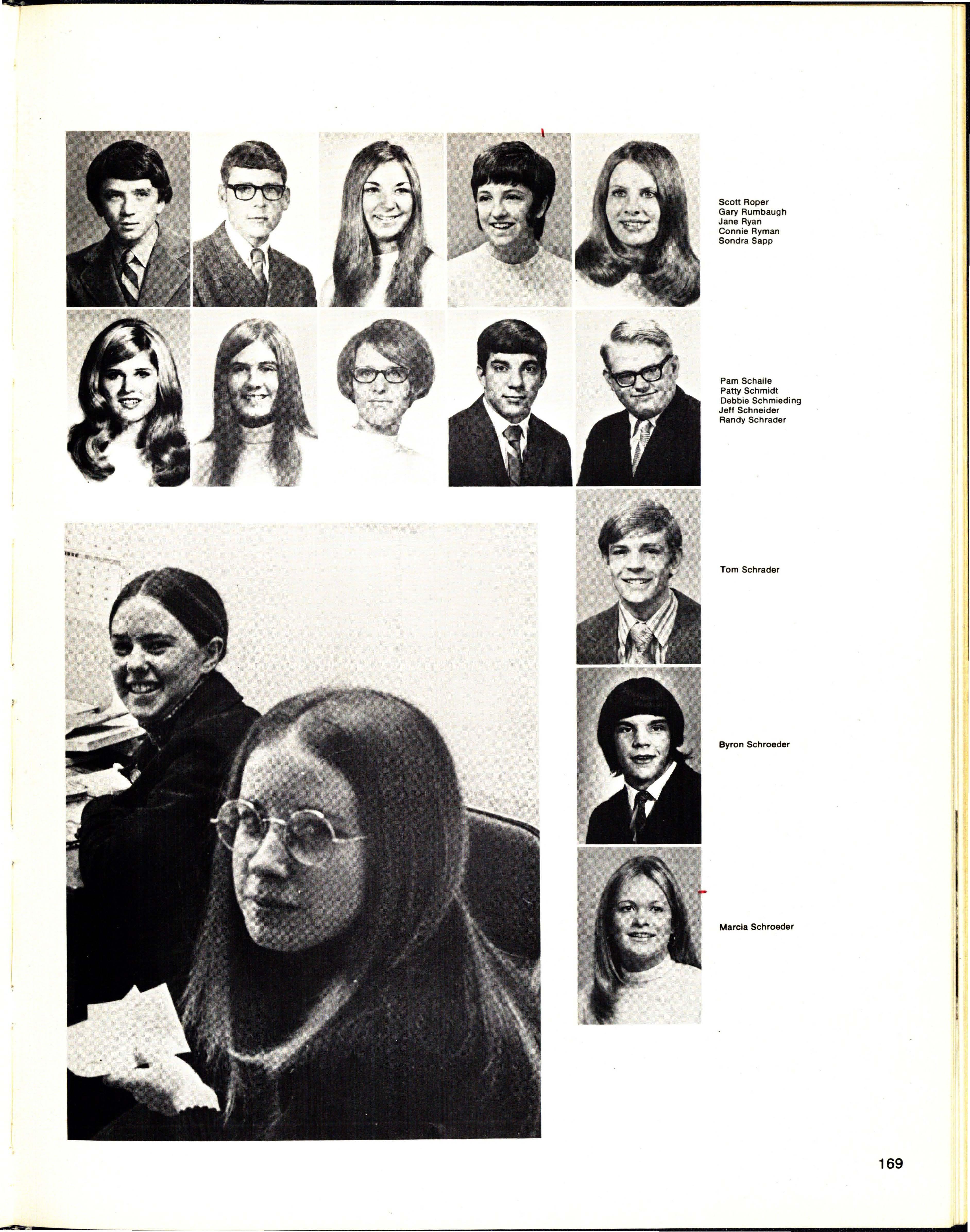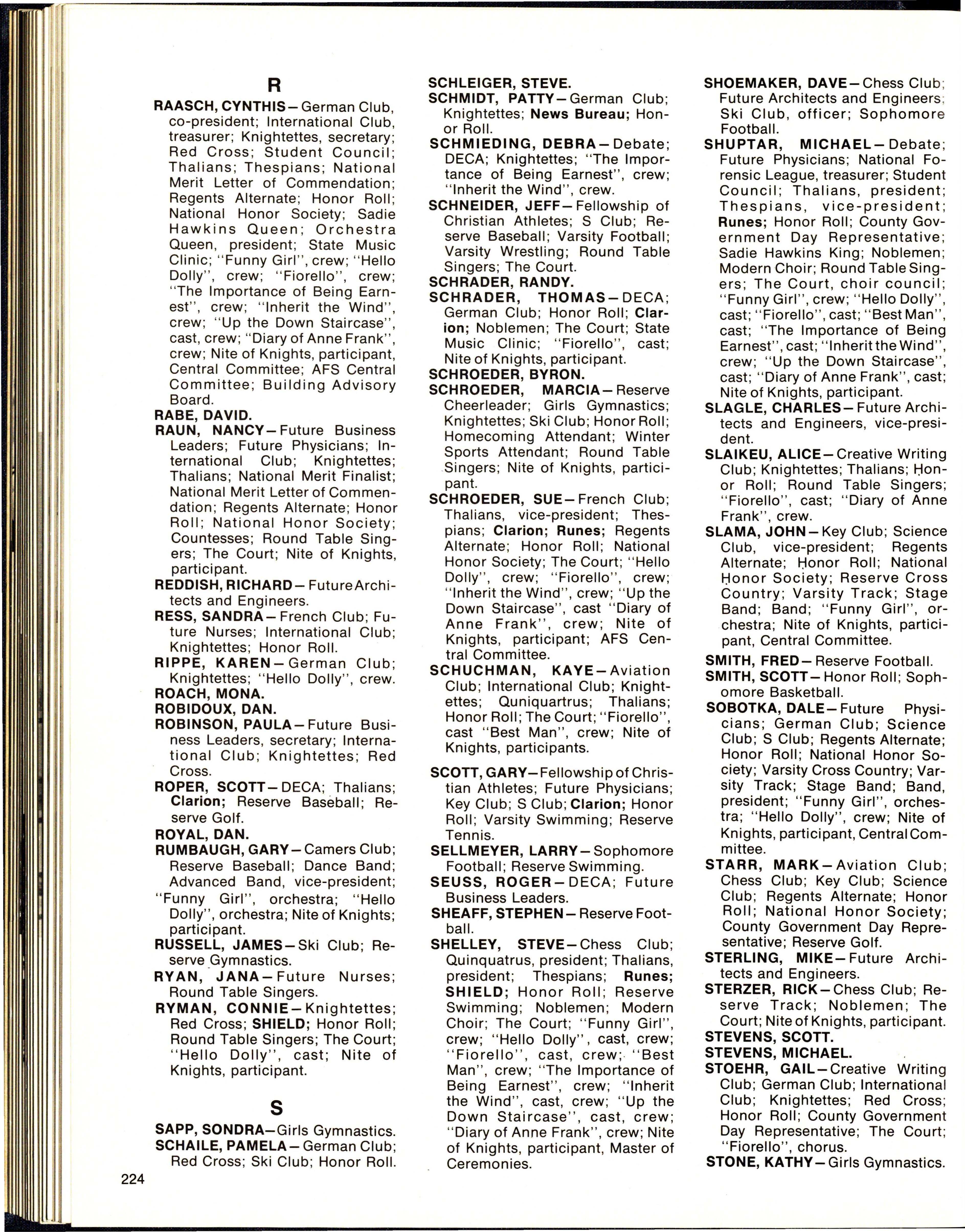 Schaffer, Douglas-131 , 141 , 189 Schaile, Pamela-88, 169 Scheve, Robert-133 , 189 Schleiger, Steven-180 Schleining, Donald-76, 181 Schmahl , James-181 Schmidt Audrey-189 Schmidt Patty-57 169 214 Schm ieding, Debra-56 87 169 Schmitz , Jennifer-189 Schmitz , John-181 Schmohr, Donn -124, 181 Schneiber Randall-53 181 Schneider Cynthia-48 50 144 181 Schneider, Debra-82 , 189 Schneider Paul-48 63, 78 116 118 119 133 169 206 Schoneweis, Andrea-189 Schoonover, Archie-189 Schoonover, Diana-189 Schrader, Randy-169 Schrader, Tom-42 , 48 , 169, 208 Schreiner, David-121 , 142 , 190 Schroeder , Byron -169 Schroeder Criscilla-60, 181 Schroeder, Marcia-56 97 100 169, 208 Schroeder, Susan-42 , 48 , 90 , 151,170,217 Schuchman , Kay-48, 57, 77 , 170 Schuiling , John-181 Schuiling , Tippy-60 , 76 , 181 Schupbach Phillip-84 190 Schwarck Robert-190 Scott Gary-42 63 65, 78 134 135 170 197 211 Seacrest Shawn -136 190 Sebek, Rita-190 Sellmeyer Larry-133 170 Sellner Thomas-87, 181 Selmer Brian-121 143, 190 Sepahpur James-134