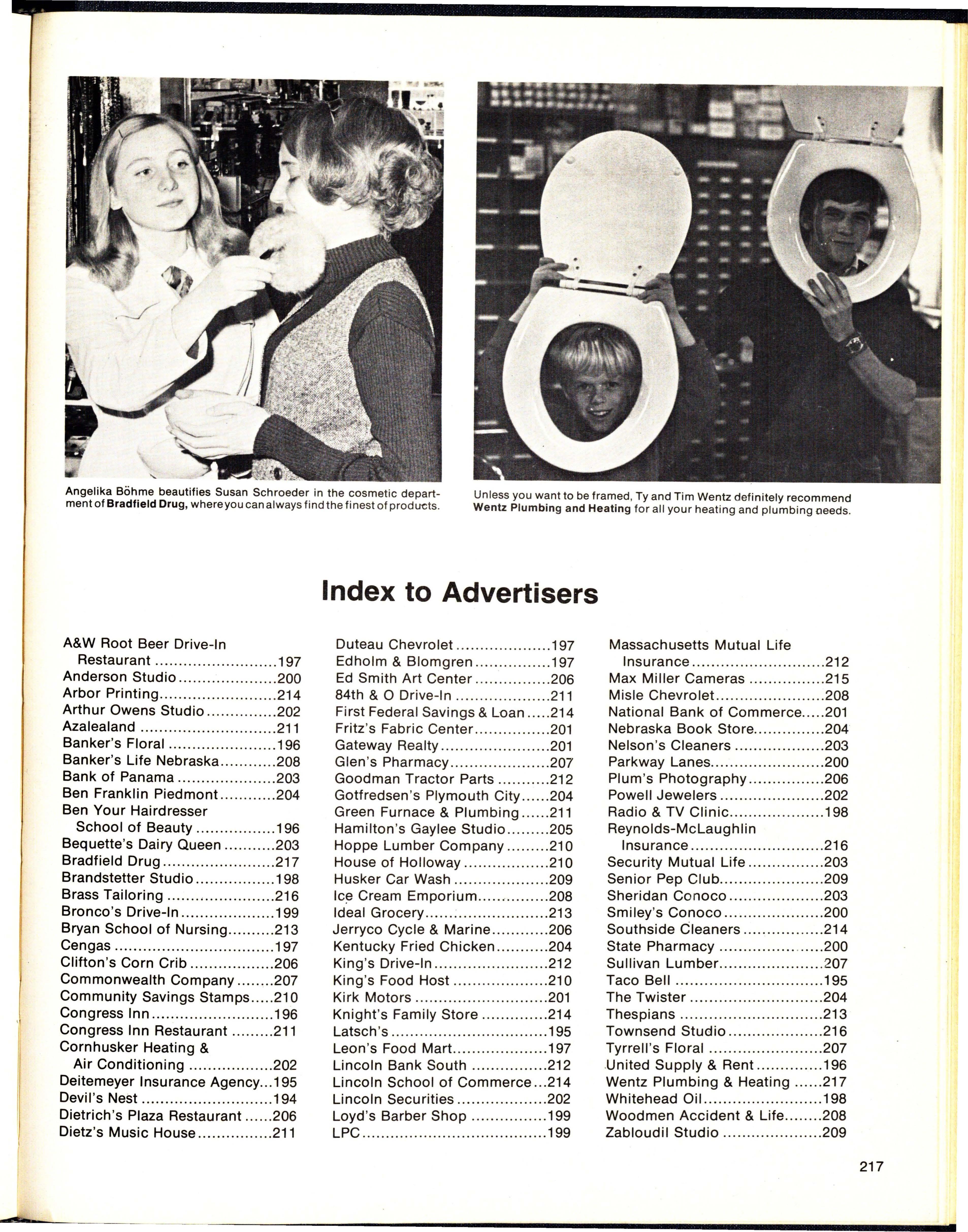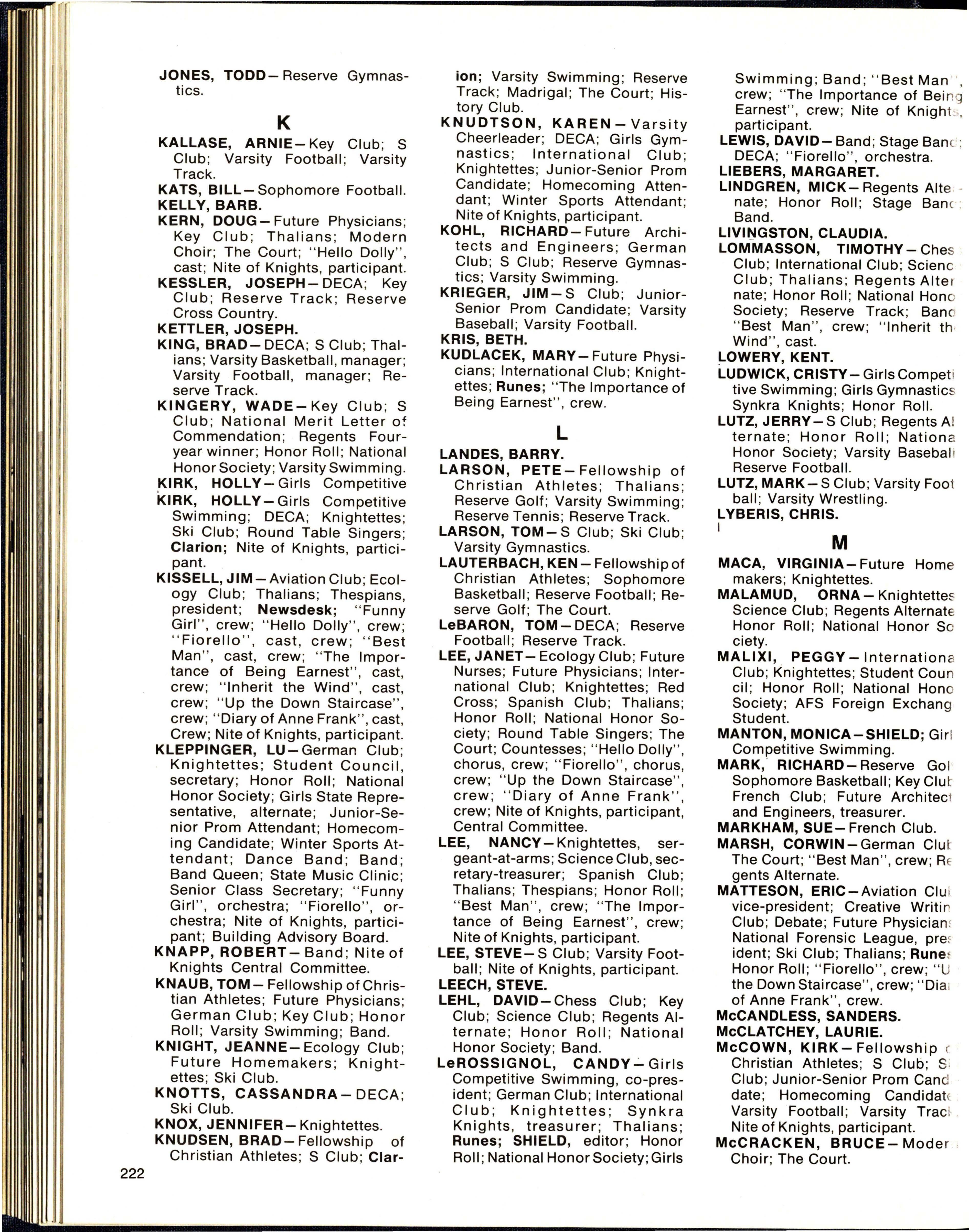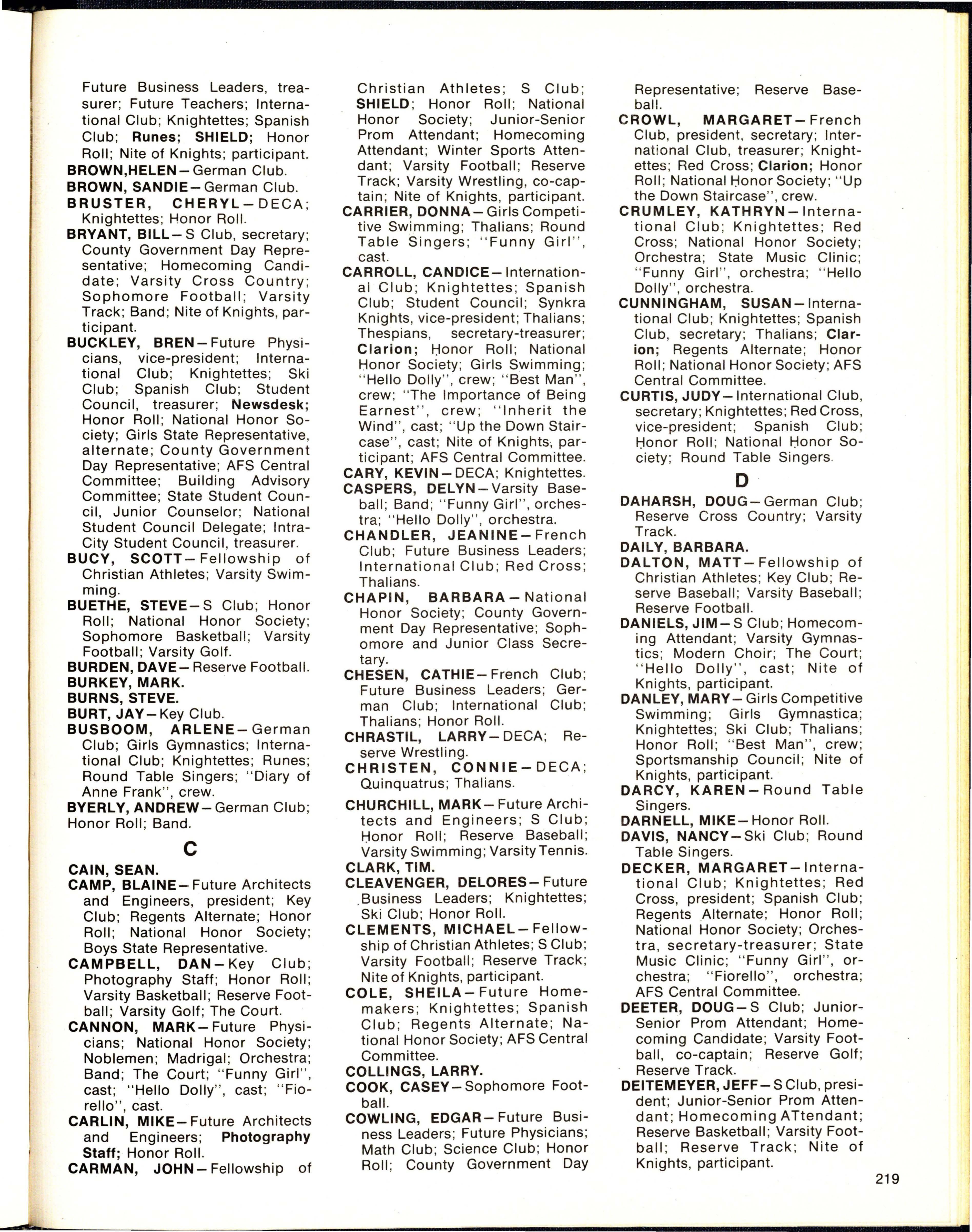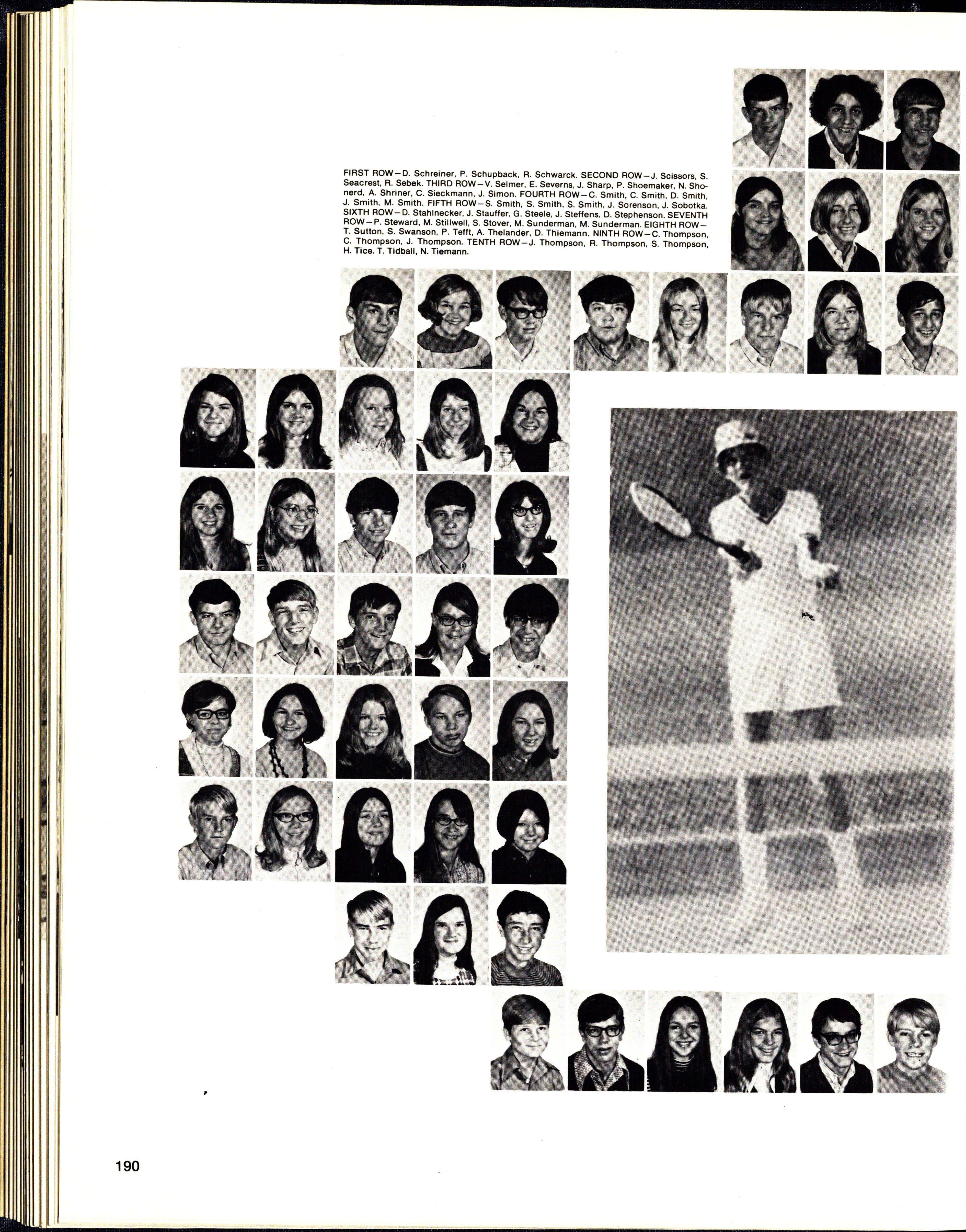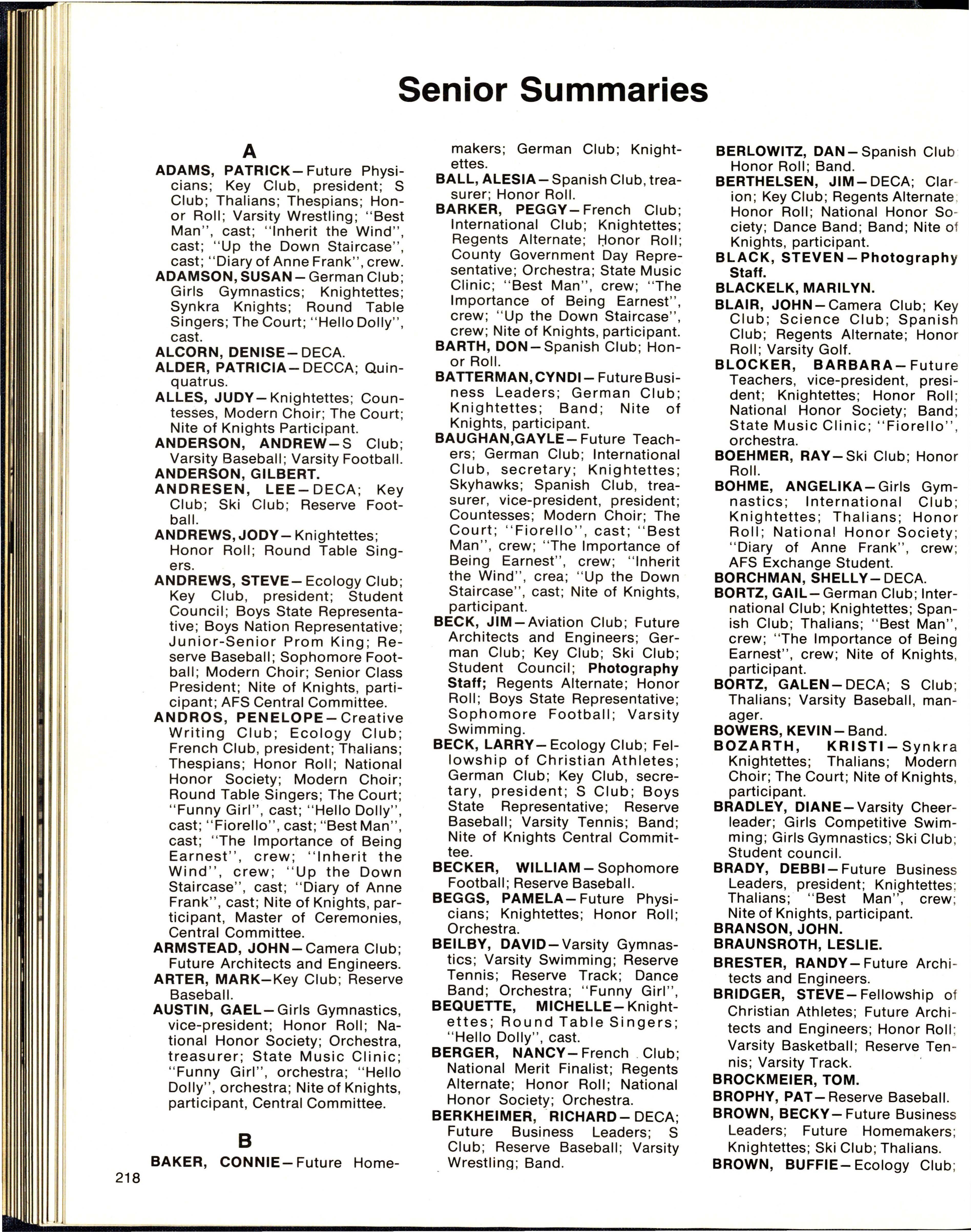 Schaffer, Douglas-131 , 141 , 189 Schaile, Pamela-88, 169 Scheve, Robert-133 , 189 Schleiger, Steven-180 Schleining, Donald-76, 181 Schmahl , James-181 Schmidt Audrey-189 Schmidt Patty-57 169 214 Schm ieding, Debra-56 87 169 Schmitz , Jennifer-189 Schmitz , John-181 Schmohr, Donn -124, 181 Schneiber Randall-53 181 Schneider Cynthia-48 50 144 181 Schneider, Debra-82 , 189 Schneider Paul-48 63, 78 116 118 119 133 169 206 Schoneweis, Andrea-189 Schoonover, Archie-189 Schoonover, Diana-189 Schrader, Randy-169 Schrader, Tom-42 , 48 , 169, 208 Schreiner, David-121 , 142 , 190 Schroeder , Byron -169 Schroeder Criscilla-60, 181 Schroeder, Marcia-56 97 100 169, 208 Schroeder, Susan-42 , 48 , 90 , 151,170,217 Schuchman , Kay-48, 57, 77 , 170 Schuiling , John-181 Schuiling , Tippy-60 , 76 , 181 Schupbach Phillip-84 190 Schwarck Robert-190 Scott Gary-42 63 65, 78 134 135 170 197 211 Seacrest Shawn -136 190 Sebek, Rita-190 Sellmeyer Larry-133 170 Sellner Thomas-87, 181 Selmer Brian-121 143, 190 Sepahpur James-134