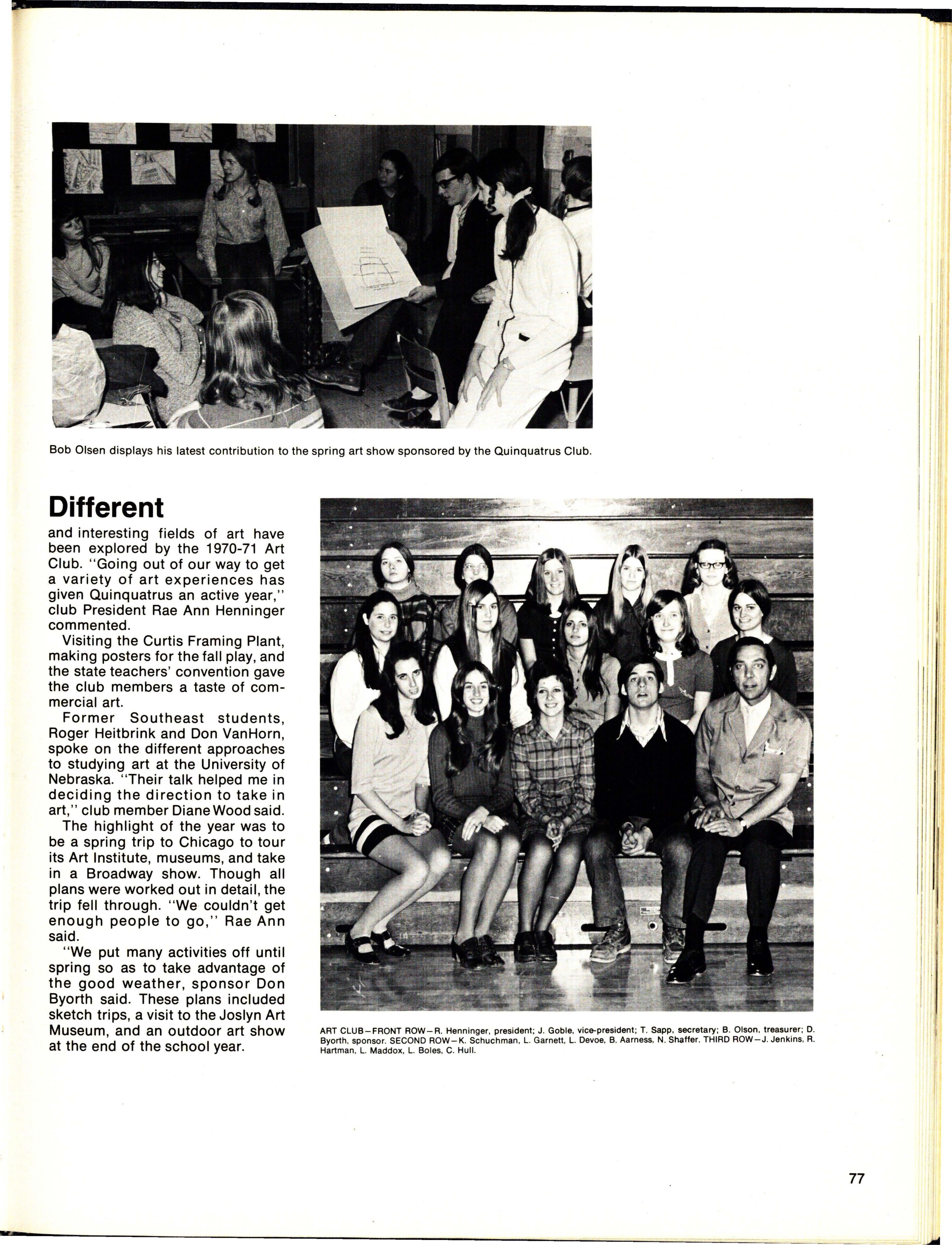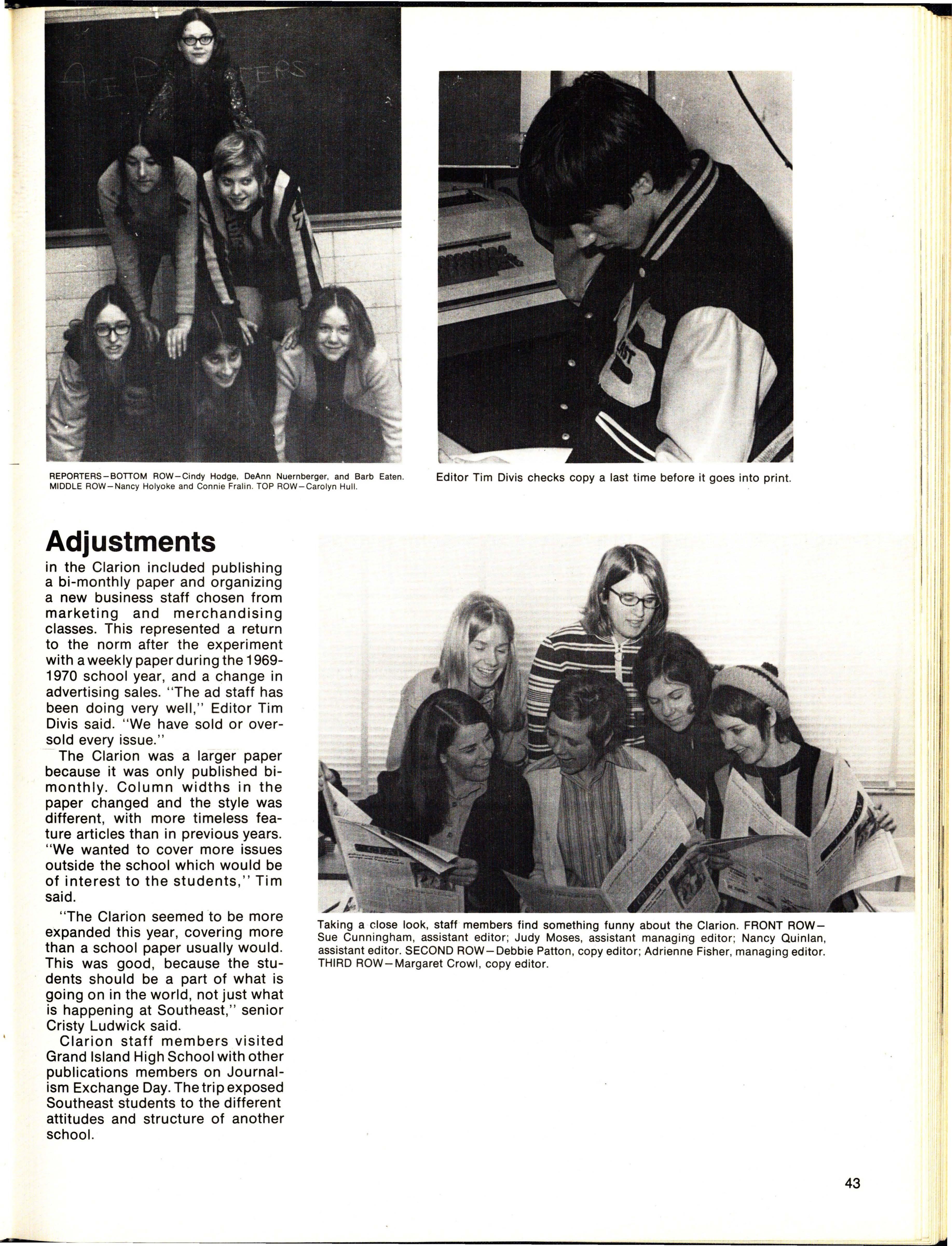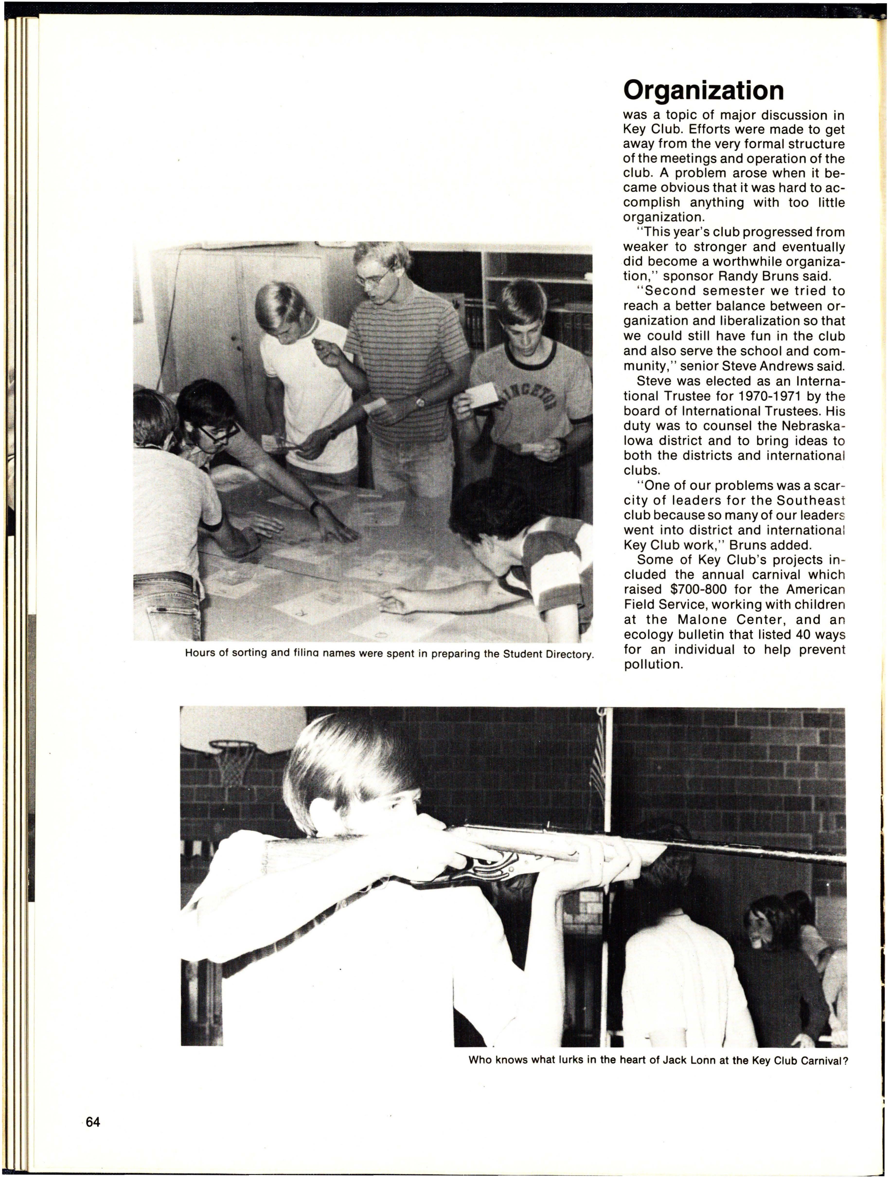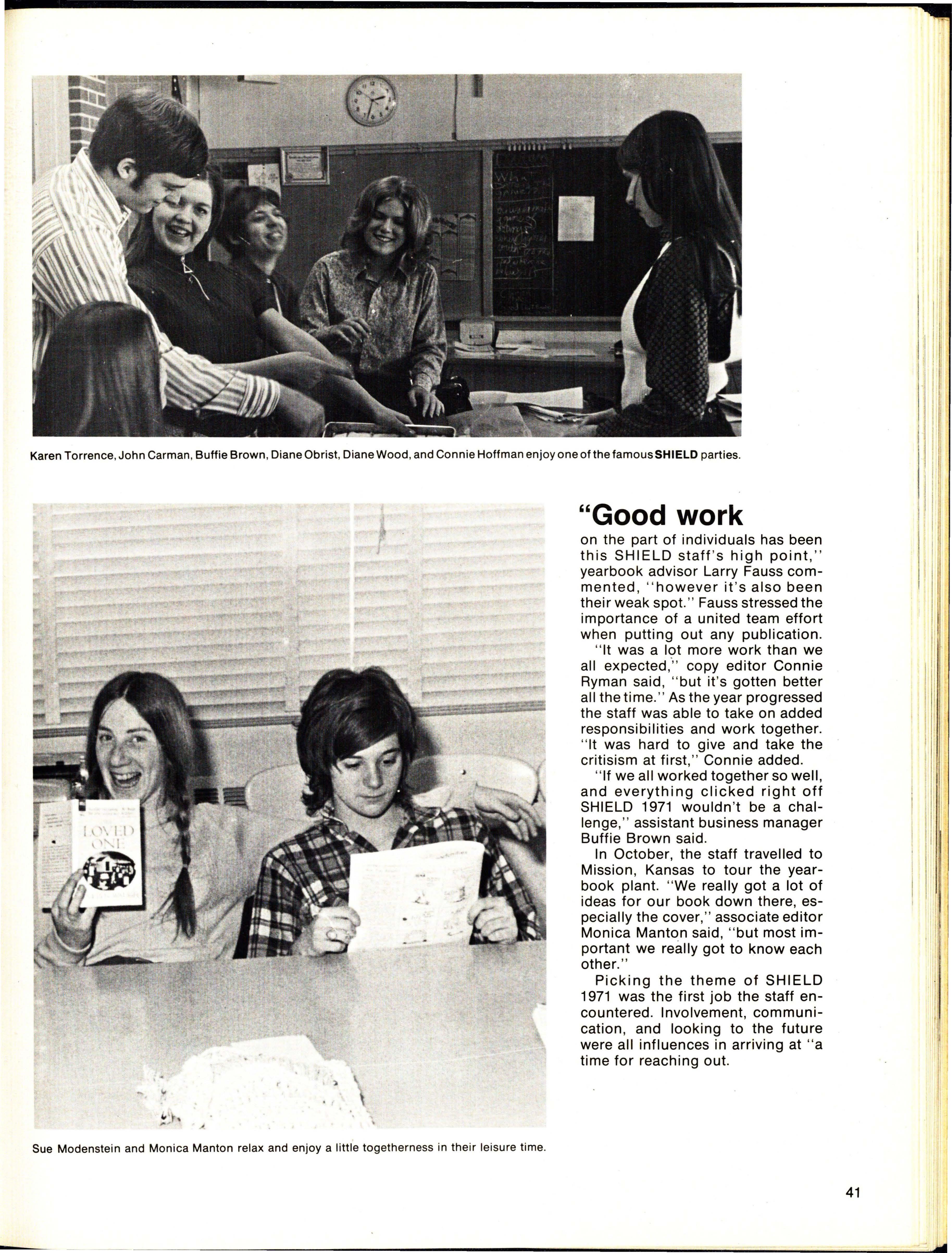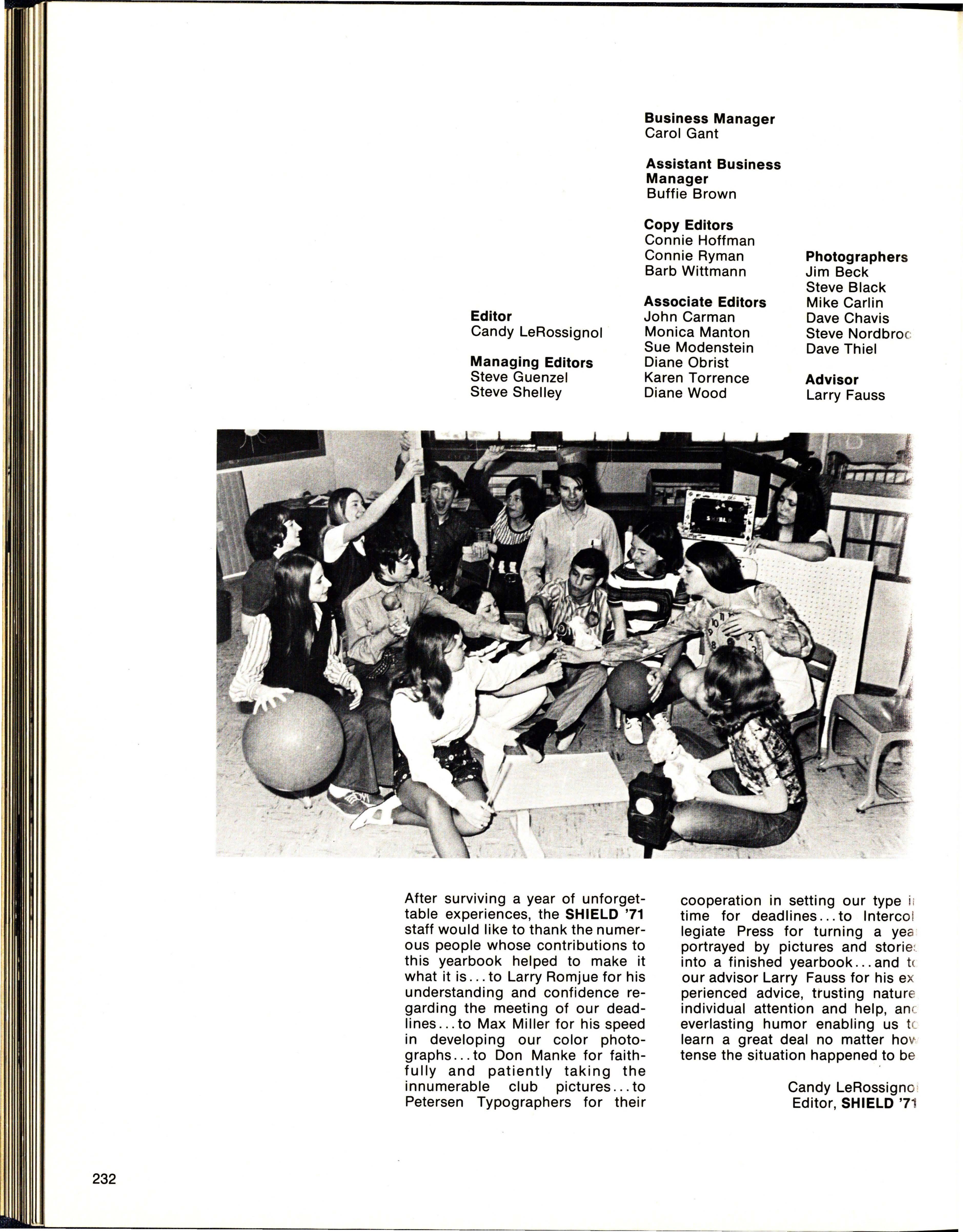 After surviving a year of unforgettable experiences, the SHIELD '71 staff would like to thank the numerous people whose contributions to this yearbook helped to make it what it is to Larry Romjue for his understanding and confidence regarding the meeting of our deadlines to Max Miller for his speed in developing our color photographs to Don Manke for faithf u I ly and patiently taking the innumerable club pictures to Petersen Typographers for their