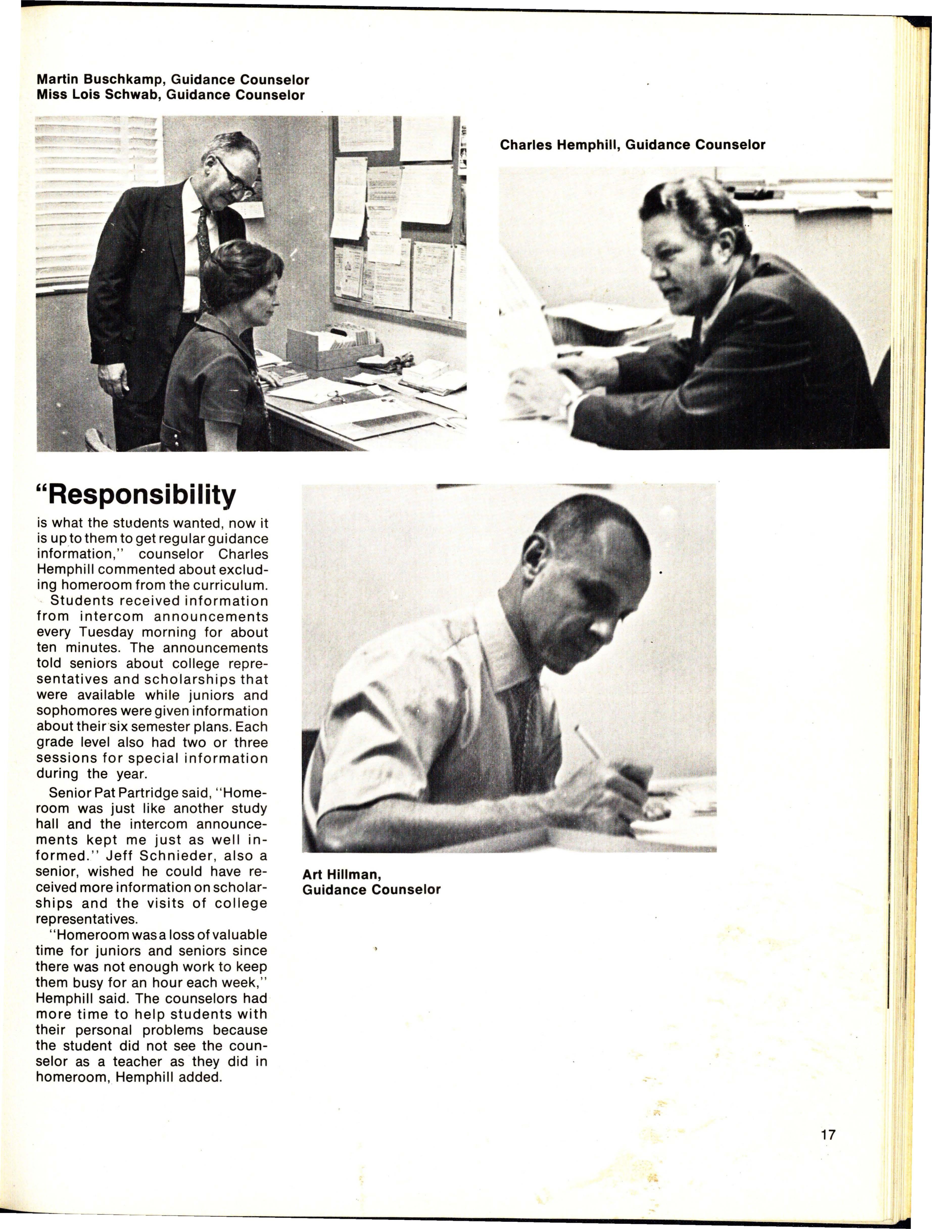 "Homeroom was a loss of valuable time for juniors and seniors since there was not enough work to keep them busy for an hour each week," Hemphill said. The counselors had more time to help students with their personal problems because the student did not see the counselor as a teacher as they did in homeroom, Hemphill added.