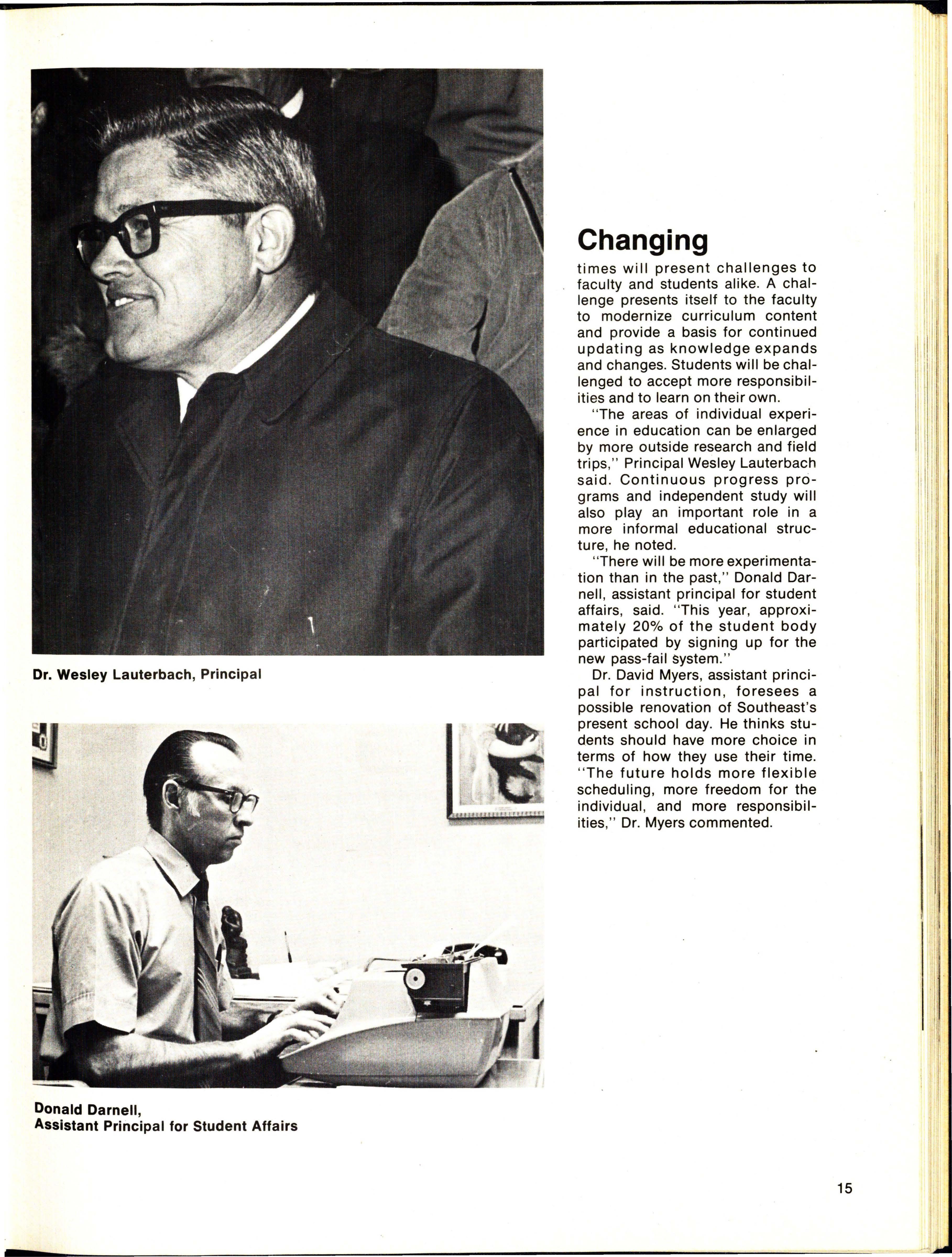 Dr. David Myers, assistant principal for instruction, foresees a possible renovation of Southeast's present school day . He thinks students should have more choice in terms of how they use their time. " The future holds more flexible scheduling, more freedom for the individual, and more responsibilities ," Dr. Myers commented.