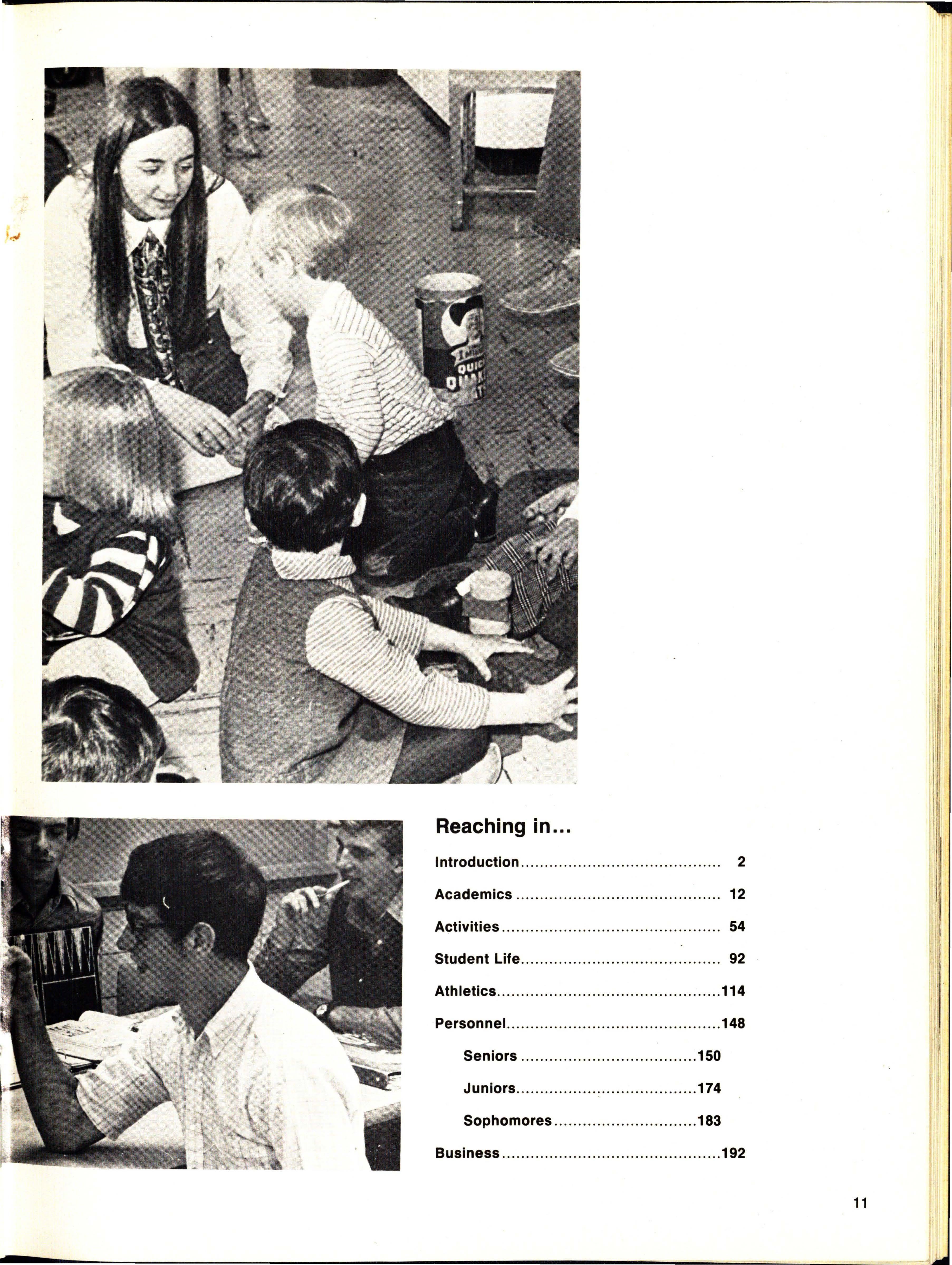 Reaching in ... Introduction..... 2 Academics 12 Activities 54 Student Life............ ..... ......................... 92 Athletics 114 Personnel. 148 Seniors 150 Juniors 174 Sophomores ... .................... .. ..... 183 Business 192 11