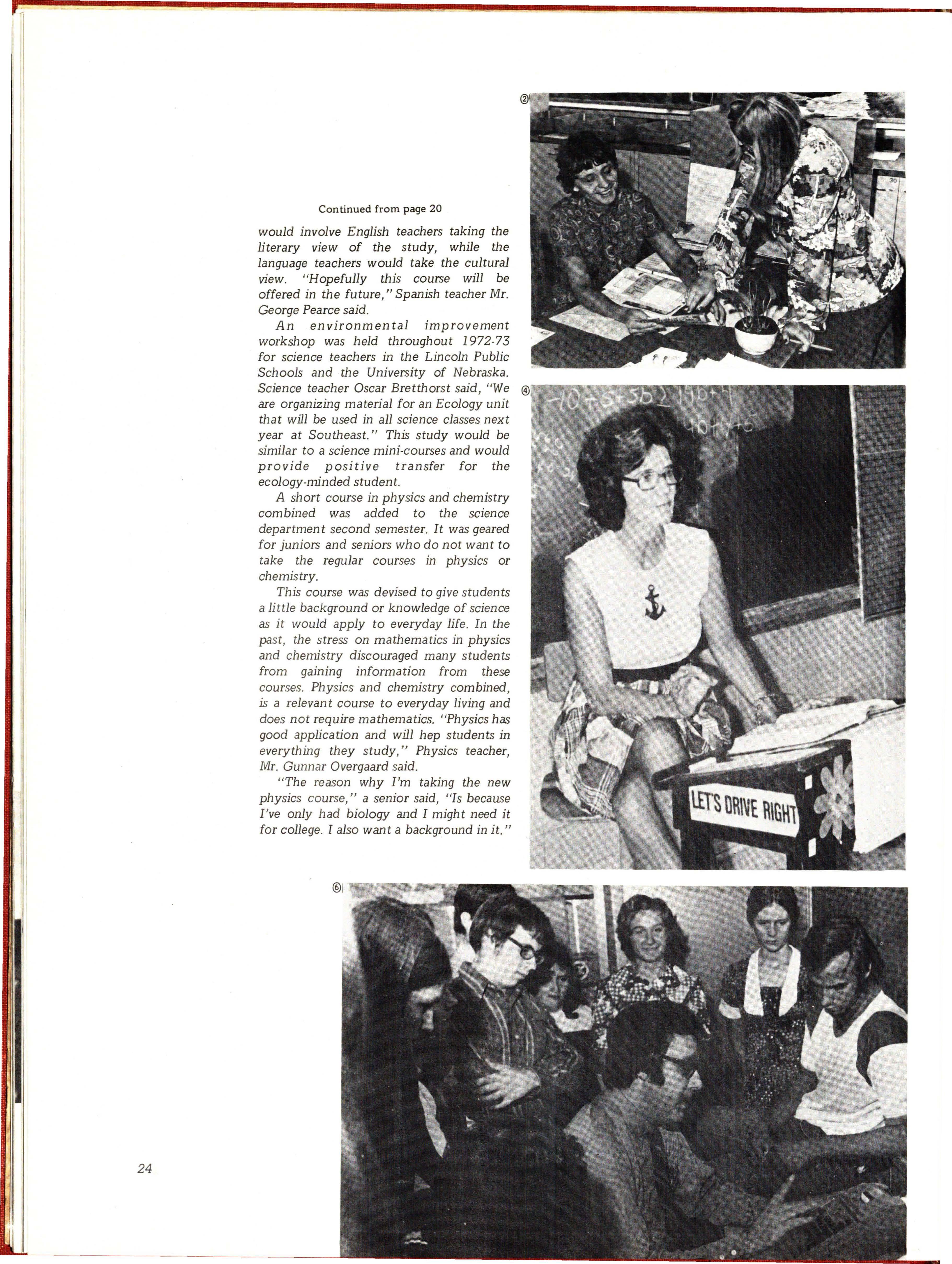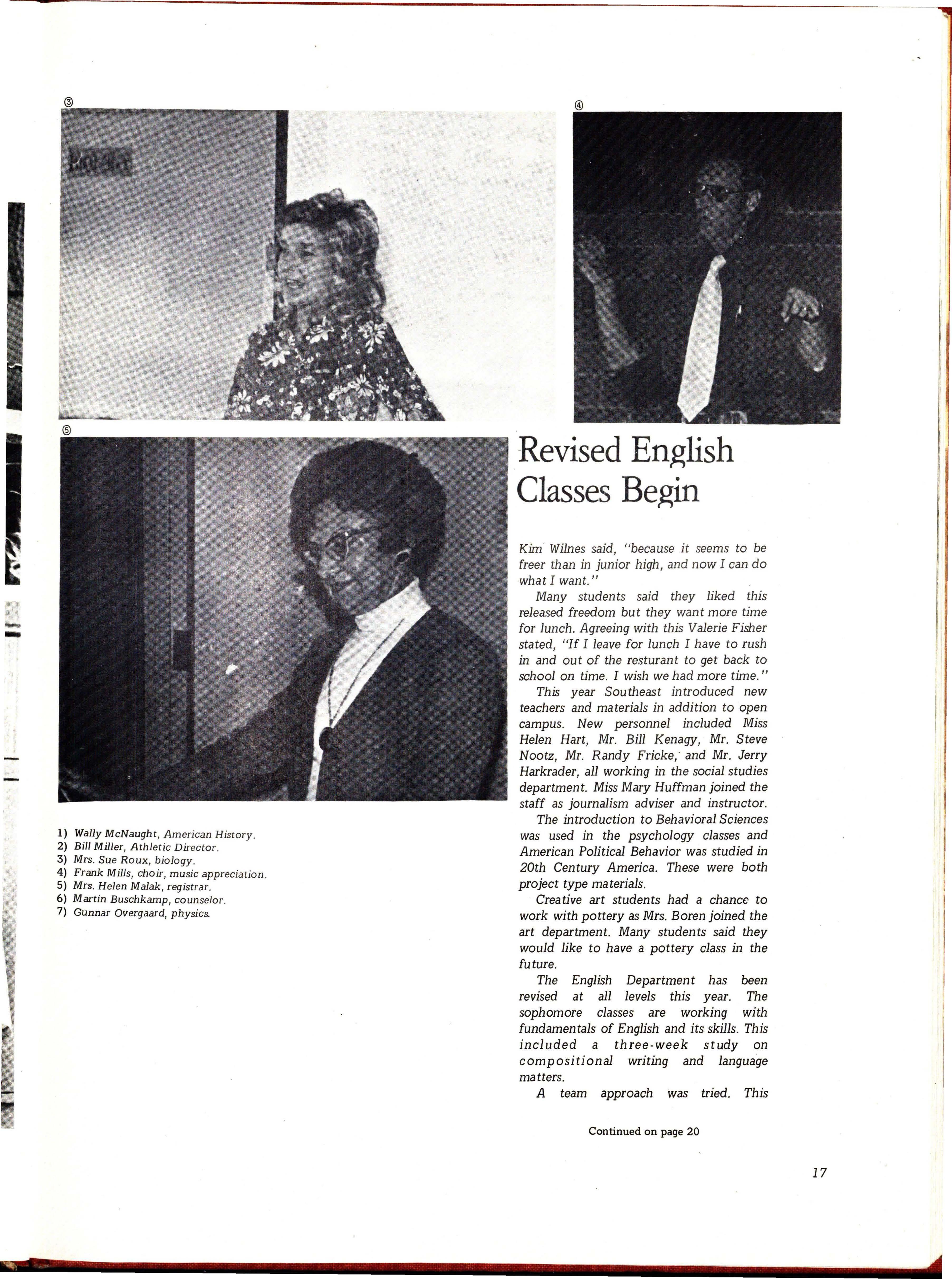 This year Southeast introduced new teachers and materials in addition to open campus. New personnel included Miss Helen Hart, Mr. Bill Kenagy, Mr. Steve Nootz, Mr. Randy Fricke, · and Mr. Jerry Harkrader, all working in the social studies department. Miss Mary Huffman joined the staff as journalism adviser and instructor.