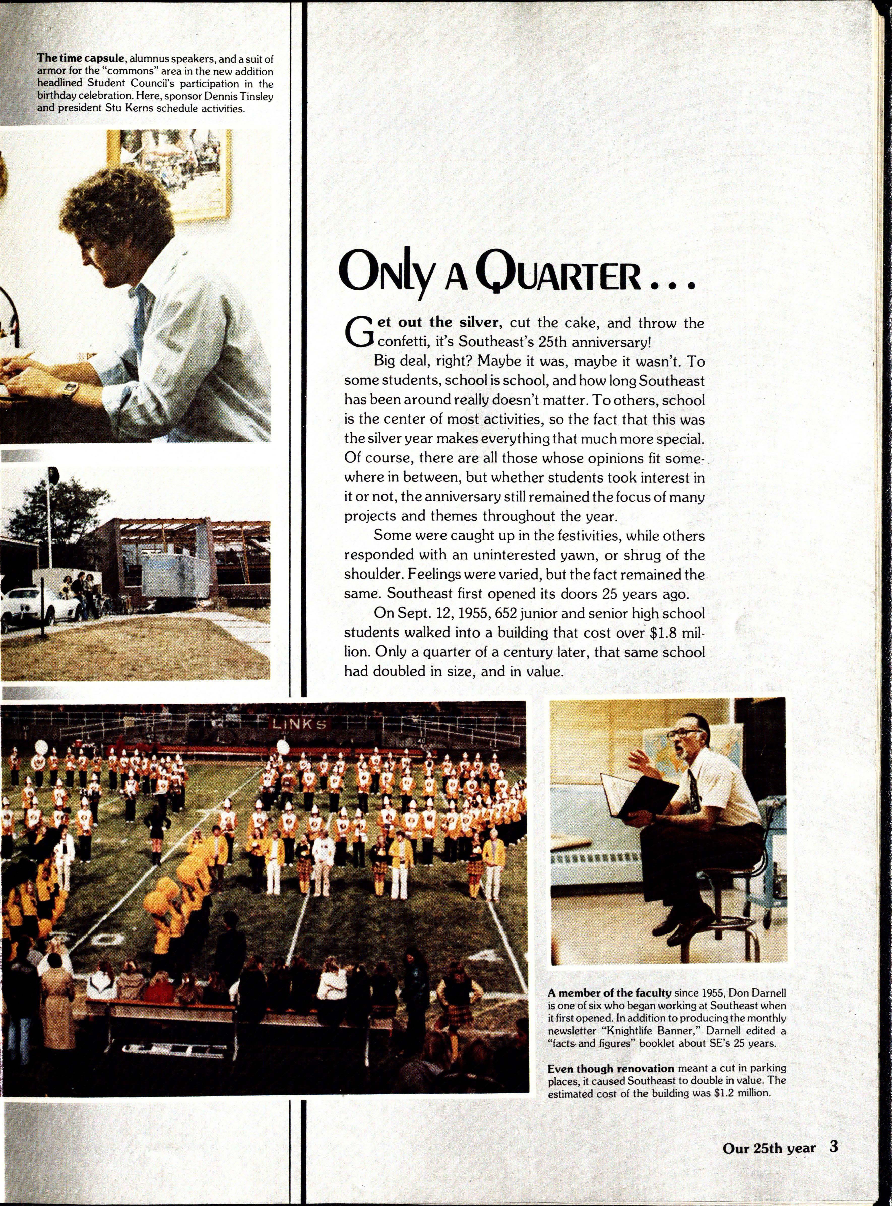 Big deal, right? Maybe it was, maybe it wasn't. To some students, school is school, and how long Southeast has been around really doesn't matter. To others, school is the center of most activities, so the fact that this was the silver year makes everything that much more special. Of course, there are all those whose opinions fit some_ where in between, but whether students took interest in it or not, the anniversary still remained the focus of many projects and themes throughout the year.