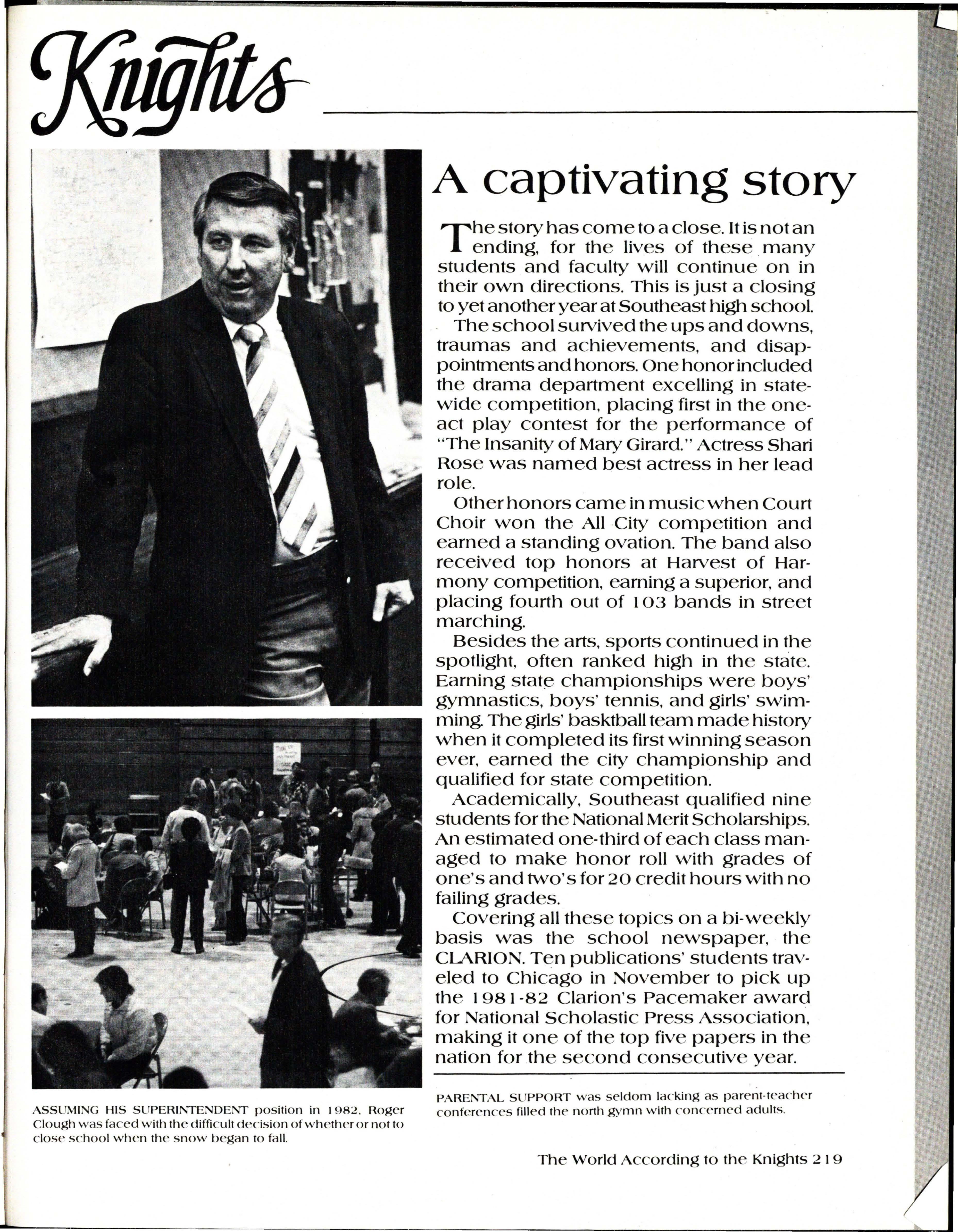 ·Positions changed, and new people entered the Knights world. Beginning his term as the new superintendent of the Lincoln Public Schools in the fall of I 982, Roger Clough was appointed to succeed the retiring John Prausch.