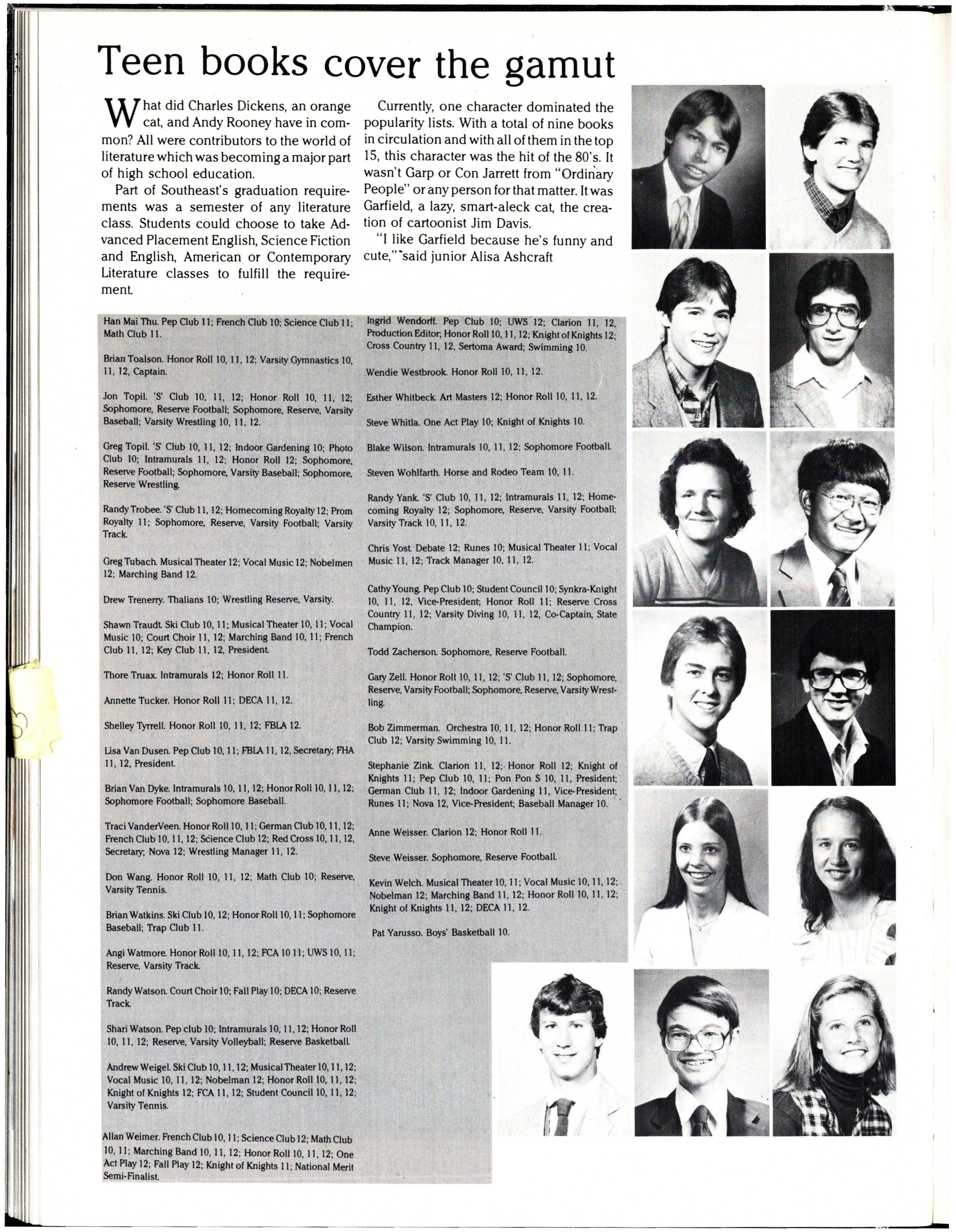The "\Vorld According to the Knights" is a non-fiction novel about the lives of people who were brought together under one roof to form the student body of Southeast. It's a story of their personalities, ways of life, opinions, activities and school life. It's a historical account of one year at Southeast plus an in-depth look at the people who make up this high school.
