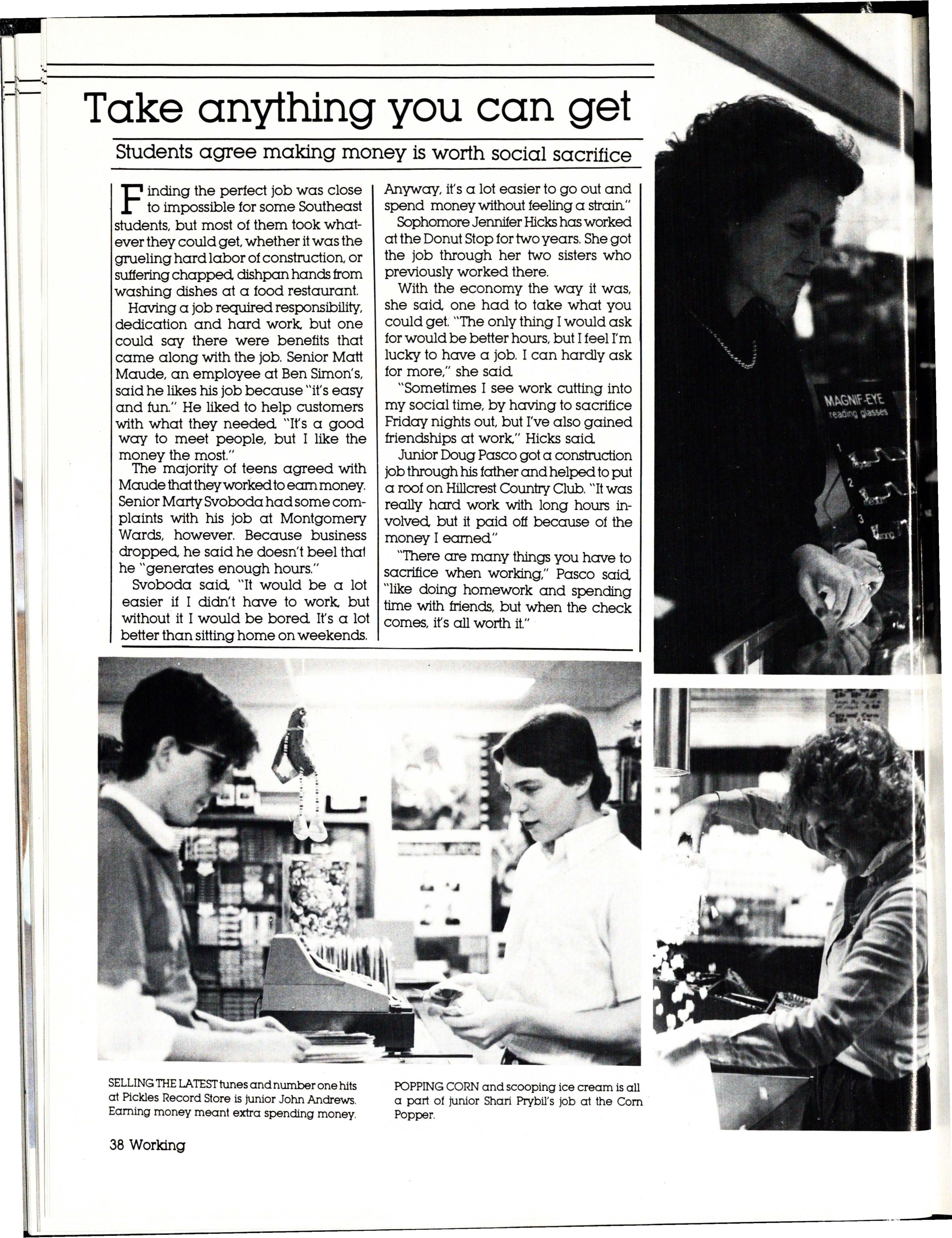 Those who were lucky got jobs during the summer. Some worked full days while others worked according to an ever changing schedule. Junior Jeff Campbell mowed lawns in order to get some extra money though "mowing lawns can take too much time and the money is not very good" he said