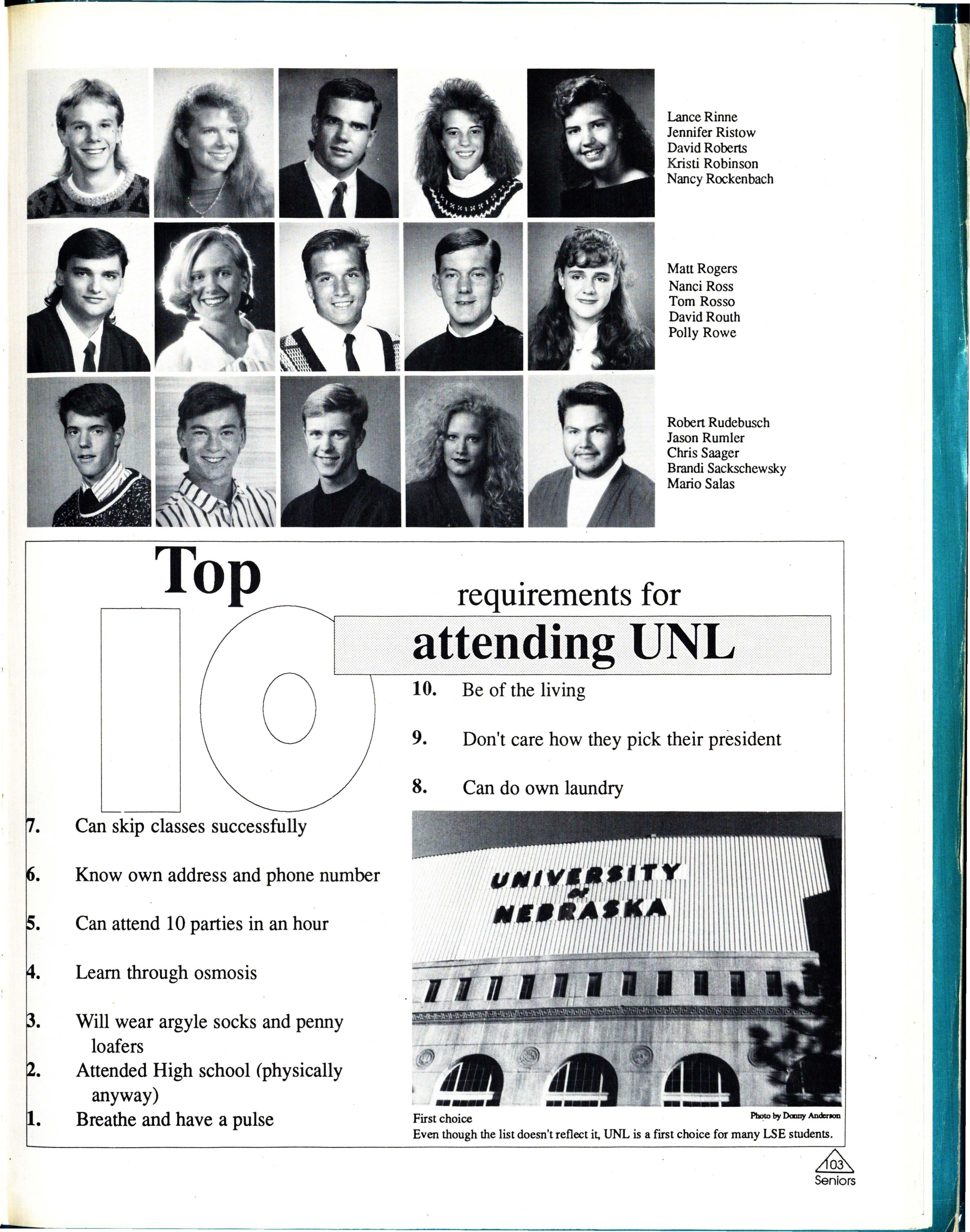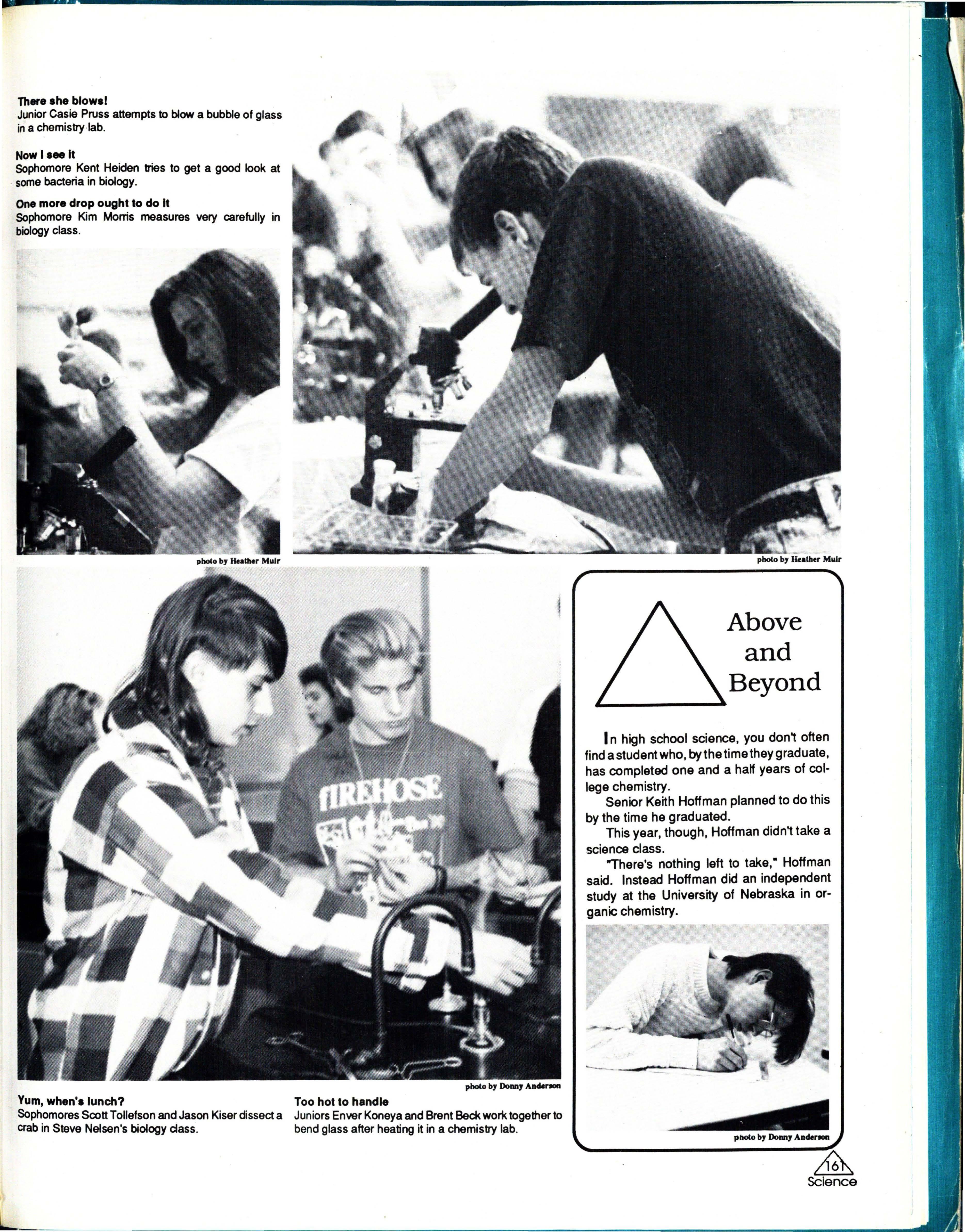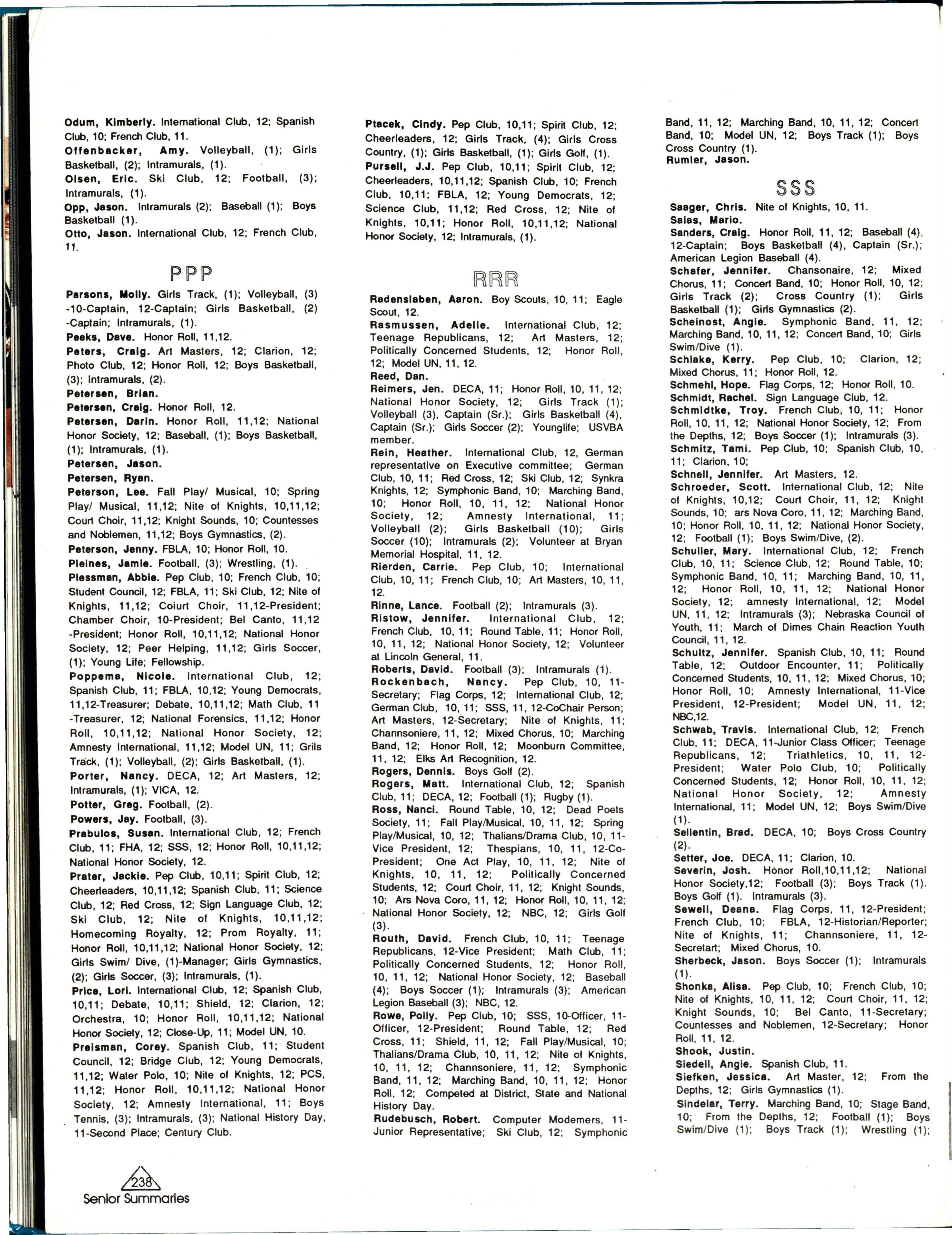 Schuller, Mary. International Club, 12 ; French Club, 10, 11; Science Club, 12; Round Table, 10; Symphonic Band, 10, 11; Marching Band , 10, 11 , 12; Honor Roll, 10, 11, 12; National Honor Society , 12 ; amnesty International, 12; Model UN, 11 , 12; lntramurals (3); Nebraska Council o f Youth 11; March of Dimes Chain Reaction Yuuth Council , 11, 12.