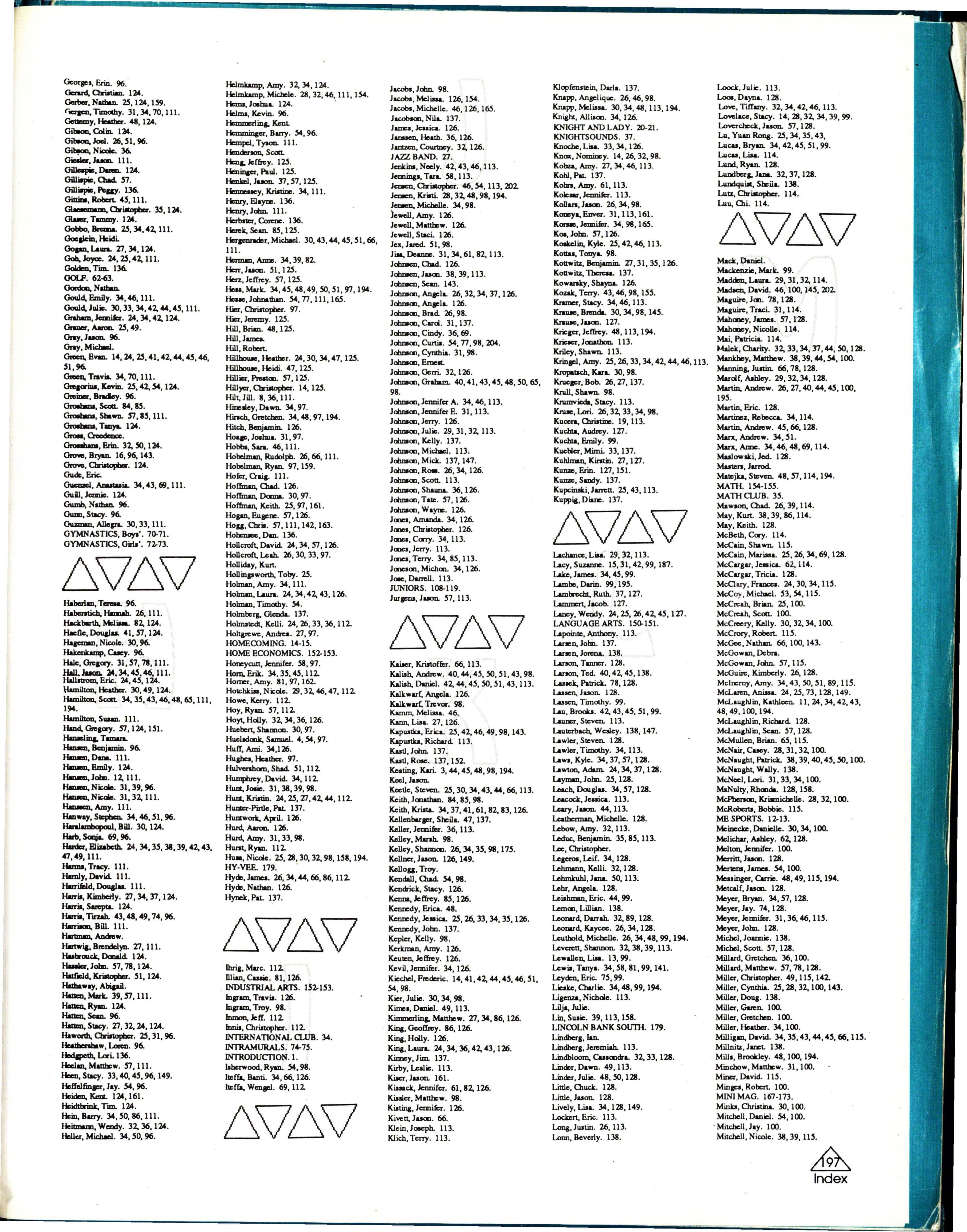 Schafer, Jennifer. Chansonaire, 12; Mixed Chorus , 11; Concert Band, 10 ; Honor Roll, 10, 12 ; Girls Track (2); Cross Country ( 1); Girls Basketball (1); Girls Gymnastics (2).