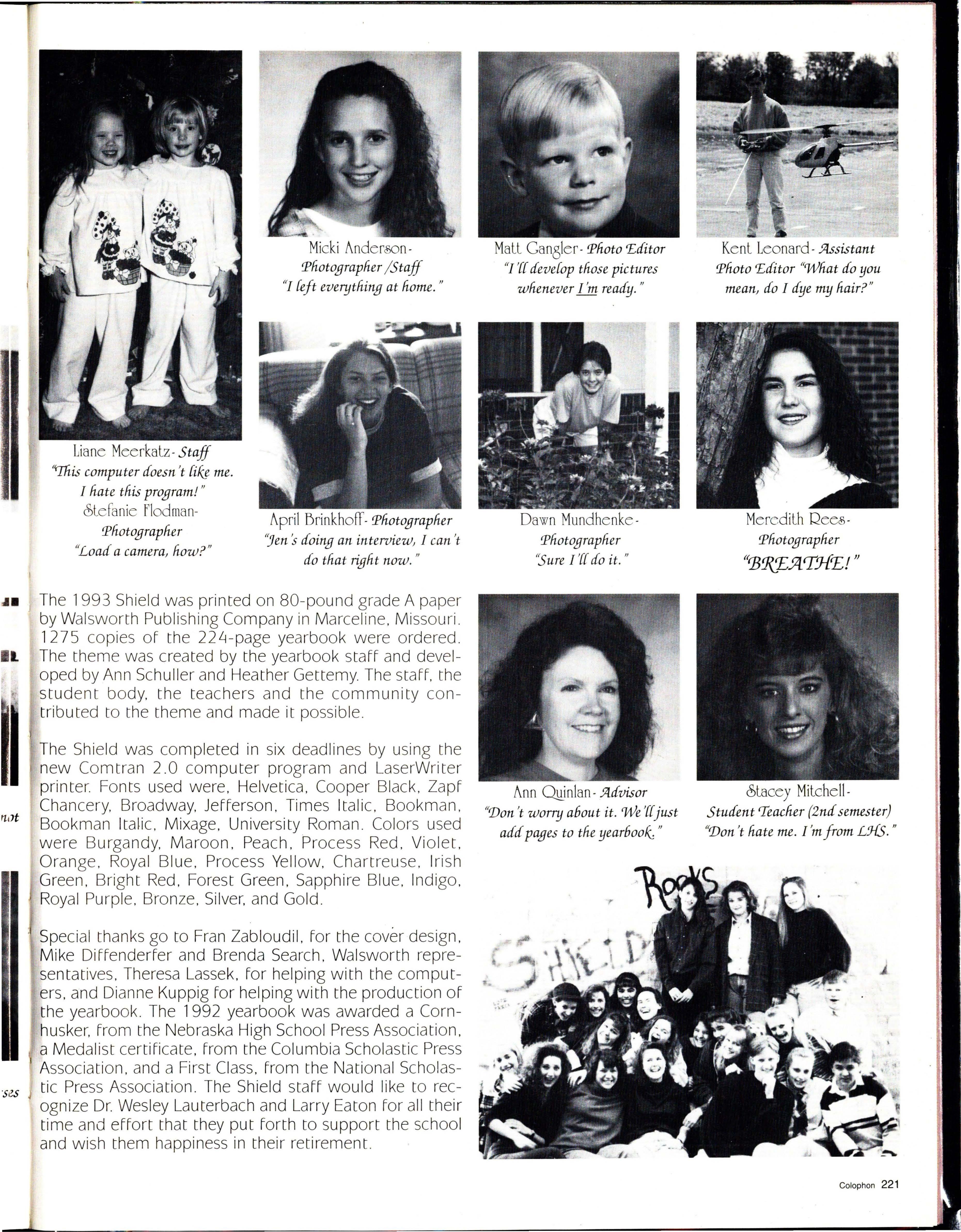 The 1993 Shield was printed on 80-pound grade A paper by Walsworth Publishing Company in Marcel ine, Miss ouri.