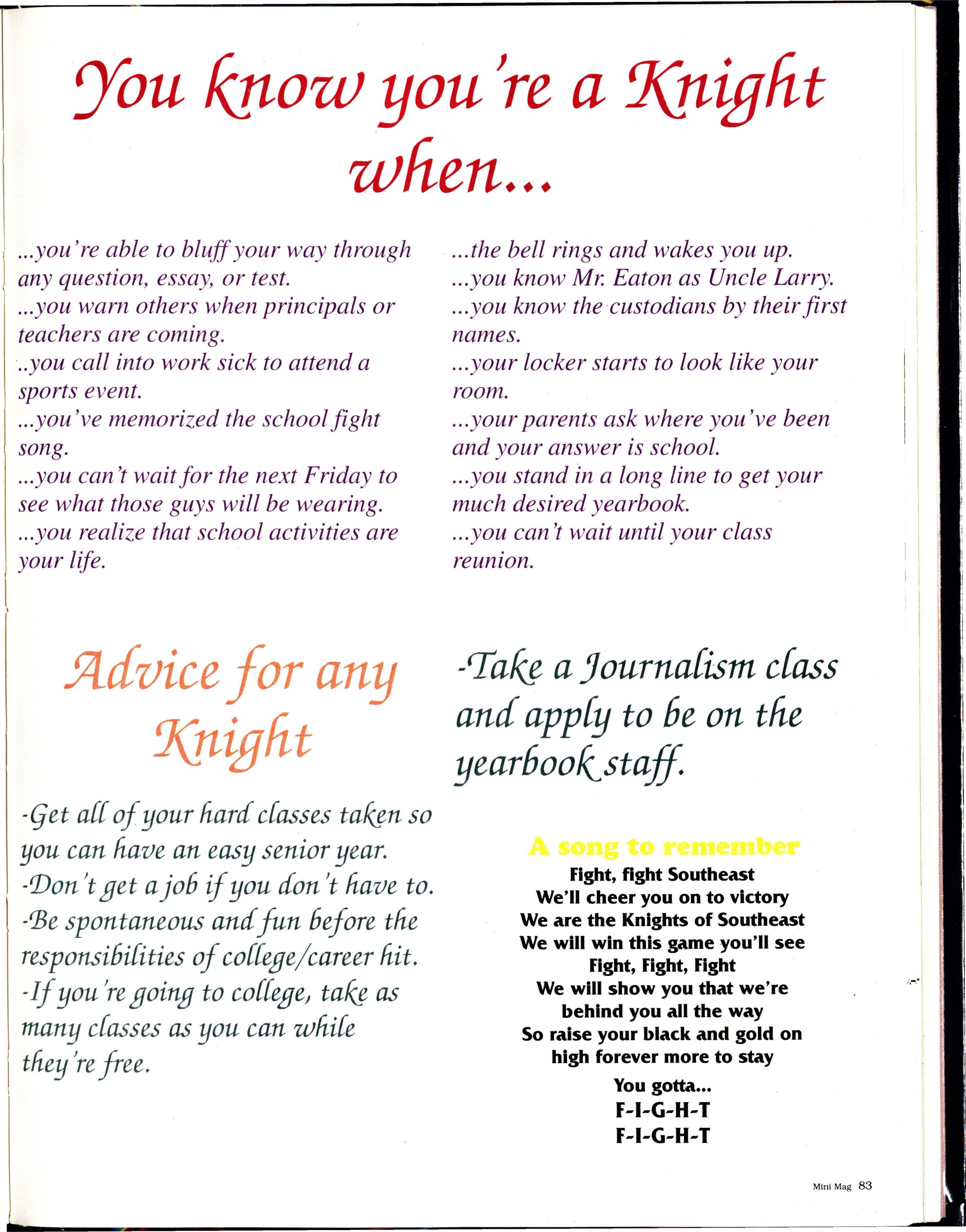 Looking at the long l ist of over 1 00 nominees for the Knight and Lady of Southest, it w as easy to see t hat to fi nd a student excell i ng in either sports. academics. or c l ubs. one didn't have to look very far