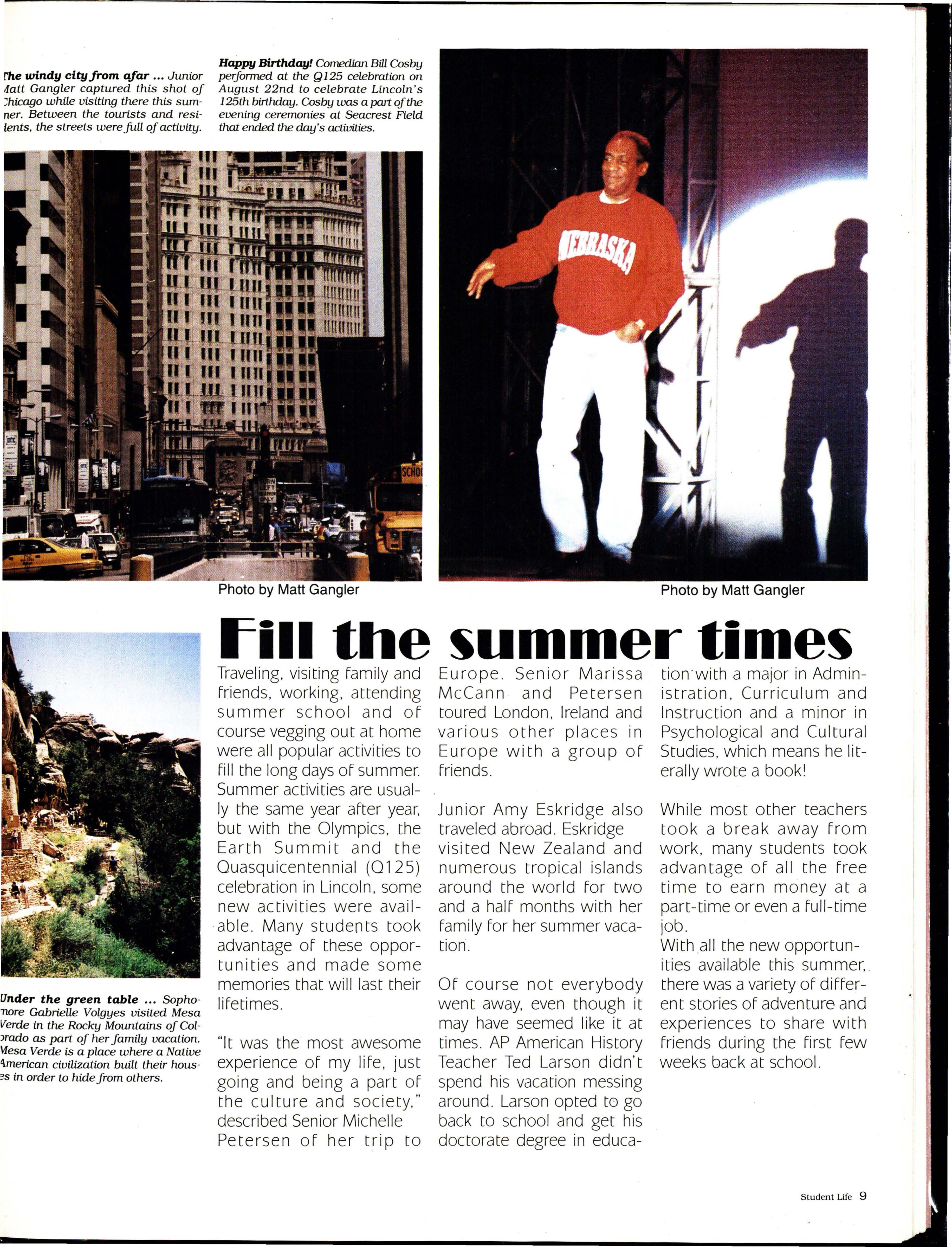 Happy Birthday! Comedian Bill Cosby rhe windy city from afar Junior pe,jormed at the Q 125 celebration on datt Gangler captured this shot of August 22nd to celebrate Lincoln's ;hicago while visiting there this sum- 125th birthday. Cosby was a part of the ner. Between the tourists and resi- evening ceremonies at Seacrest Field lents, the streets were full of activity. that ended the day's activities.
