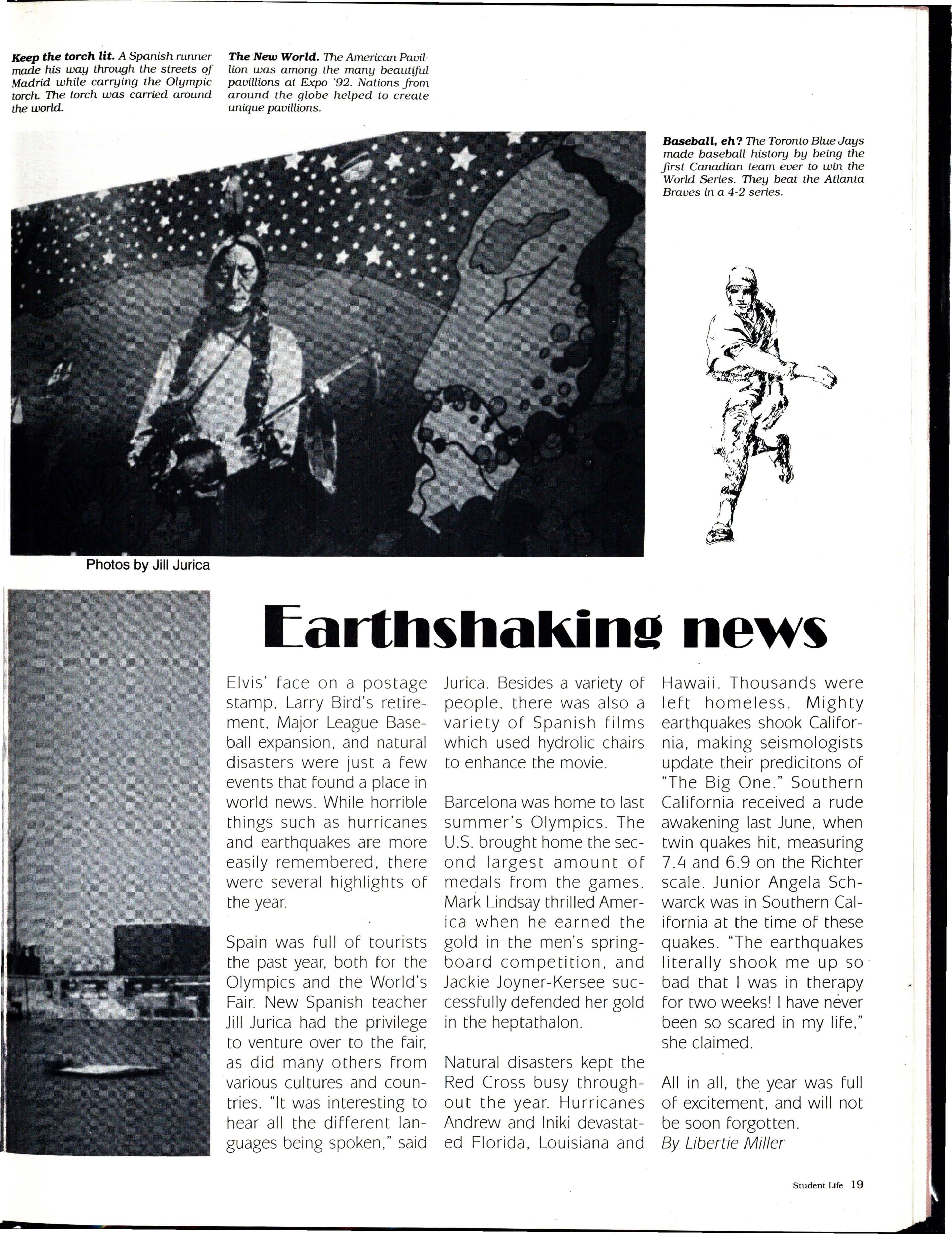 Spain was full of tourists the past year, both for the Olympics and the World's Fair. New Spanish teacher Jill Jurica had the privilege to venture over to the fair, as did many others from various cultures and countries. "It was interesting to hear all the different languages being spoken," said
