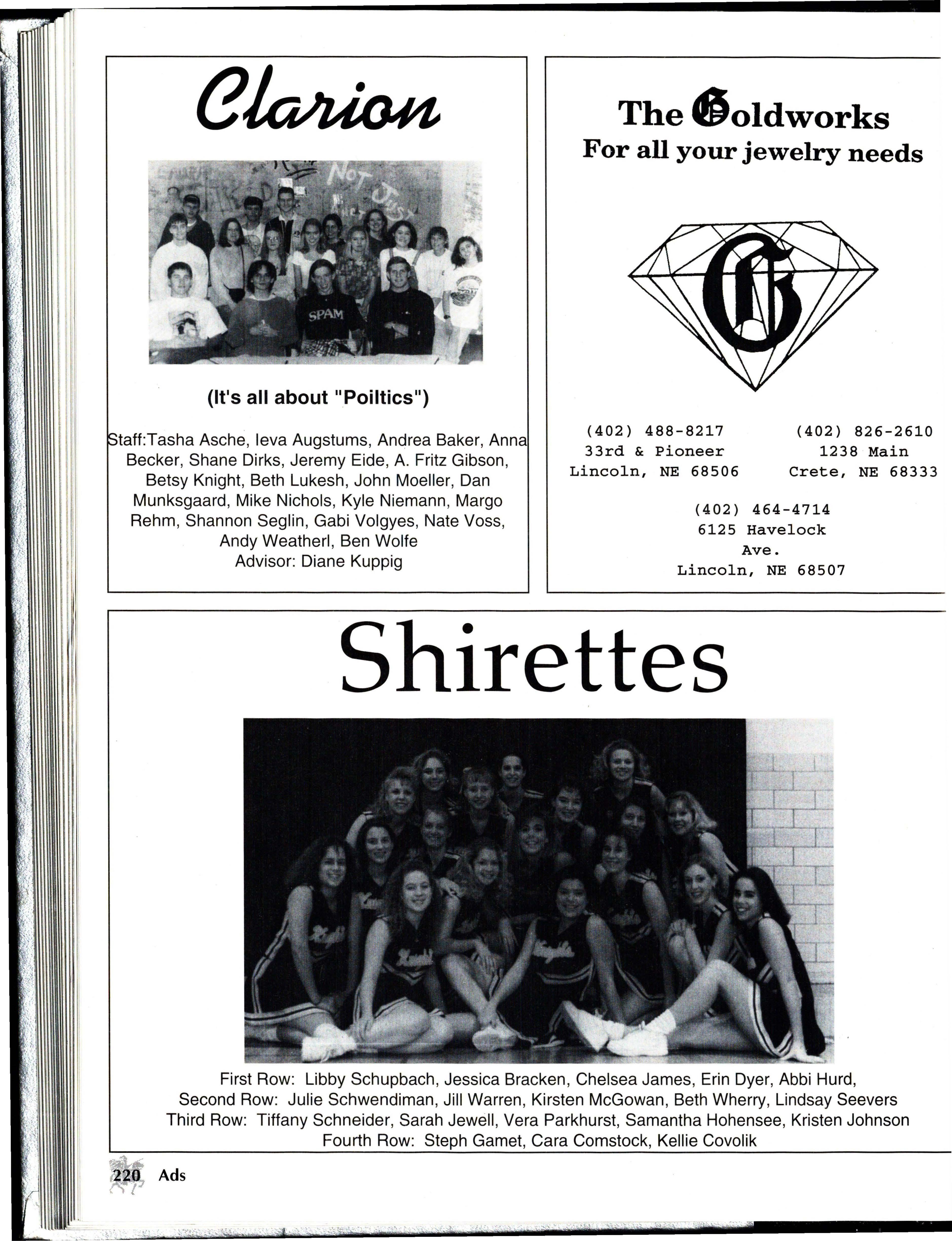 Mr Emr y, Mrs. Leiter, Mr. Reiman, and M rs. Kuppi g and the Clarion staff for the tec hn ica l and moral support all h ave gi ven u s. Thanks to Mrs. Smith's computer aide d d rawing class for the divider page :art w o rk and to Lea's mom for th e c rea ti ve ar two rk i n the student life se c tion. Th e st ude n t bo dy , adverti sers , and co mmun ity deserve the large st thanks fo r all owing u s to cr eate the Shi e ld .