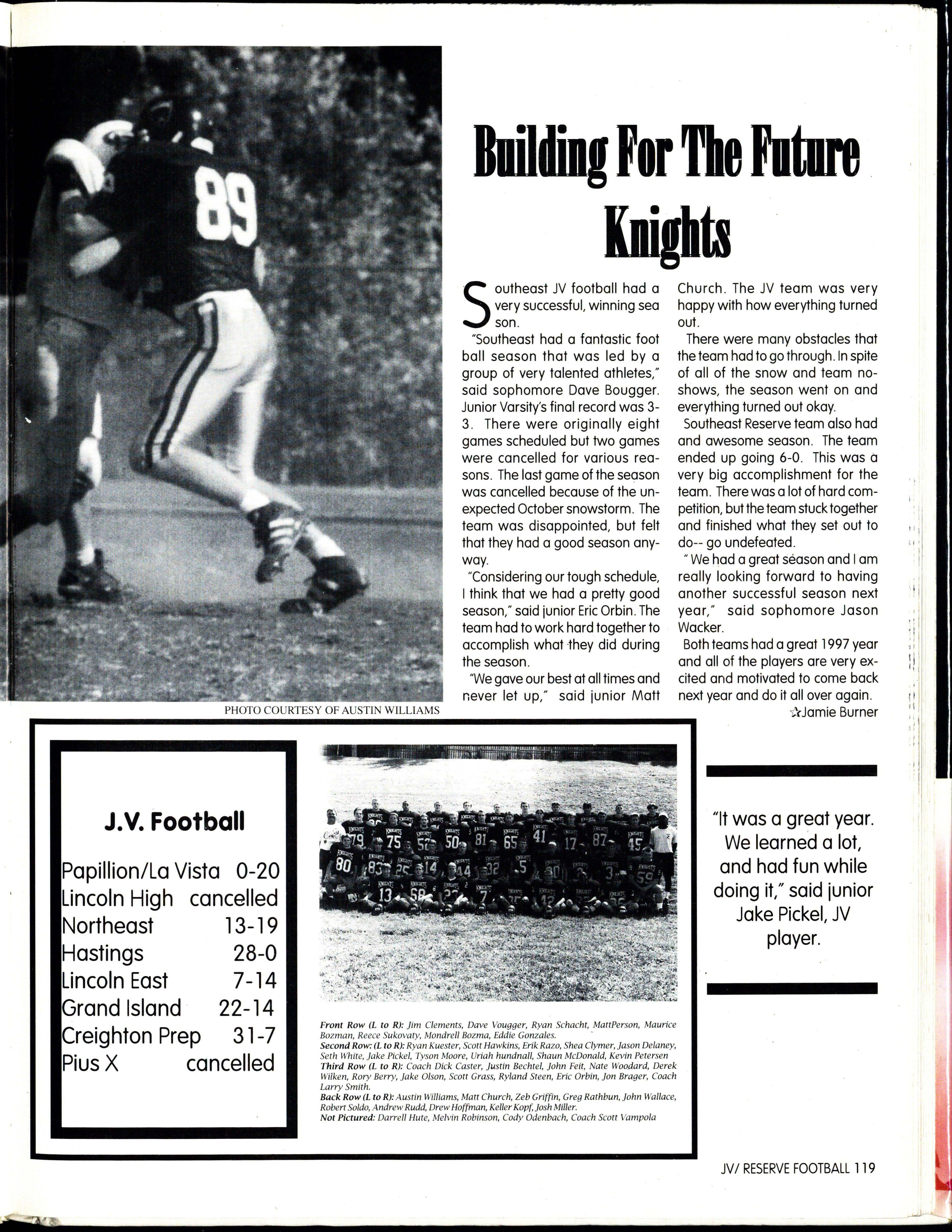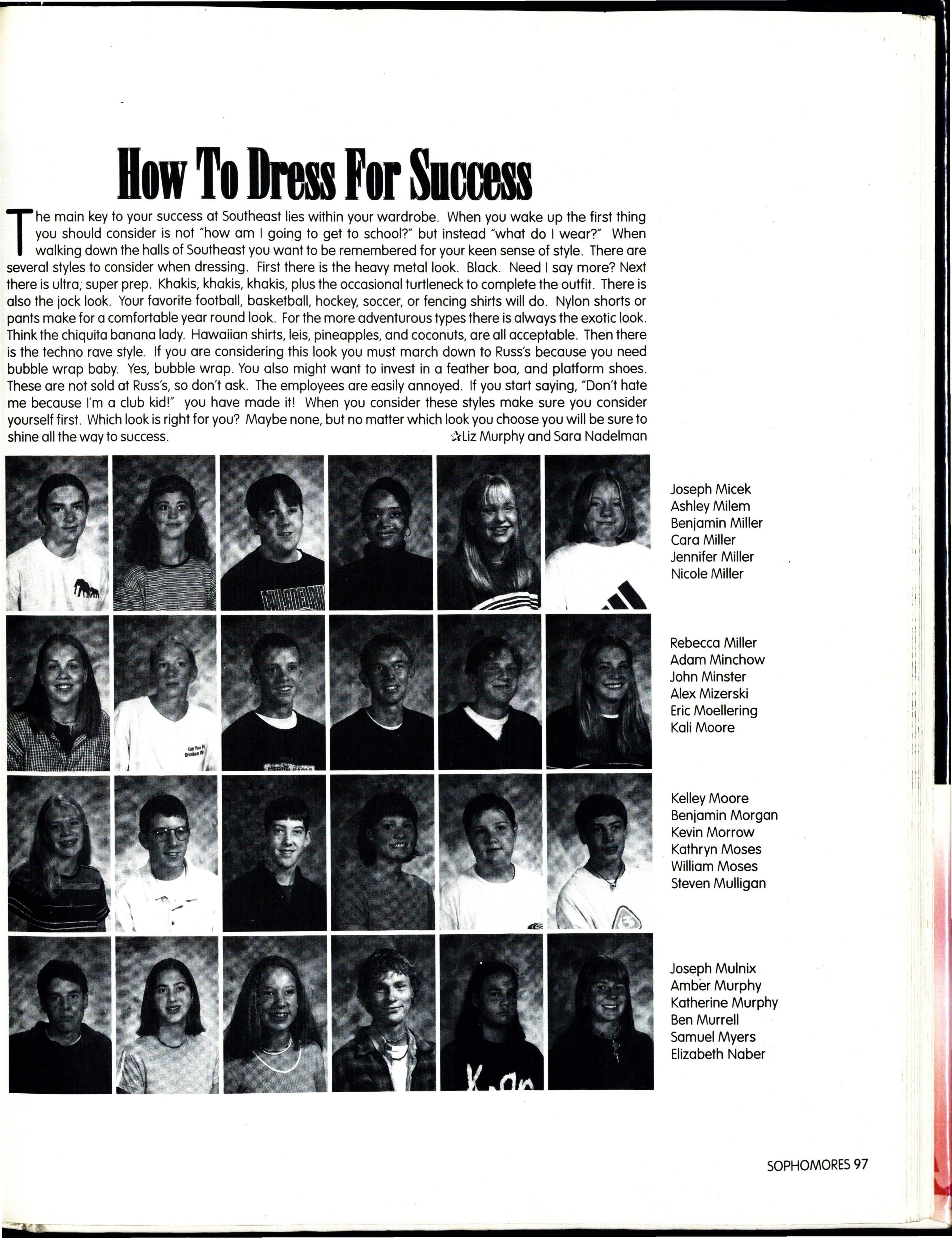 Dedicated fans, some already dressed in the dance attire, cheered Southeast on through occasional rain and gusts of wind that loomed over Seacrest Field. The uncooperative rain did not stop anyone at the dance from having a great time though, especially when the announcements for the 1997 Homecoming Royalty were announced. King Jon Bowling and Queen Holly Baack were crowned, with Luke Connell and Angie Wilson the first runners