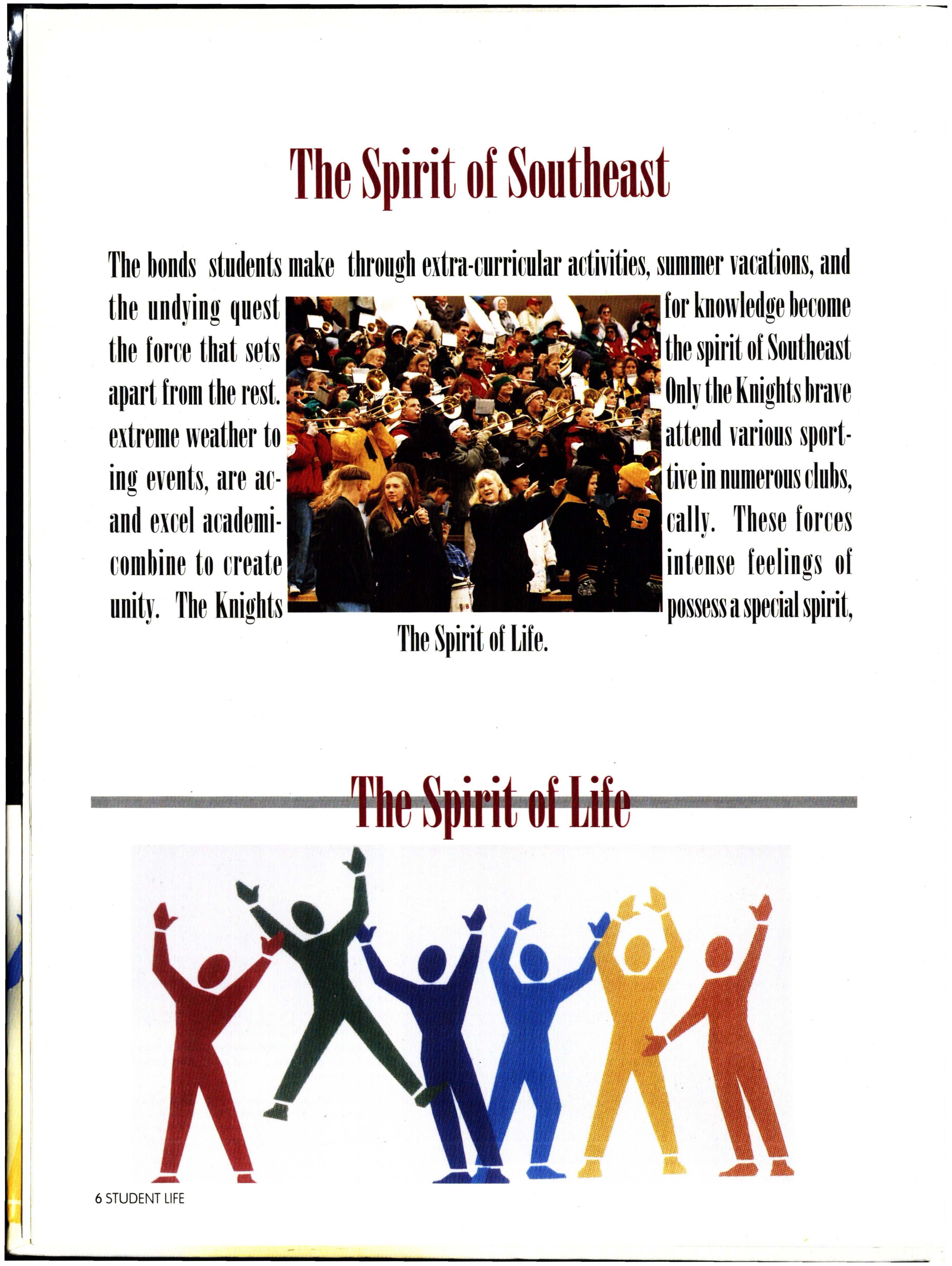 When Southeast students think of spirit, they think of a sea of Knights crowding the stands At chilly football games or inside at wrestling meets, one may remember the devo t ed cheerleaders, fans , and band members cheering the school on to victory