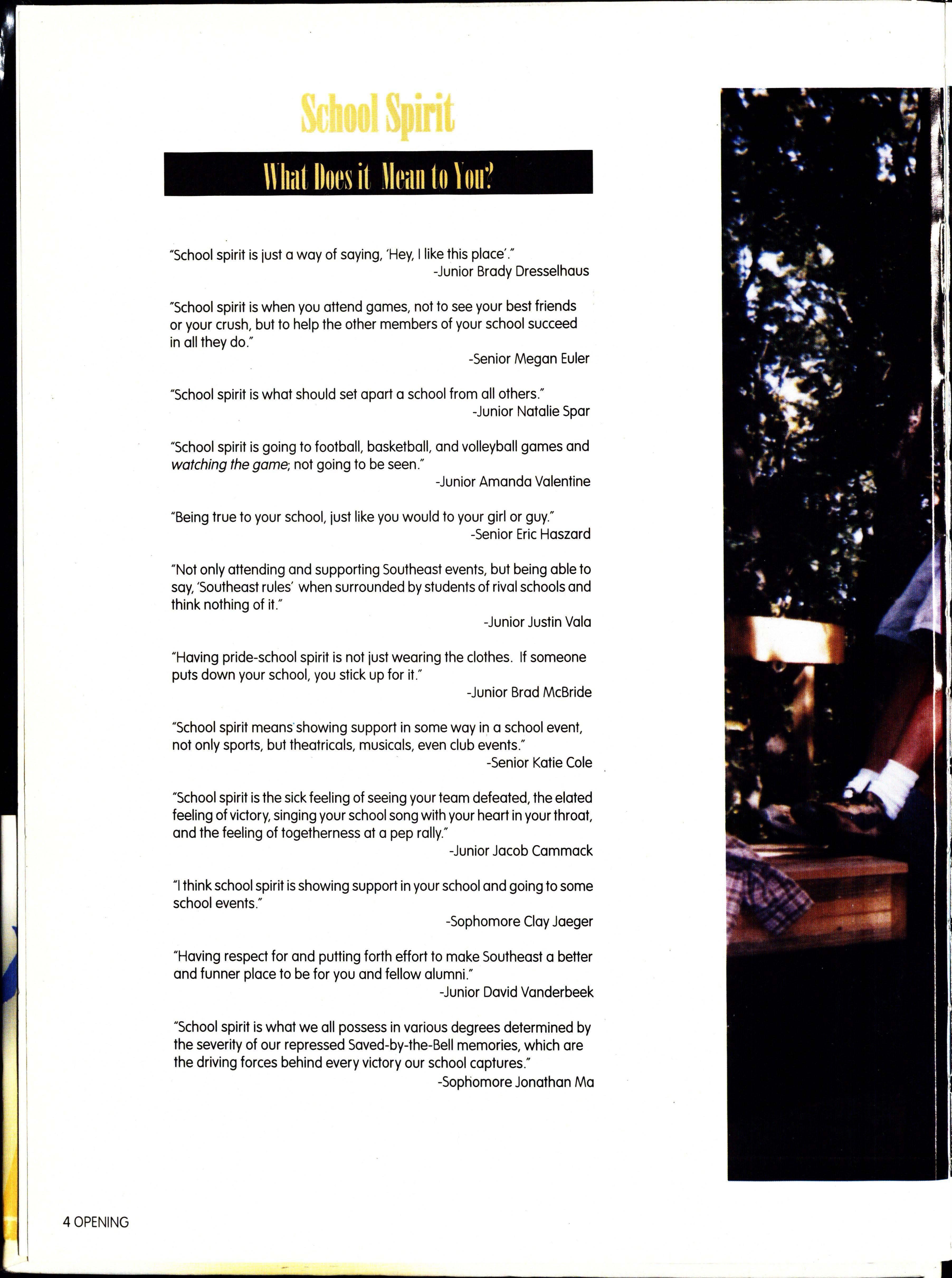 Carrie Myers"We also wanted to give the band, cheerleaders, and Shirettes support for everything they , do," Milligan remarked With this idea in mind, the Spirit Club made locker signs and showed their support with their own cheers for the two above-mentioned Southeast groups. Another fun experience was to decorate students' cars before games and then caravan to the event . "It is always great to see a line of cars driving down the road in black and gold, " Ahrendt said The five seniors are hoping that the club will continue the Spirit tradition "Southeast spirit is really cool and we want students to be proud and never lose sight of their enthusiasm." With the bold colors of black and gold swimming through crowds of supporters, all members of the student body will remember the cheers and yells of Southeast students and the way crease the amount of support at all Southeast the Spirit Club helped to continue this tradition . events "It is really important to see fans at all events , even the smaller, more individual sports, " Ahrendt said While attending the