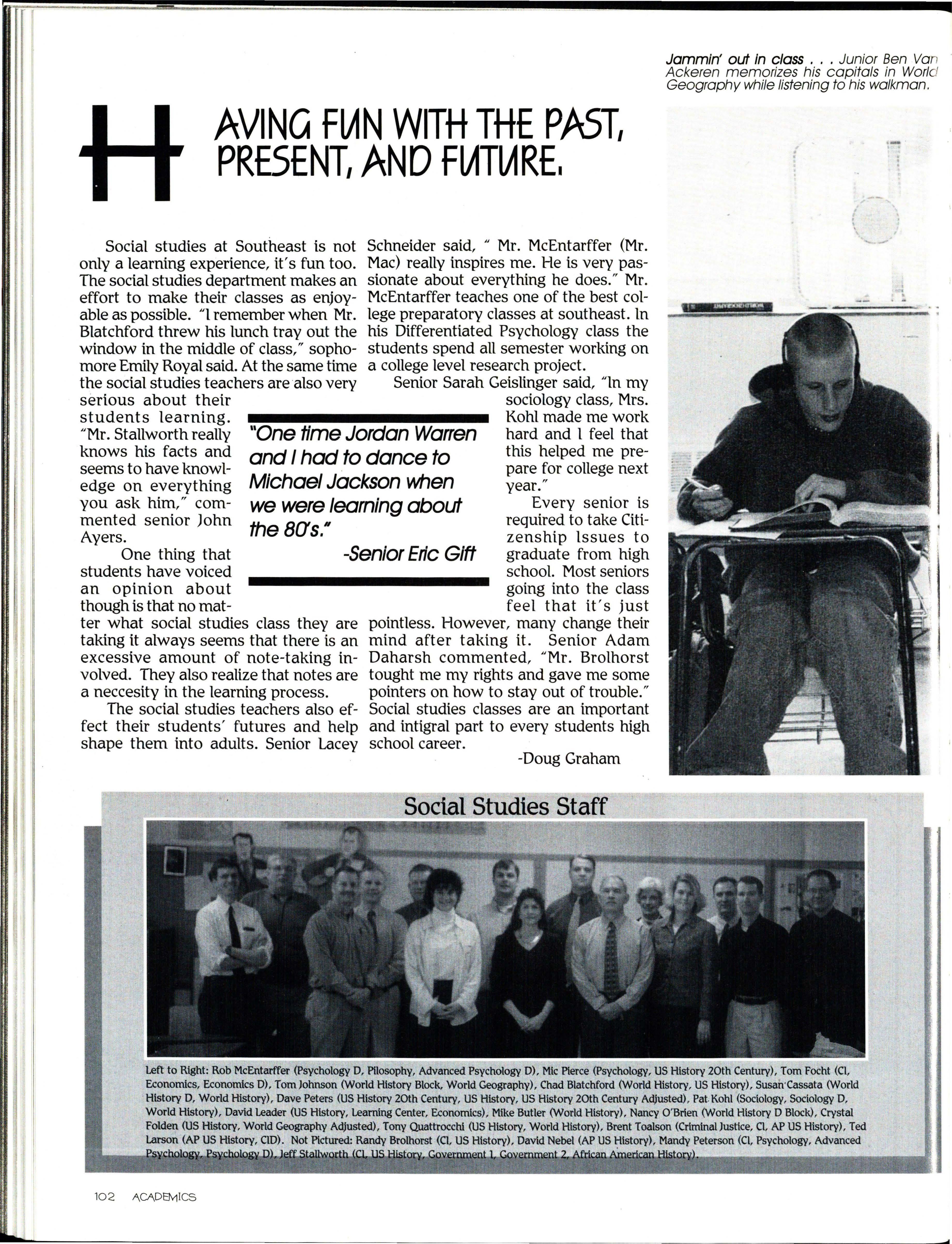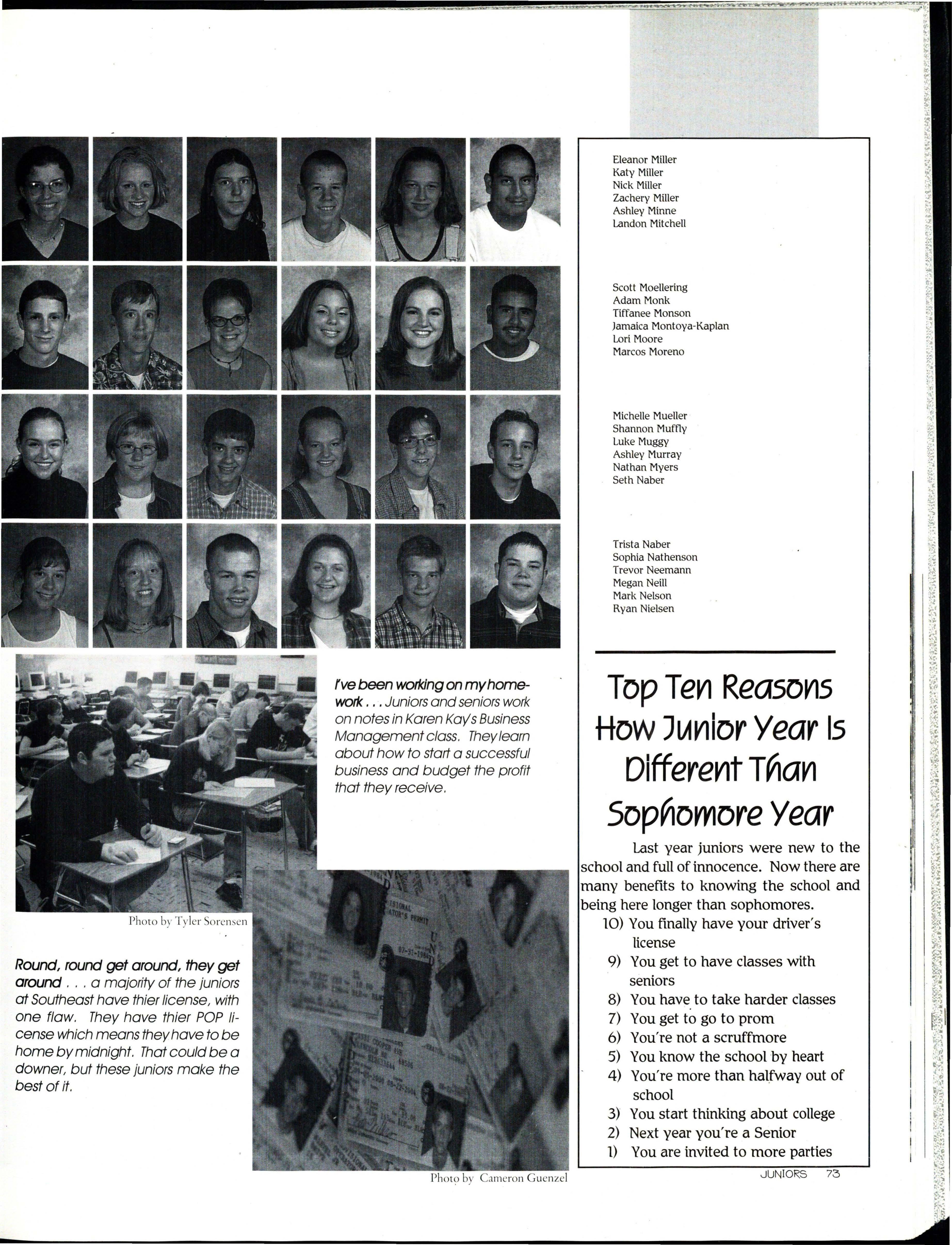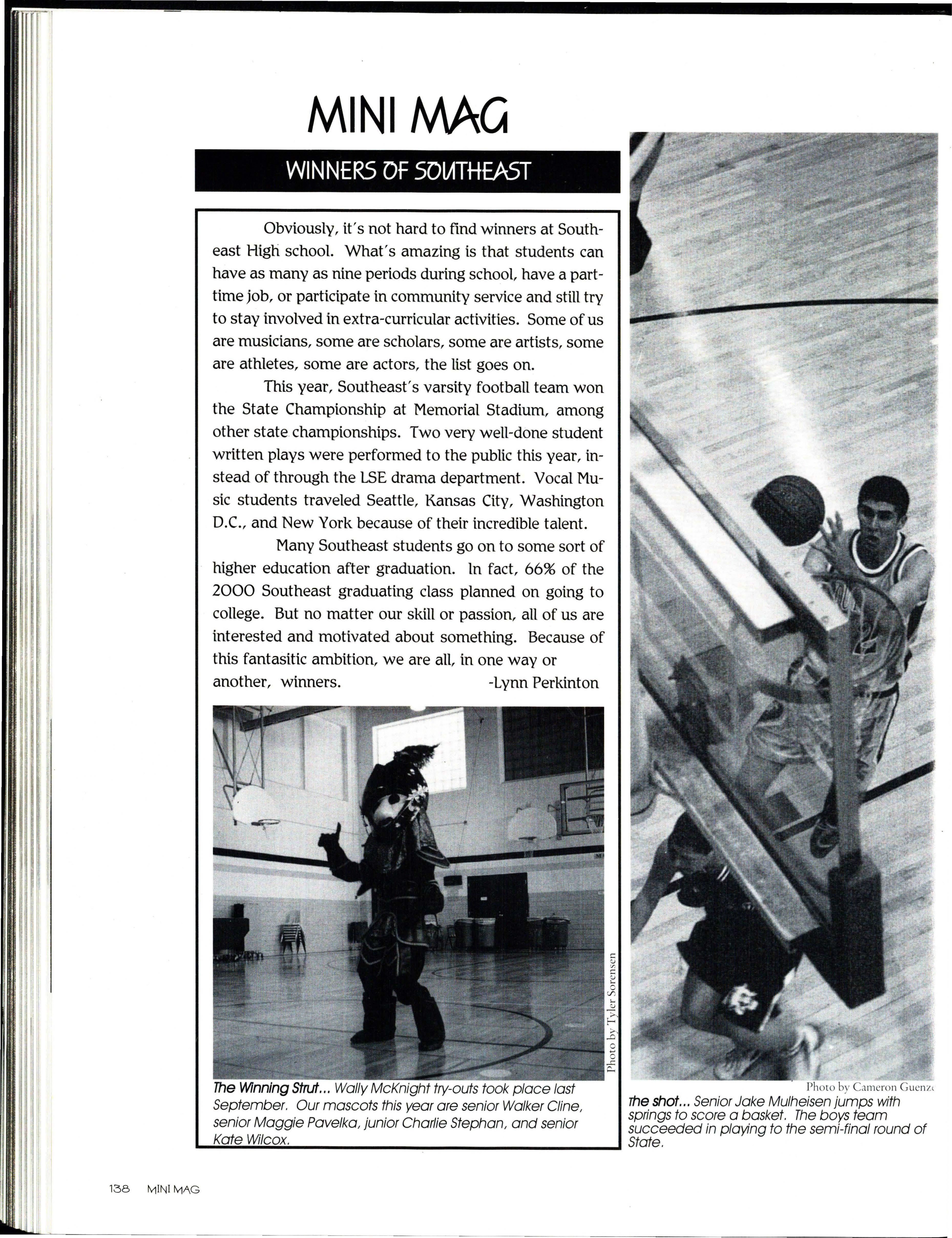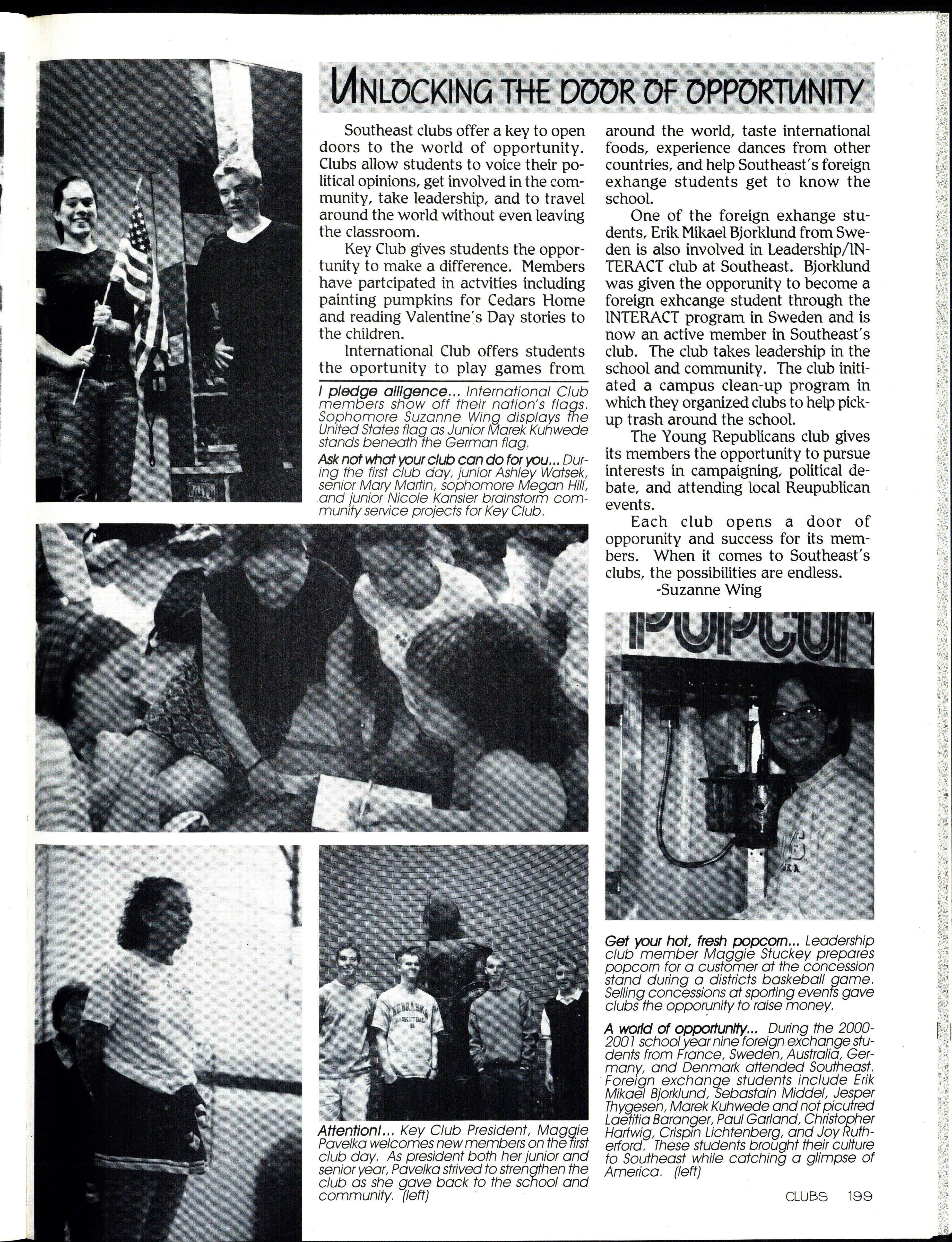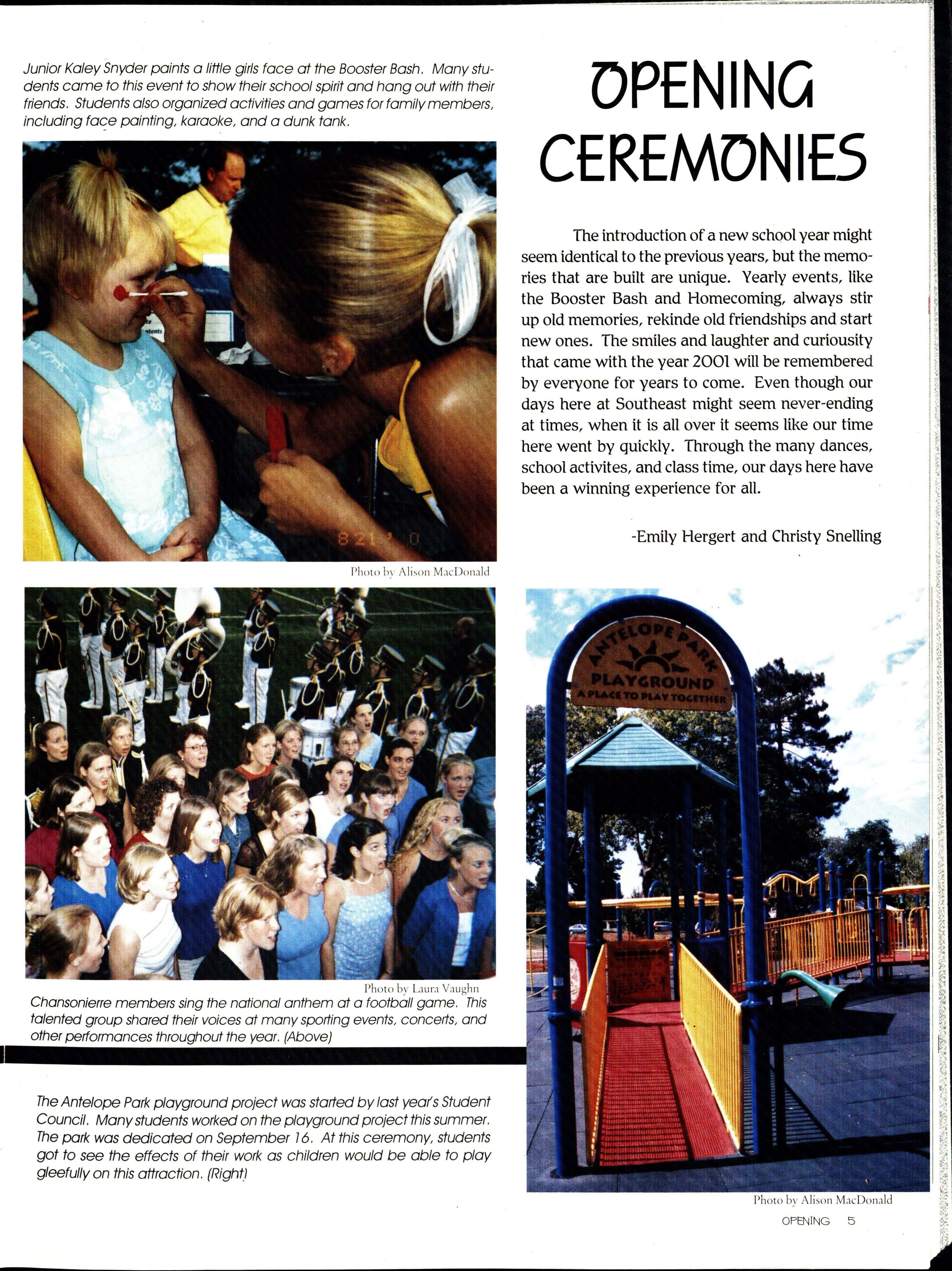 The introduction of a new school year might seem identical to the previous years, but the memories that are built are unique. Yearly events, like the Booster Bash and Homecoming, always stir up old memories, rekinde old friendships and start new ones. The smiles and laughter and curiousity that came with the year 2001 will be remembered by everyone for years to come. Even though our days here at Southeast might seem never-ending at times, when it is all over it seems like our time here went by quickly. Through the many dances, school actMtes, and class time, our days here have been a winning experience for all.