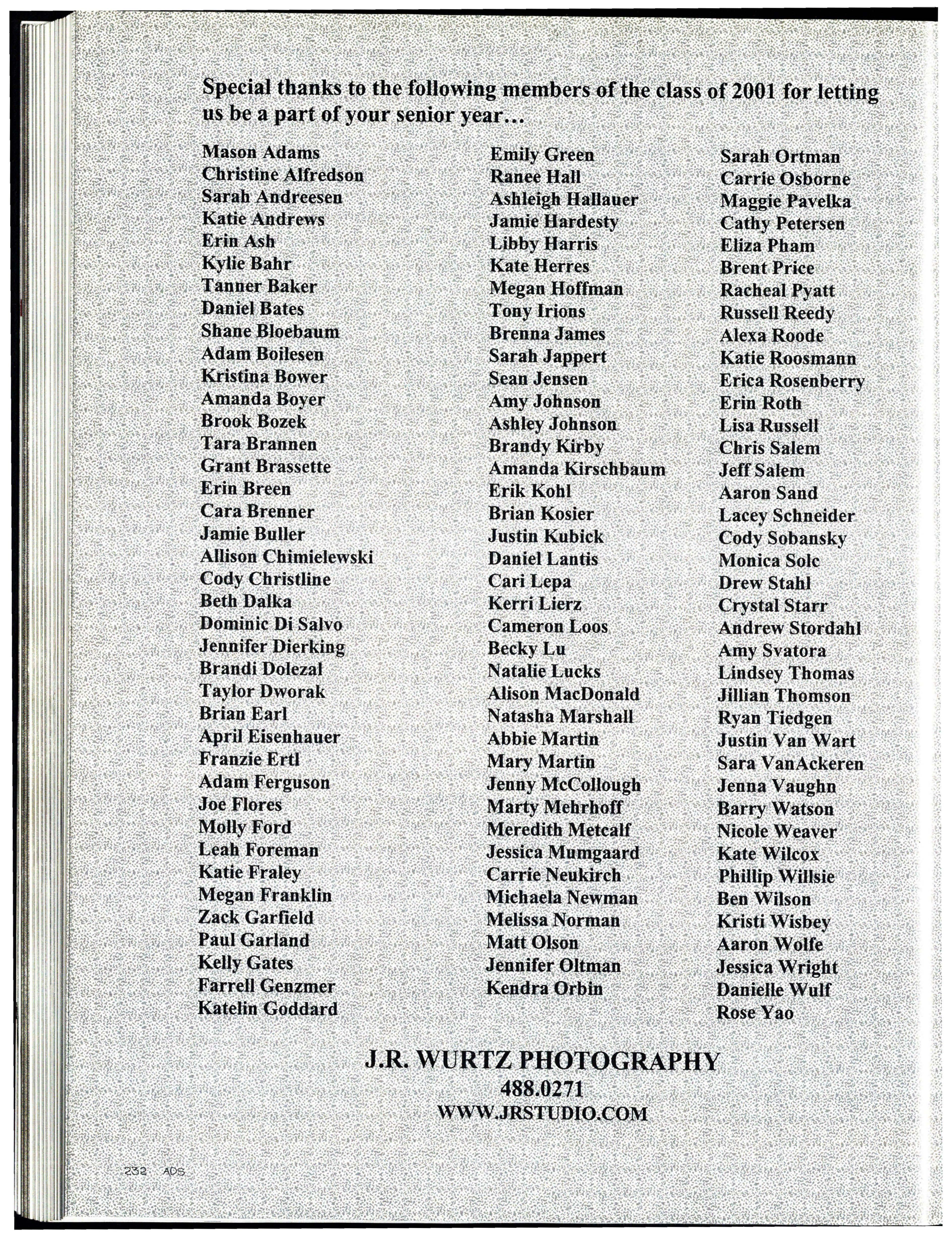 We would like to thank our Walsworth representative Mike Diffenderfer for all of his work helping us with the Shield 2001. We also would like to thank Ann Quinlan for her many nights and weekends. Special thanks to the athletic office for all the team pictures and scoreboards. Last but not least , we would like to thank each and every student for showing us who the winners are. We hope you enjoy the 2001 Shield.