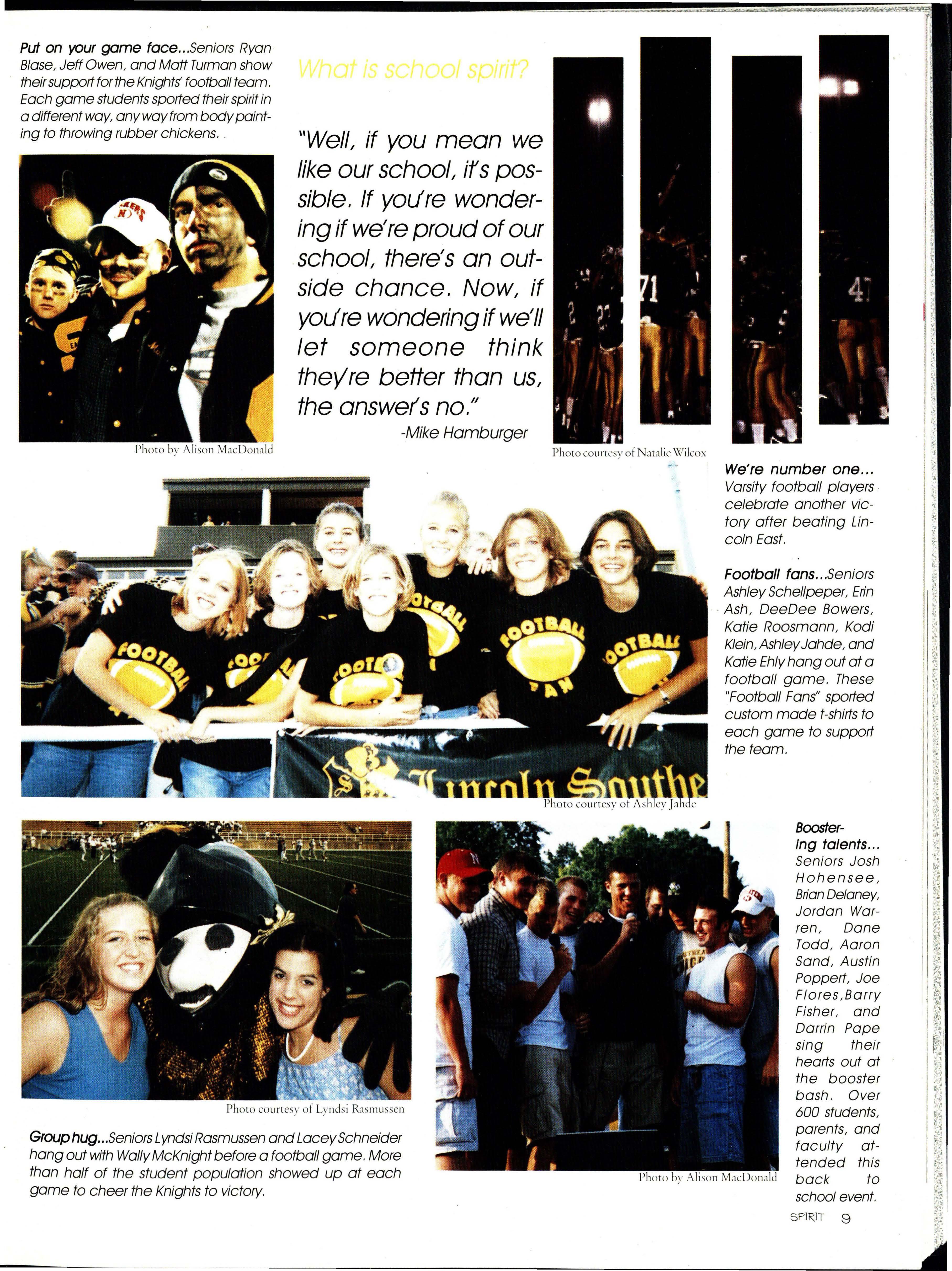 "Our school splrlt ls really strong because so many people attend activities and games, and that's what makes it fun to go to Southeast. " sophomore Lyndi Esslnk said. With the many ways to show school spirit, whether they are the ones performing or the one watching, Southeast students have reached the expectations of being a Knight and have far surpassed them with the success, memories, and friendships that are formed.