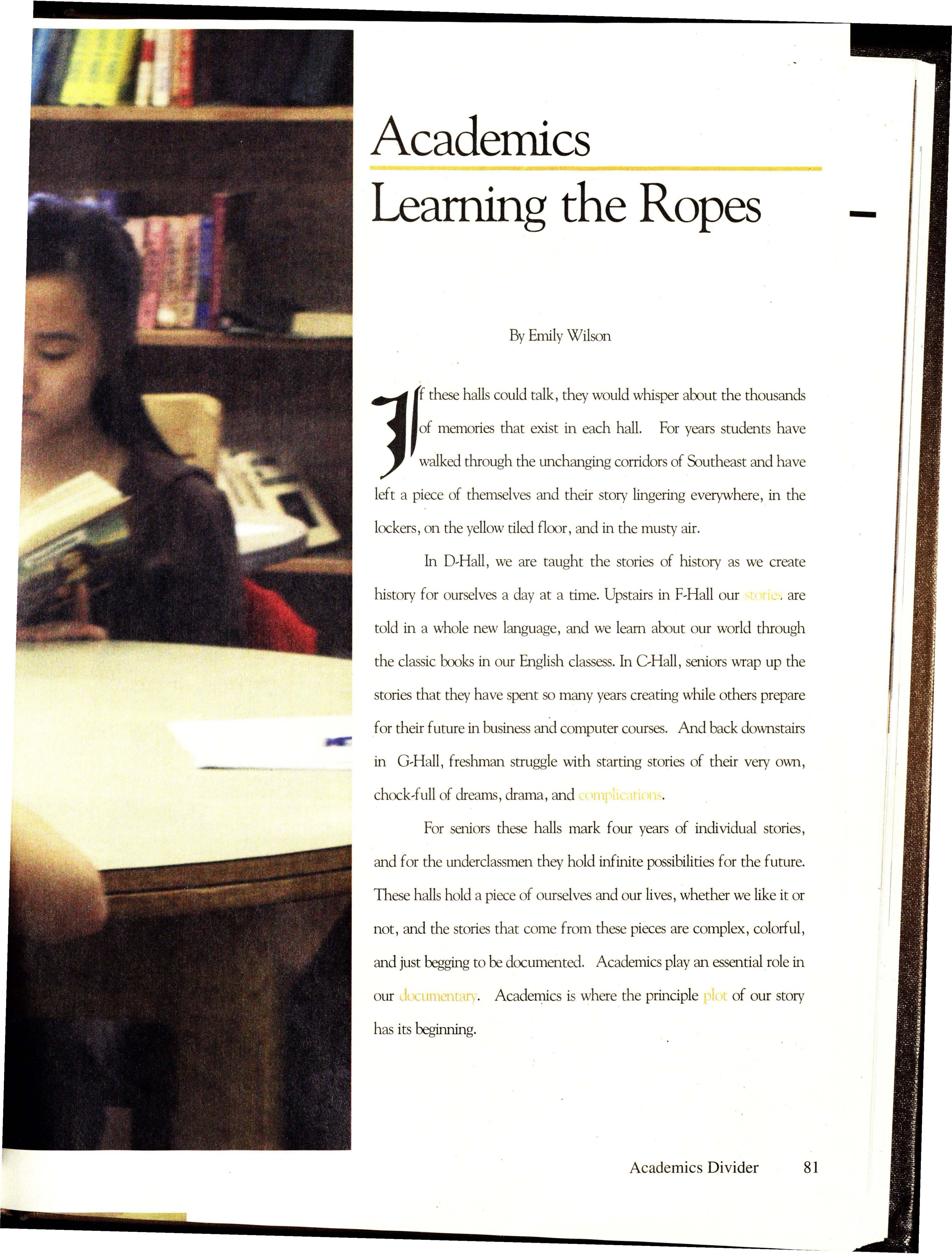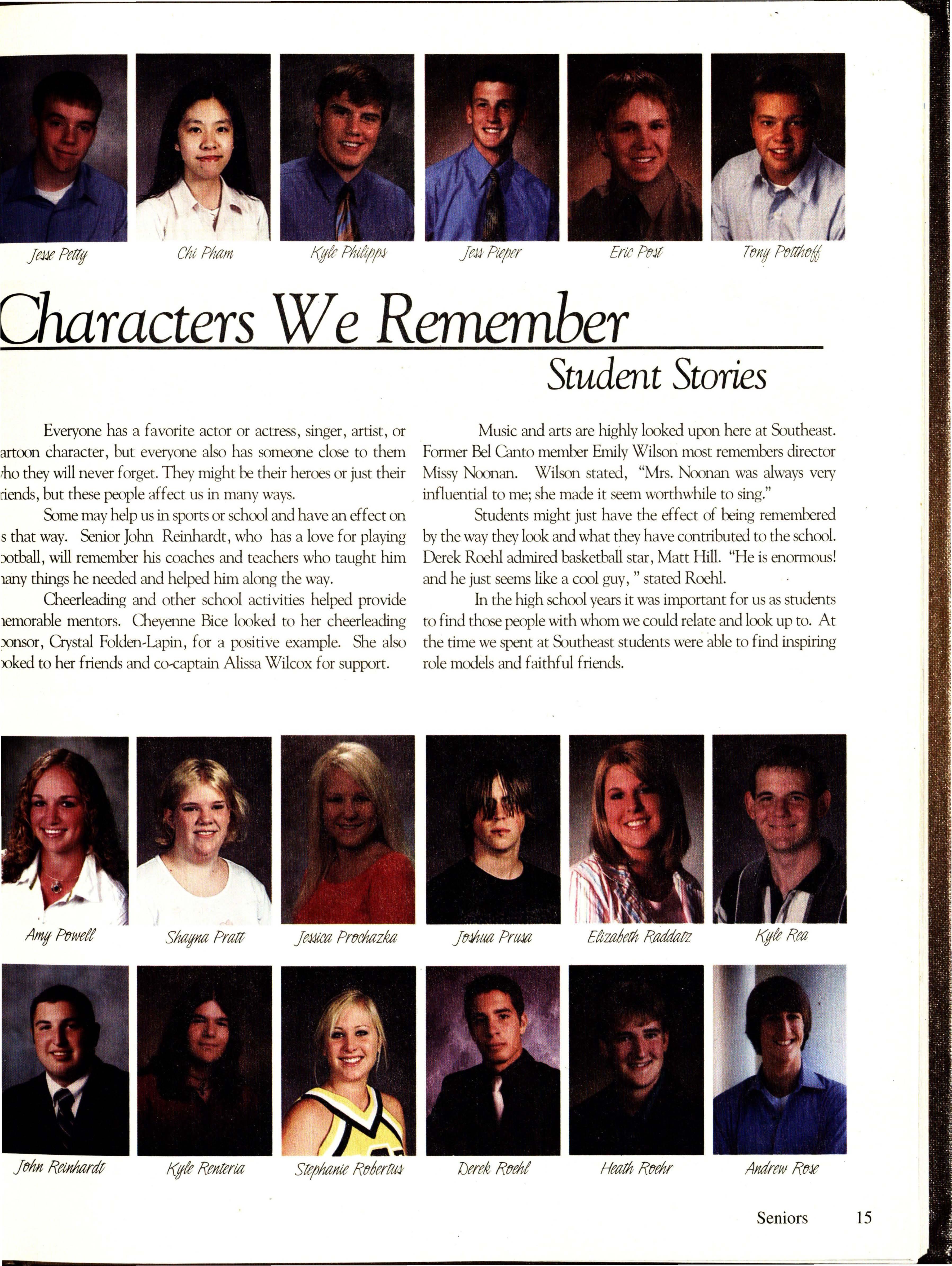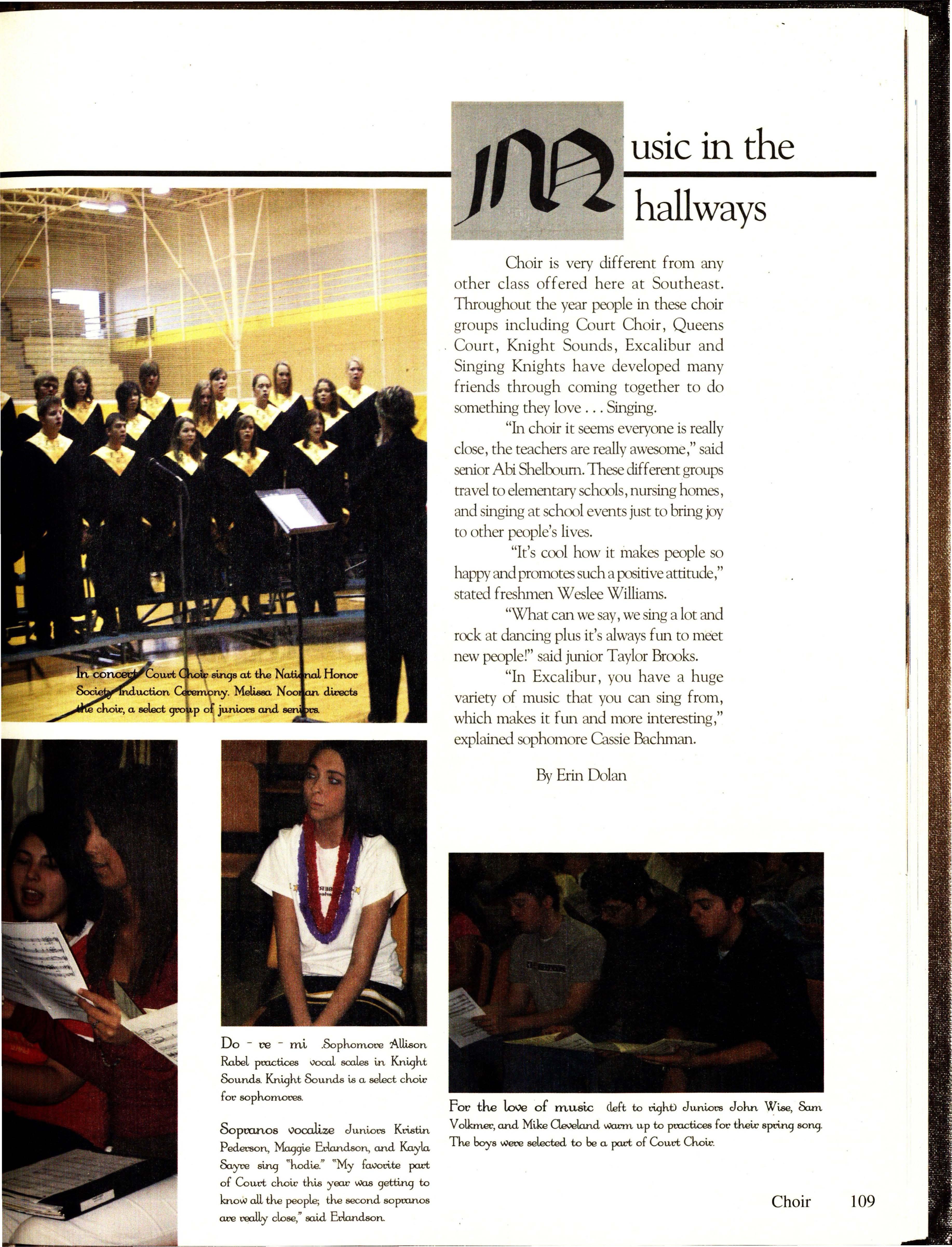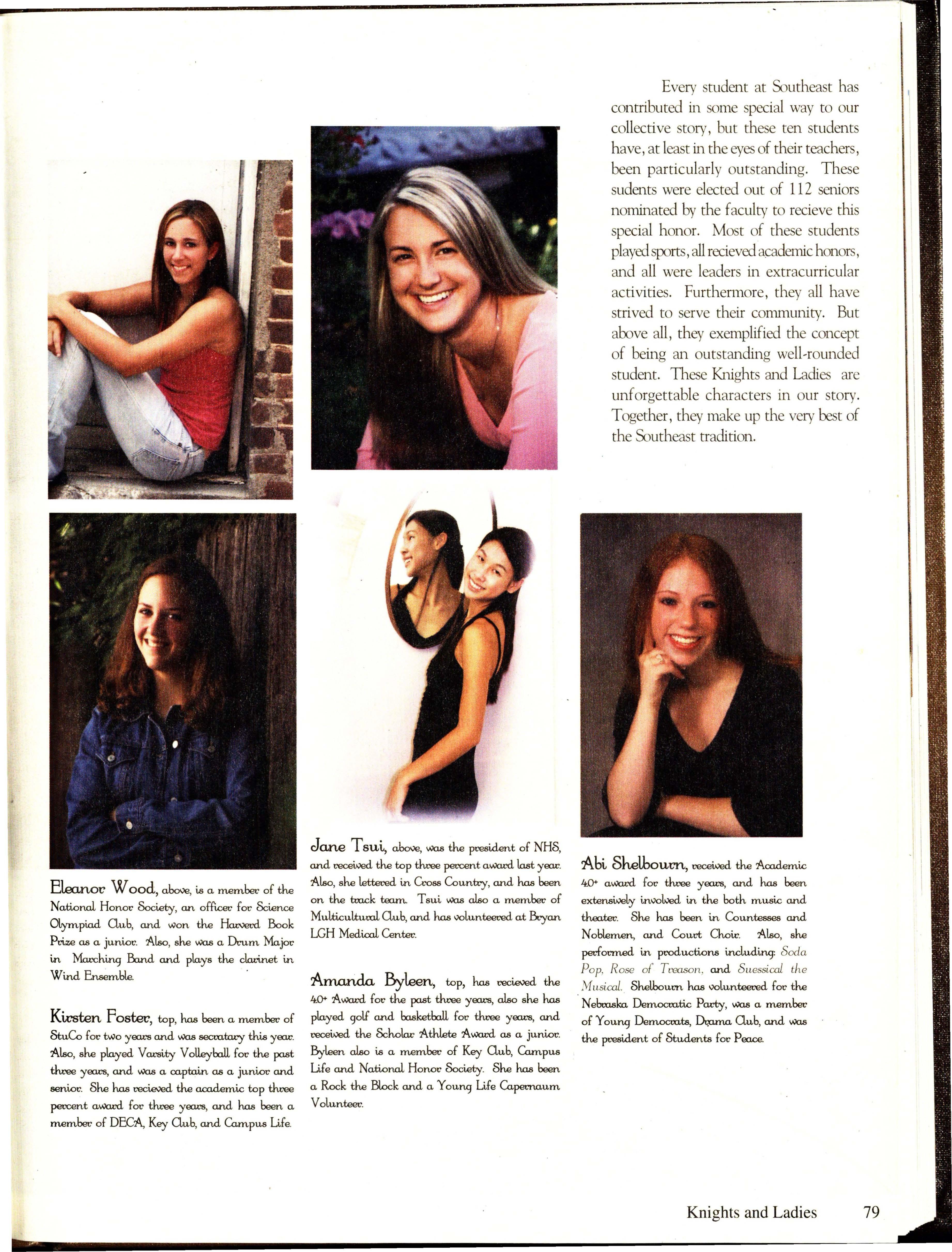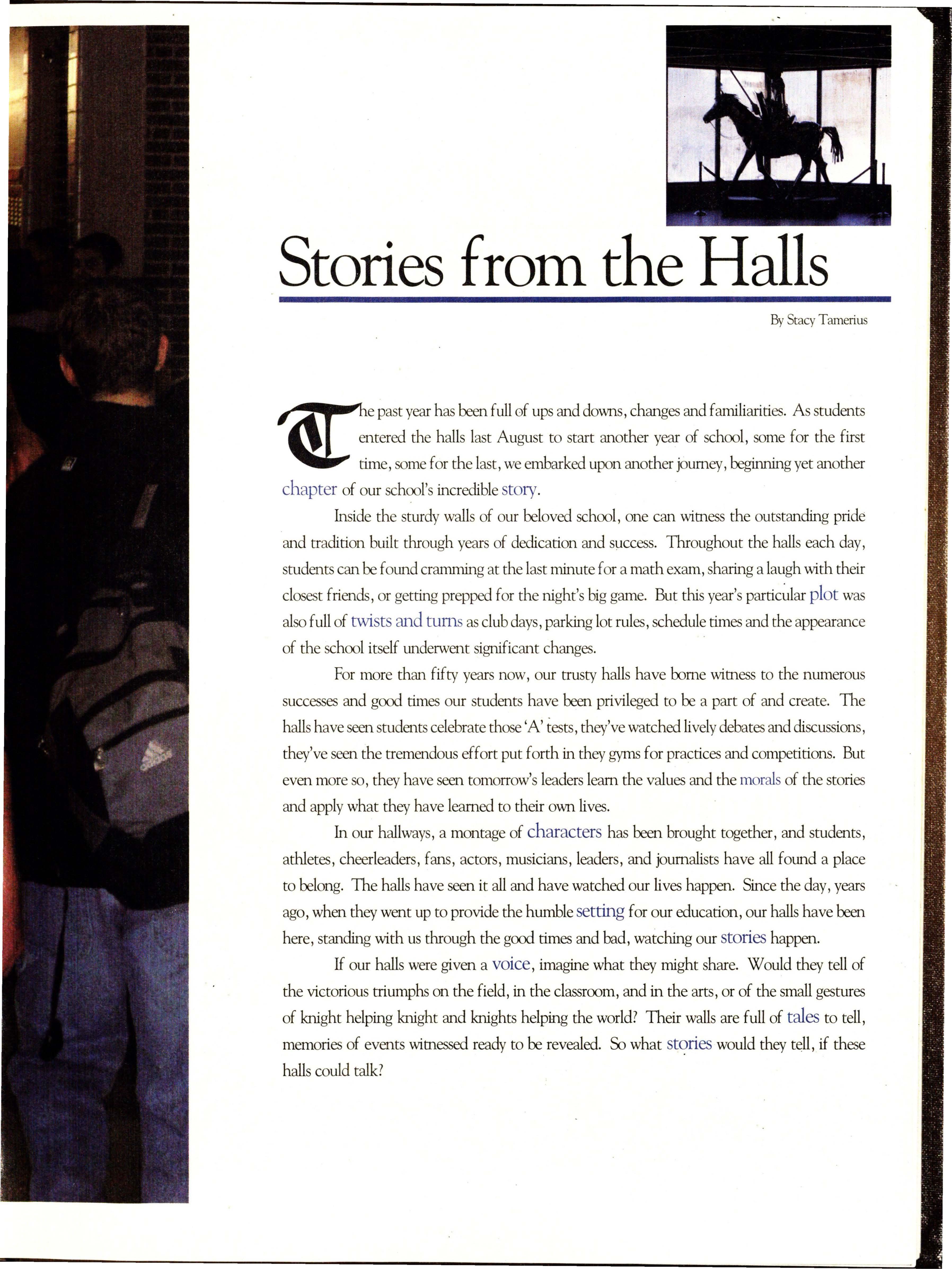 e halls have spoken to us loudly and clearly of what it means to be a Knight, sharing the moments most memorable of the past year. As students at Southeast we can be proud of the memories we take with us and the legends we leave behind. The friendships we have formed within the walls of our school and the knowledge we have gained while we are high school students, though unique to each separate character of the overall tale, is something not to be forgotten. But Southeast's story is not yet finished, it is waiting to be continued by the future generations of Knights. All those who come after us are anxious to continue the tradition of excellence and create their own installments . Our story has always been one focused around years of tradition, decades of excellence, and dedication to service. This year has been no different.