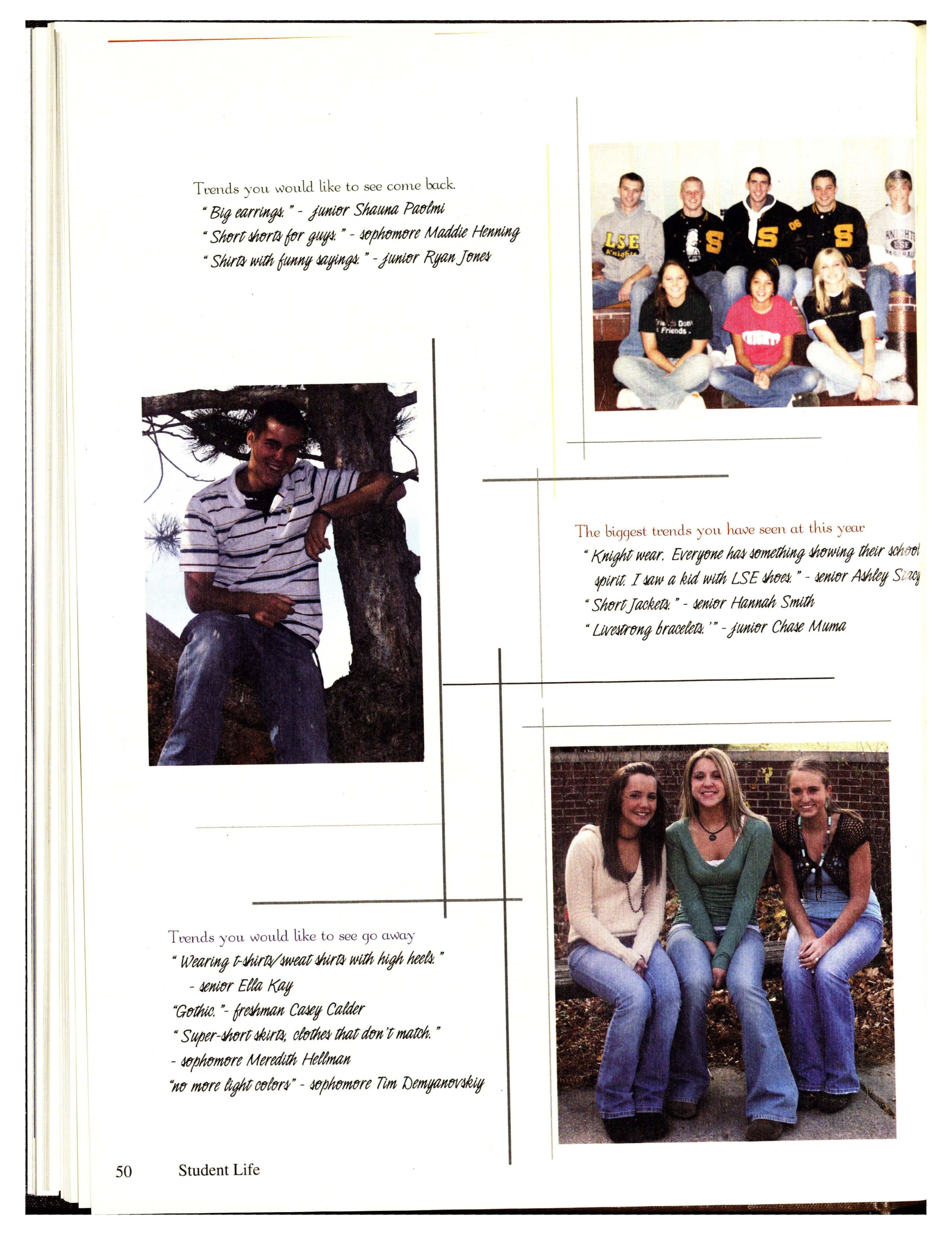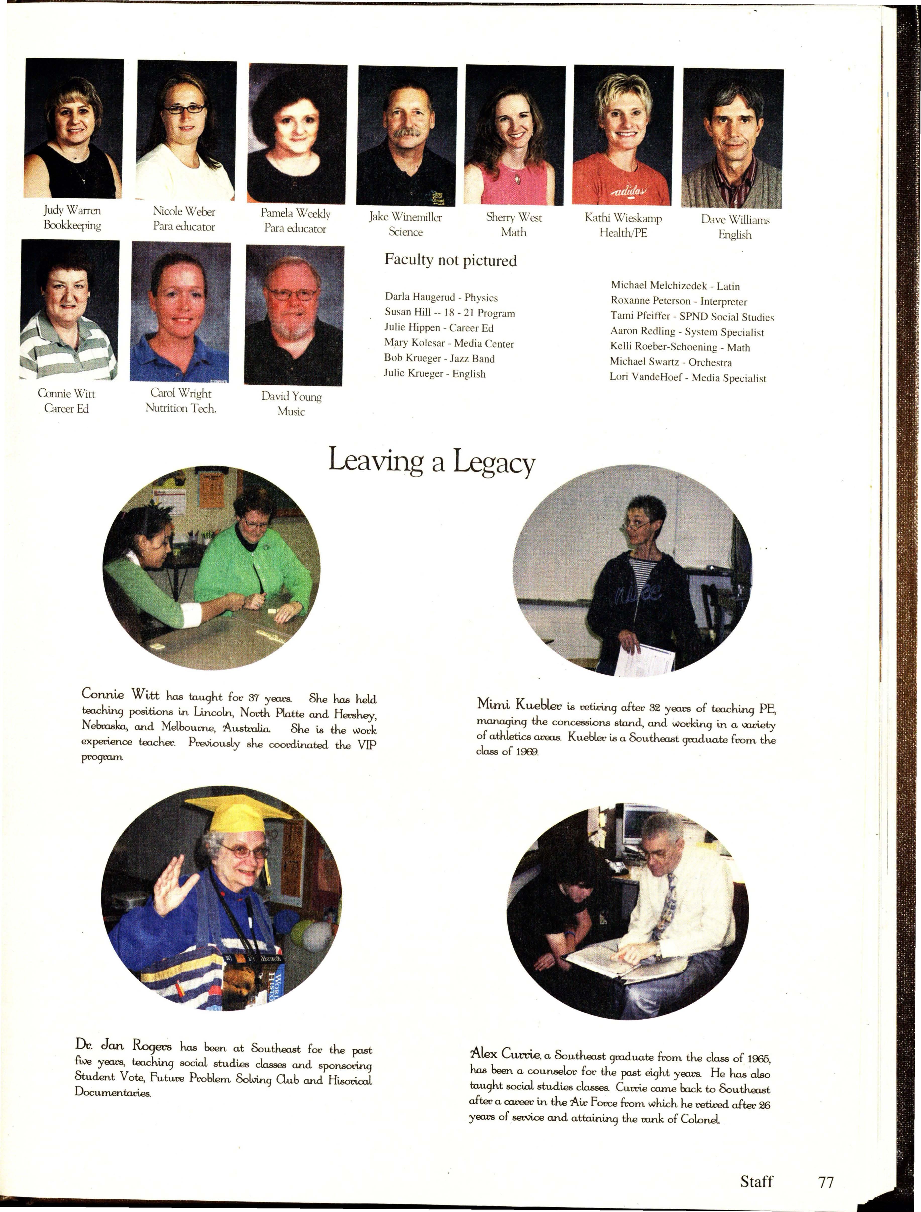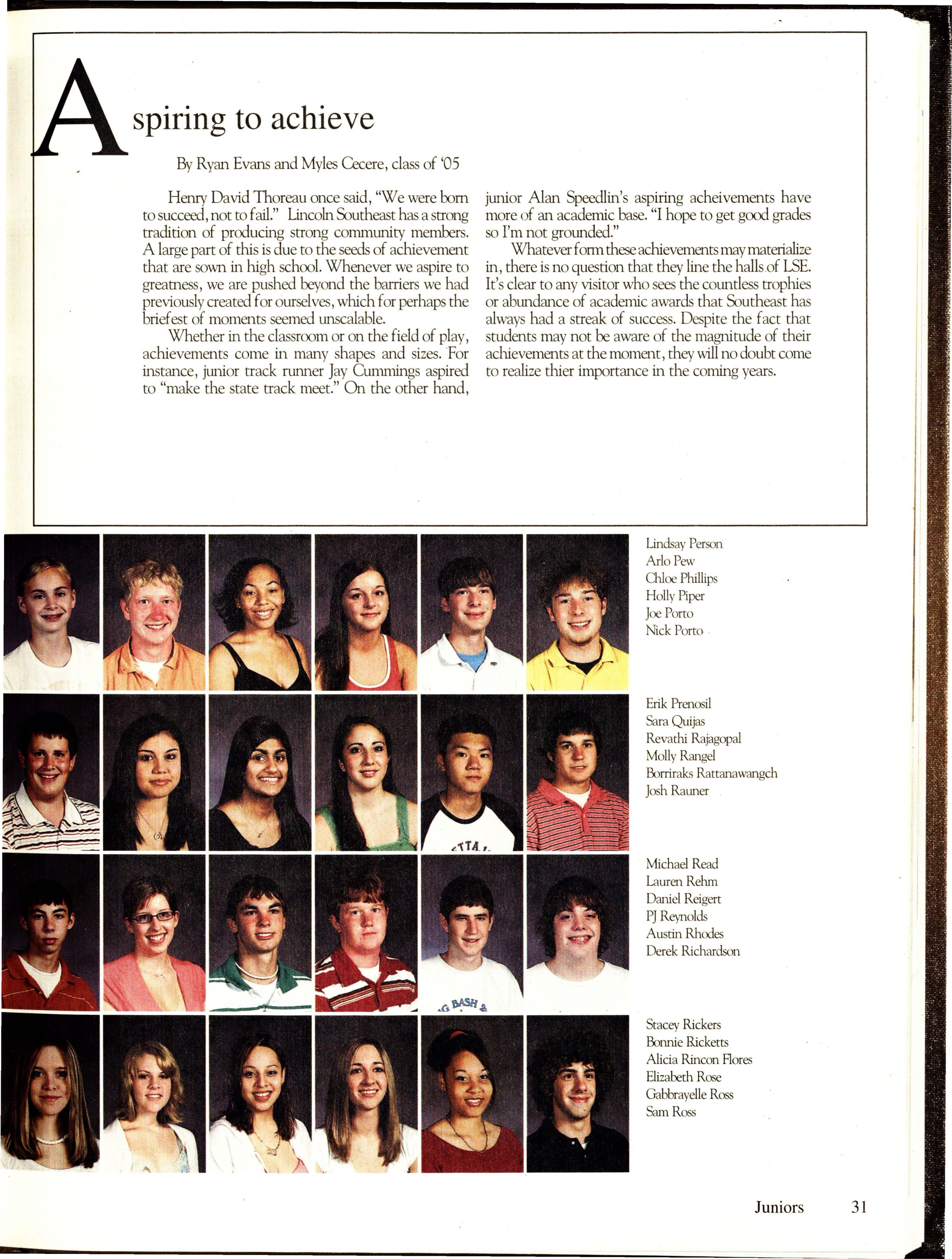 Clu Pltam TtM!f PfJtlMff J&J4if1a Pmdtazka JfJnn Ret!tltttrdf Kflt RenftridThe passing of this year's senior class marks the end of an era for Lincoln Southeast. For four decades, from the 1963 opening of Pound Middle School to the 2003 opening of Lincoln NorthStar, Southeast hosted students in grades 10 throu gh 12. After NorthStar opened, along with Lincoln Southwest the year before, all LPS high schools went to grades 9 through 12. The Class of 2006 is the last class to start "high school" as sophomores. Southeast's Class of 2006 is unique in another way , it is the smallest since 1963 when only 3 21 students comprised the graduating class. As of the end of first semester, there were 351 seniors enrolled at Southeast. The small numbers are a result of the two new high schools being built to relieve overcrowding. Prior to 2003, graduating classes were frequently around 600. In fact, the largest graduating class ever was the Class of 1999 which had 690 students,, nearly double the size of the Class of 2006.