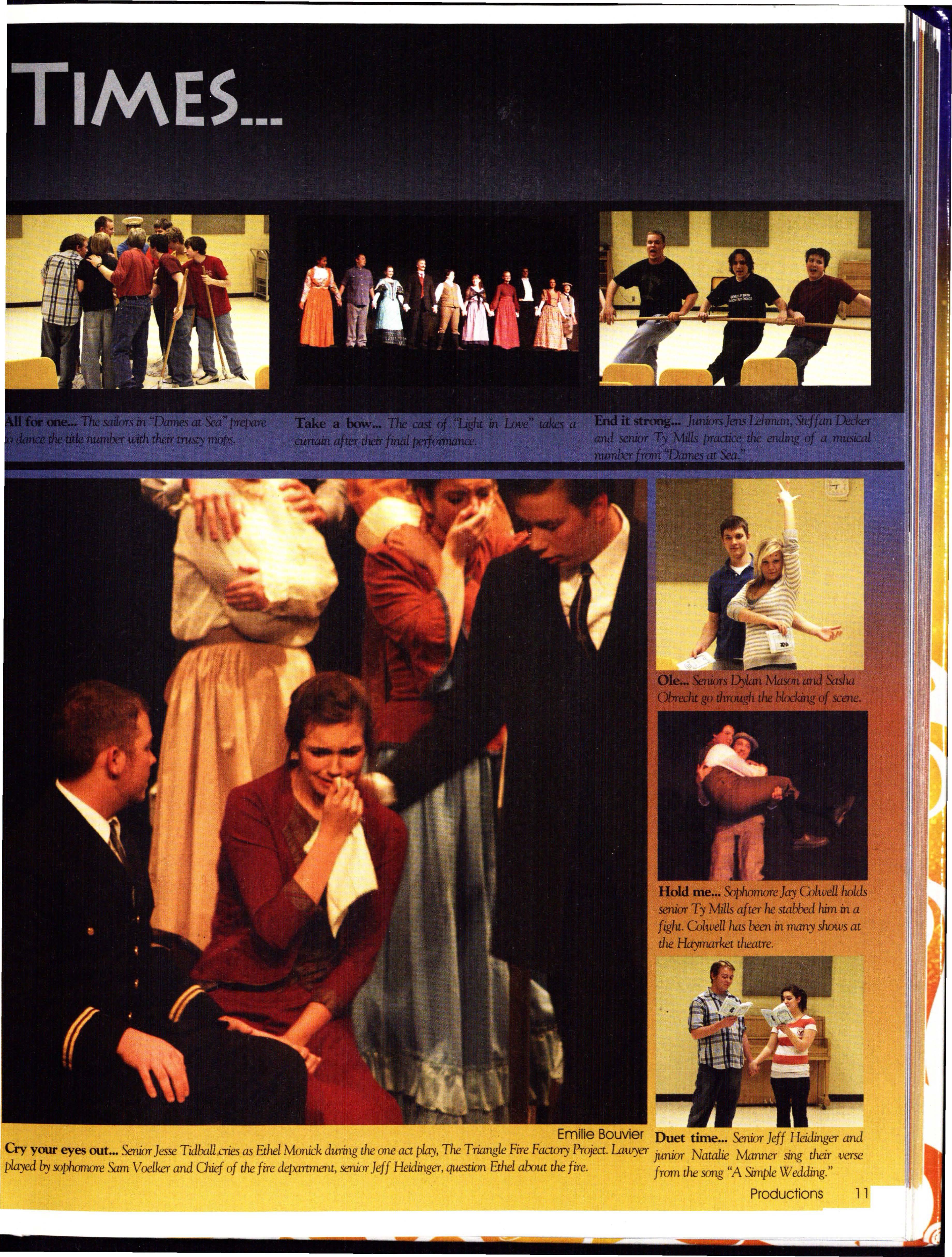 Emilie Bouvier Duet time... Senior Jeff Heidinger and Cry your eyes out... Senior Jesse Tidball.cries as Ethel Manick during the one act play, The Triangle Fire Factory Project. Lawyer junior Natalie Manner sing their verse played by sophomore Sam Voelker and Ouef of the fire department, senior Jeff Heidinger, question &he.I about the fire. from the song "A Simple Wedding."