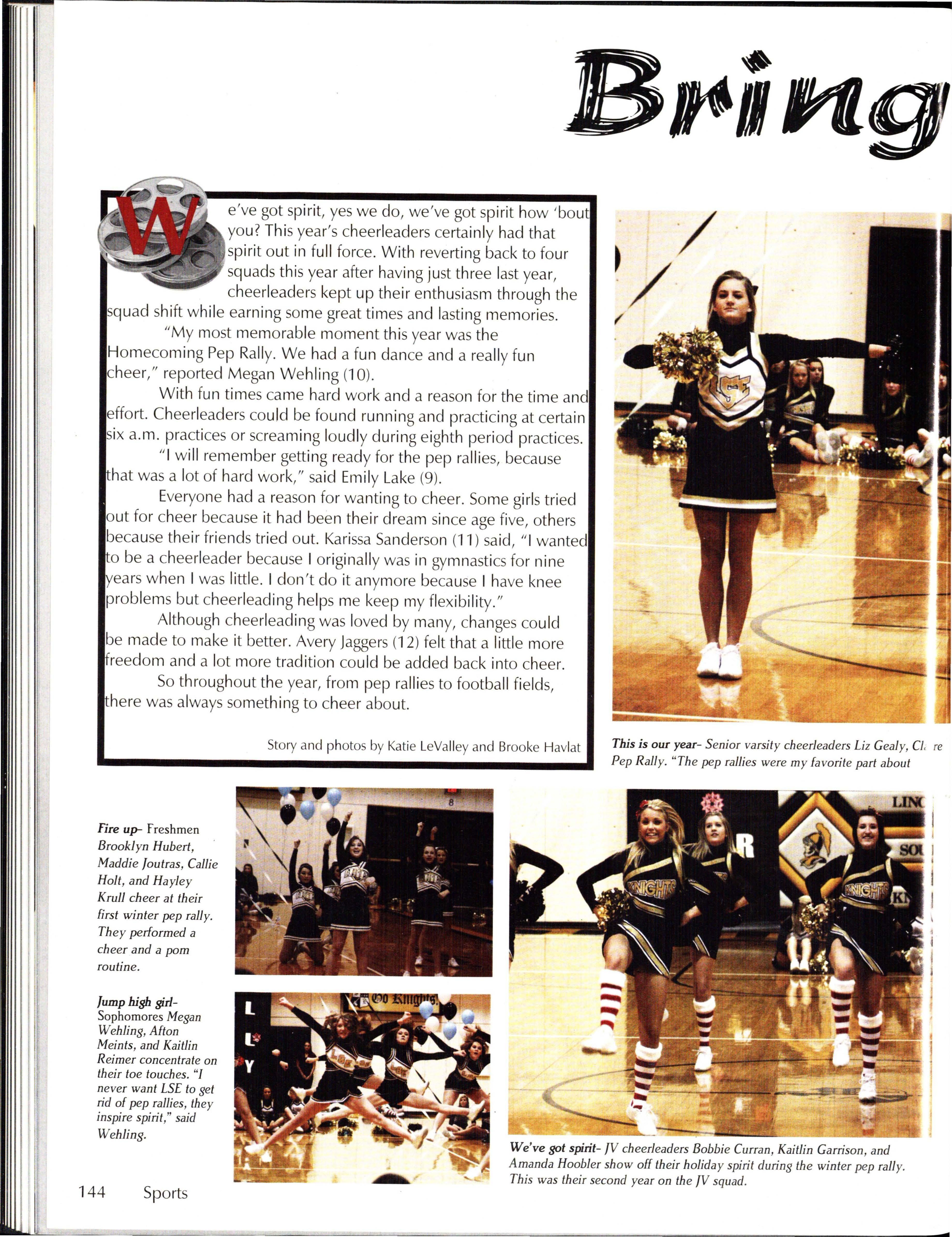 J. Jump, yell, cheer/- Seniors (left to right) Claire Eckstrom, A very assers, Liz Gealy, Brooke Havlat, Shelby Fleig, Julie Otte and Katie Vorhies are this year's Varsity cheerleaders. At the Homecoming ipep rally they pumped up the students and the teachers in the crowd